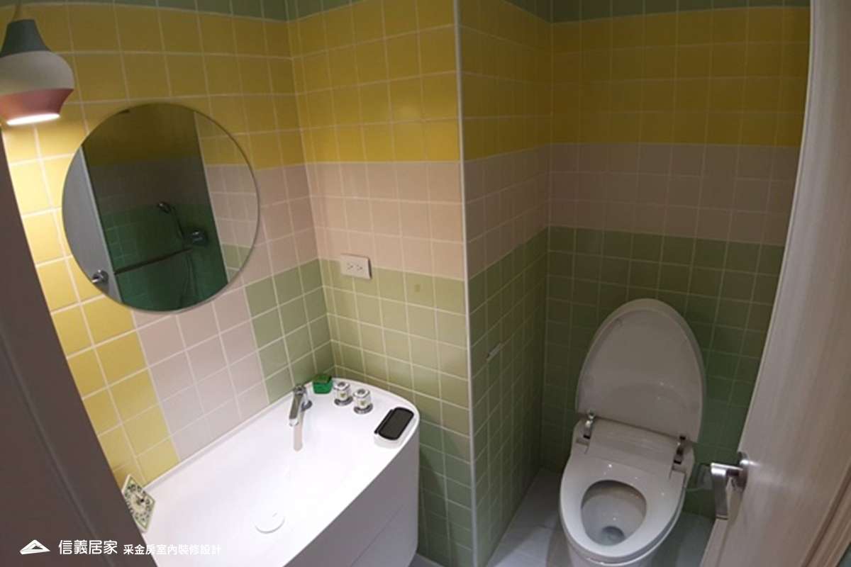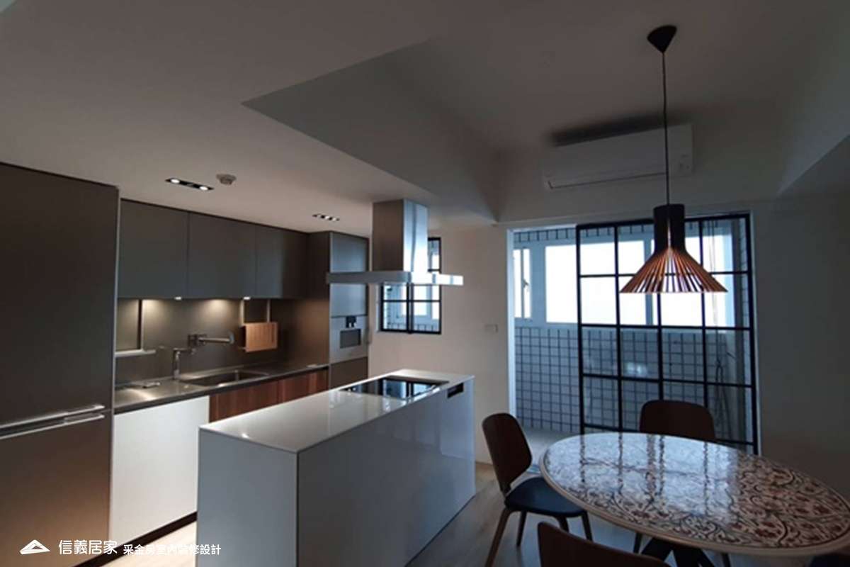 此為30年以上的中古屋規劃,為呈現基地方正且採光明亮,主臥及客廳可以看見101的優點,采金房團隊保留原本格局,僅更動餐廳及廚房之間的隔間牆,將整個公共空間打開,使採光更加明亮
