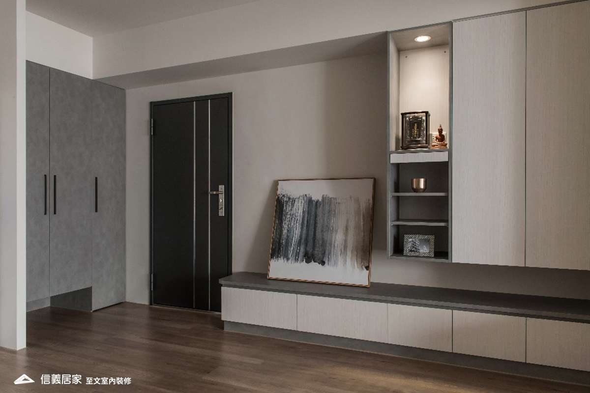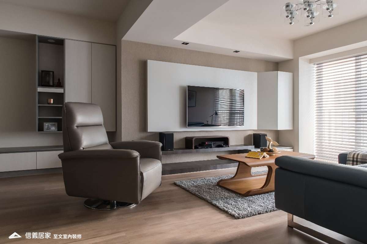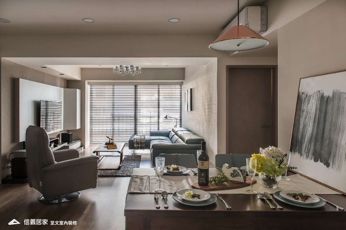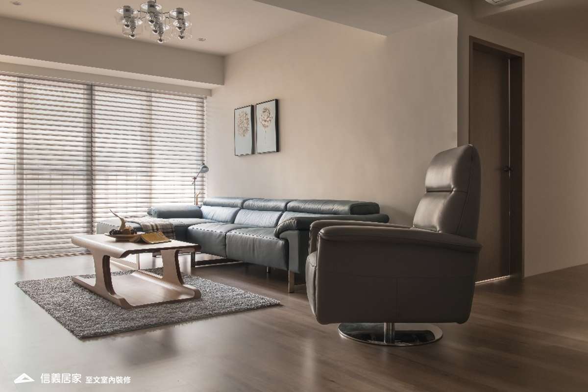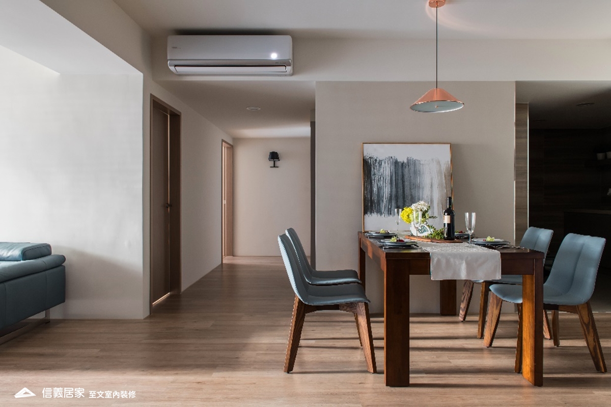 單身的屋主喜歡木紋質感跟簡約風格,至文室內設計運用柔和的色調,以淺色系及灰色作為基礎,與木紋質感混搭,賦與40年老屋新風貌。整體空間簡單俐落,卻不失沉穩大器,符合男主人內斂氣質,也帶出獨特的生活品味。