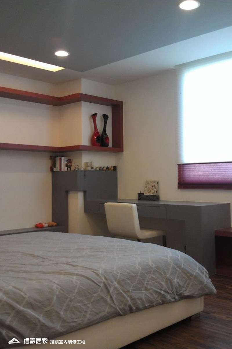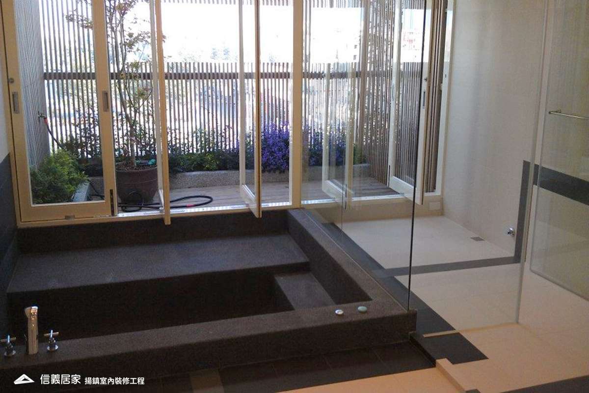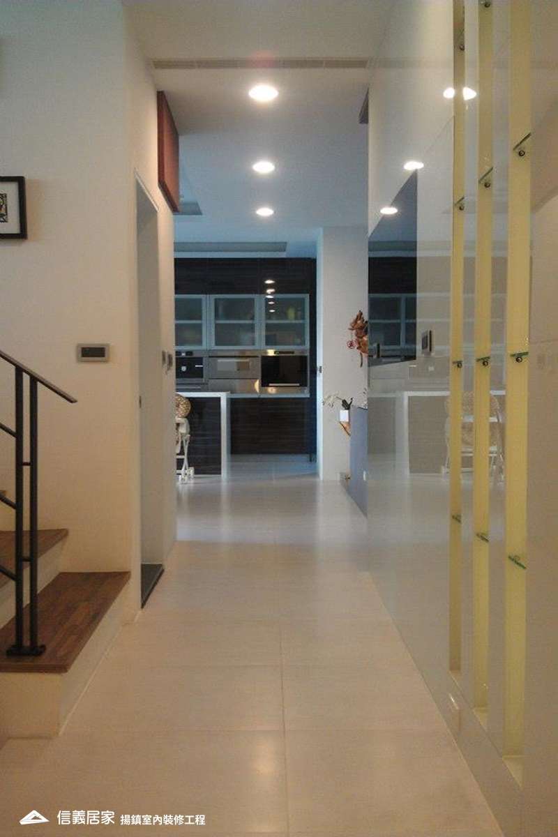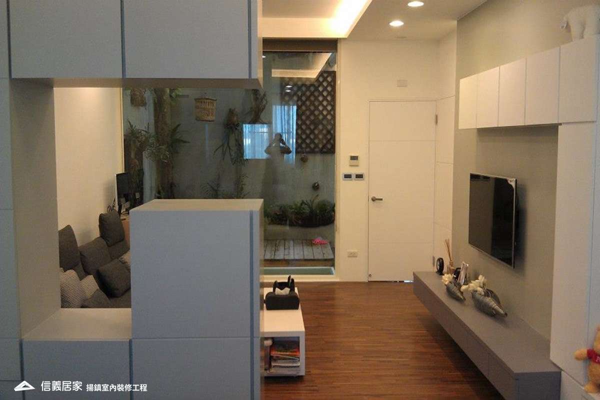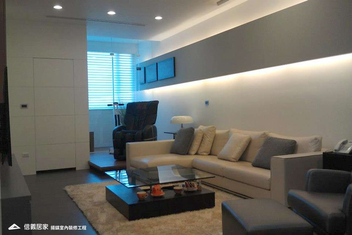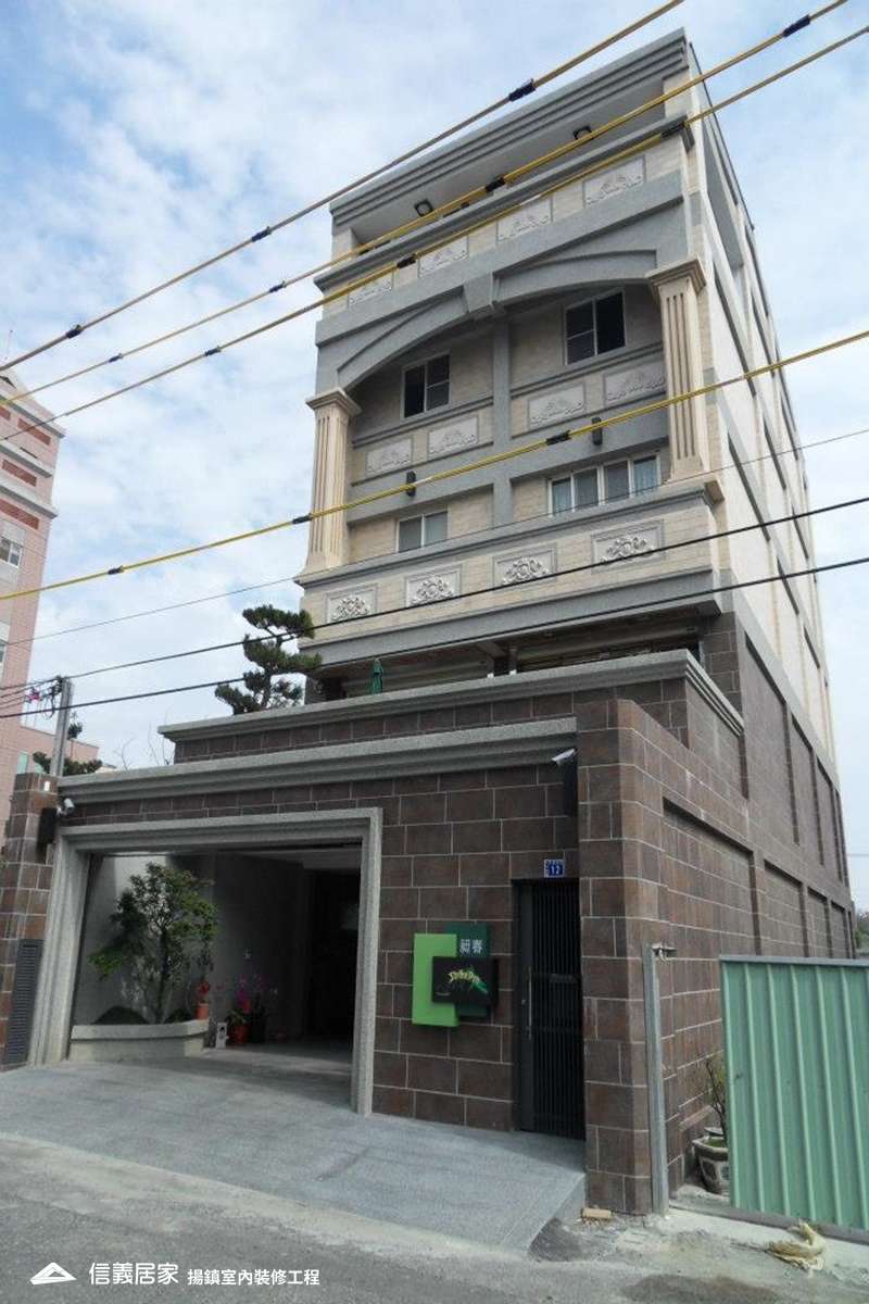 座落於彰化和美的雙棟透天厝,屋主希望建物外觀可呈現一體成型、簡約為重,於是揚鎮將屋前庭院的區塊打通,並運用深淺色板岩搭配建物外觀。
