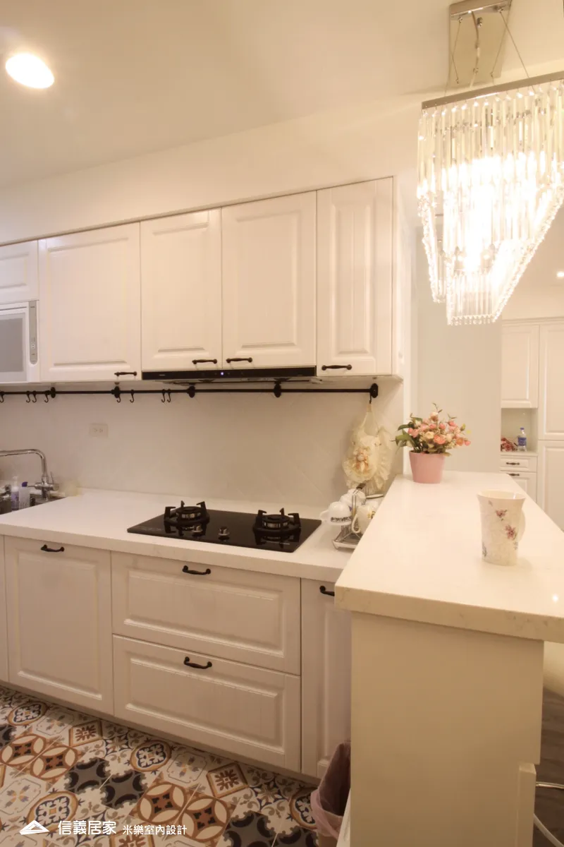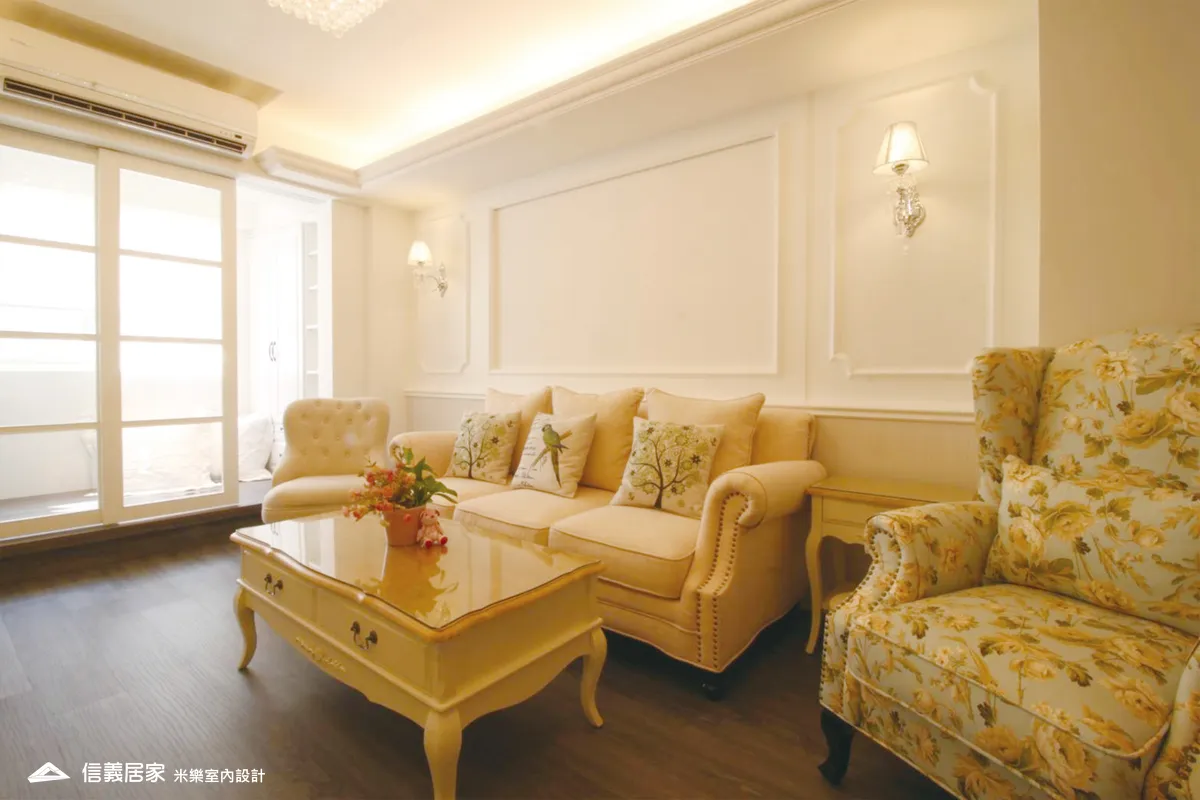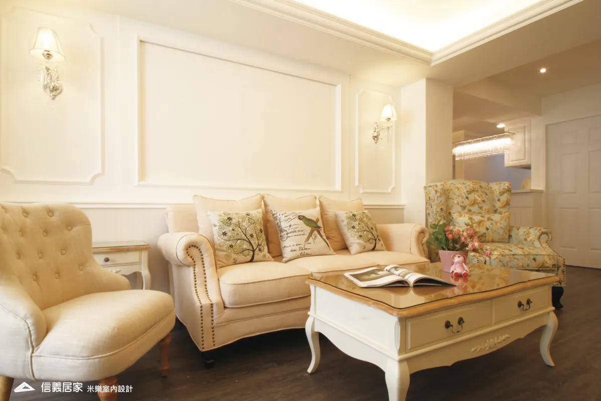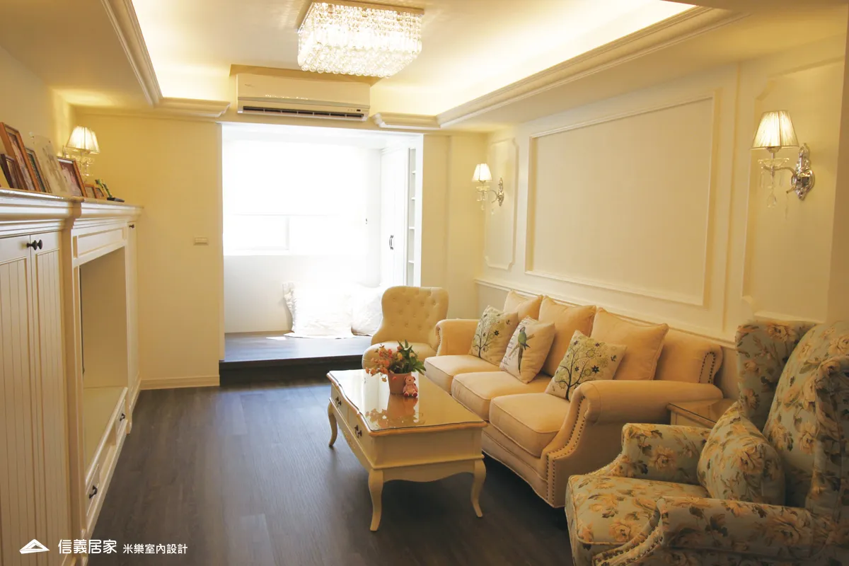 本案以美式鄉村風打造甜蜜小情人的居家空間,透過米色系與木質家具營造自然溫暖氛圍,結合小碎花、格子窗、線板等經典元素,展現自由隨性的生活美學。客廳以奶油色調與布藝沙發為主軸,搭配水晶燈與收納設計,實現優雅與舒適並存的理想生活場景。