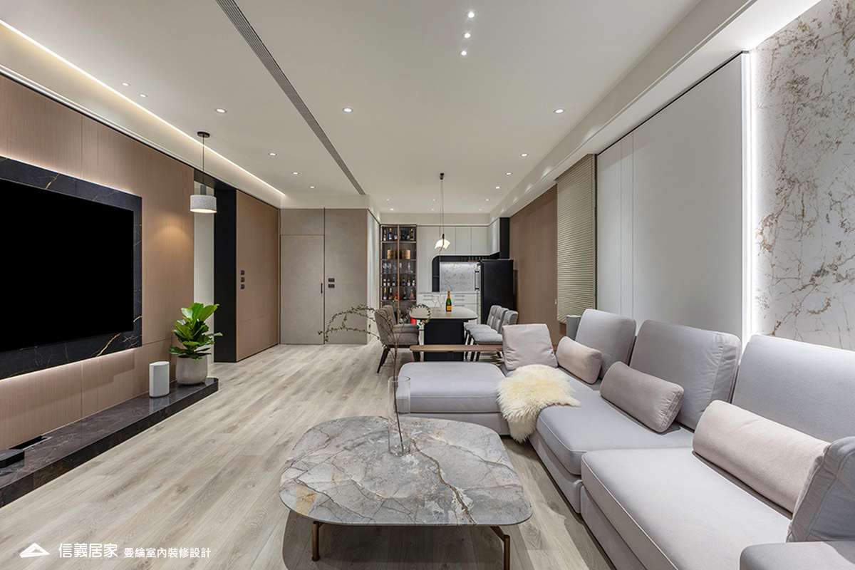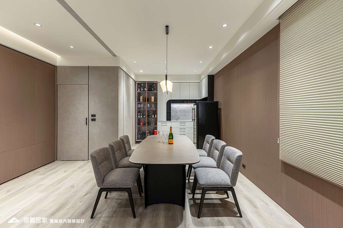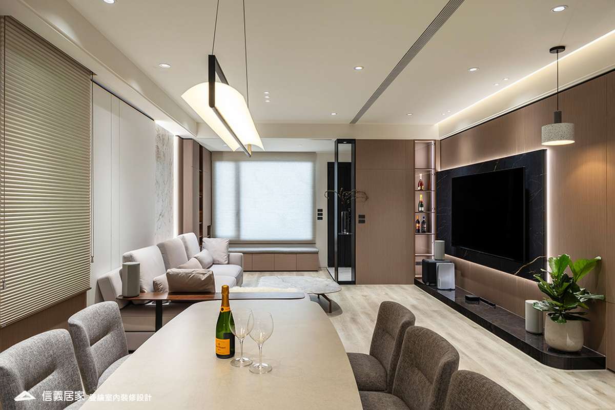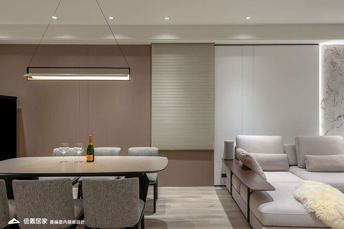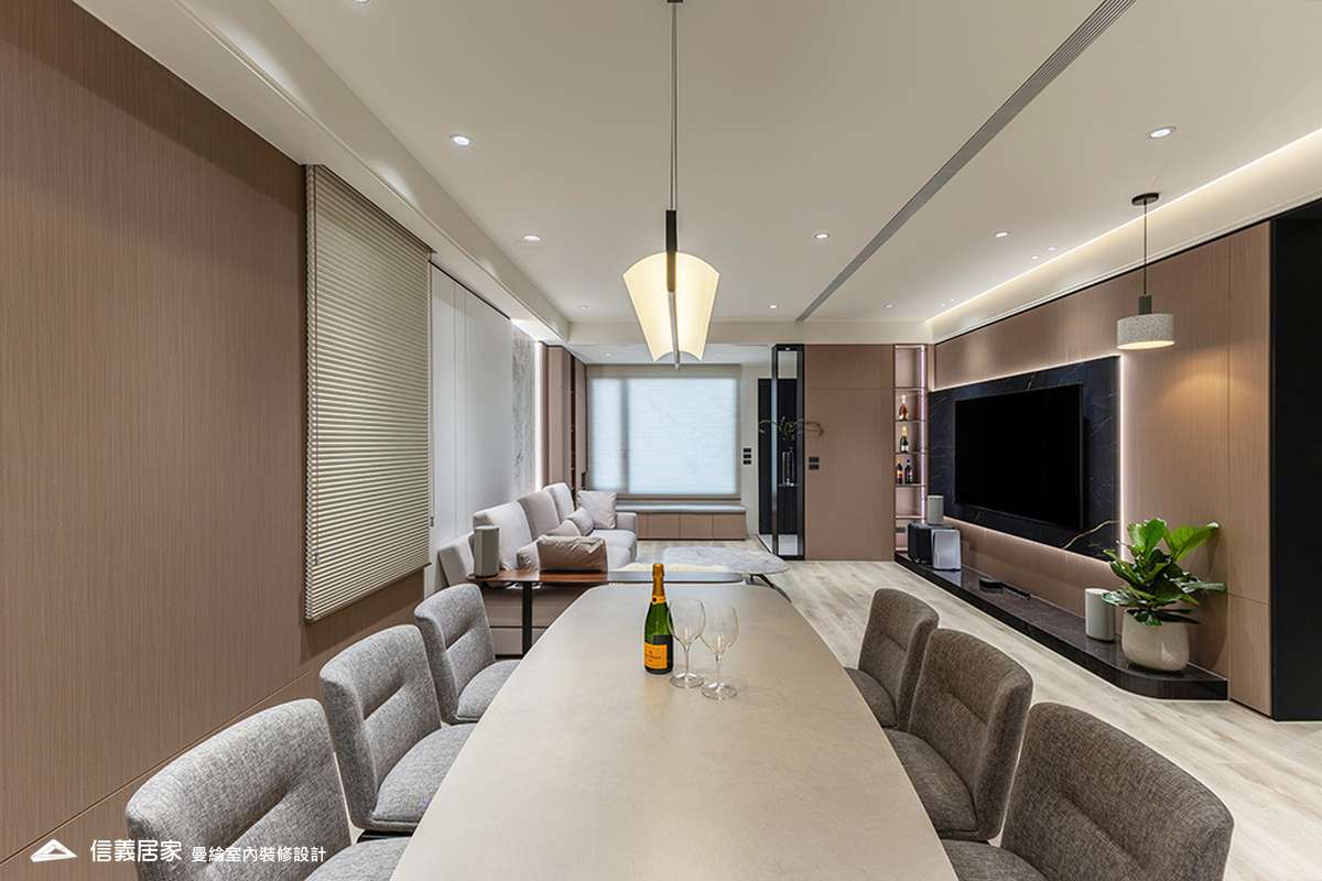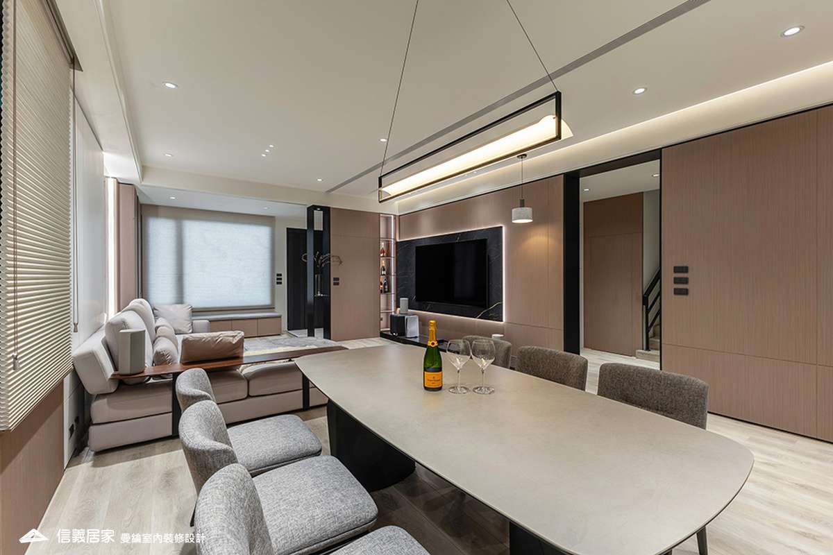 整體空間以柔和中性的色調為基底,搭配大量木質肌理與霧面材質,營造出溫潤靜謐的氛圍;客廳與餐廳採開放式配置,營造出流暢的動線,並透過隱藏收納、燈光層次與異材質拼接,精緻詮釋家的溫度與質感。