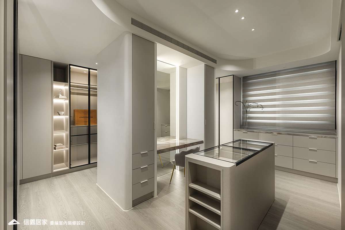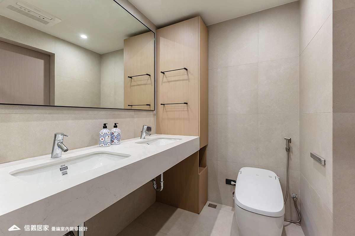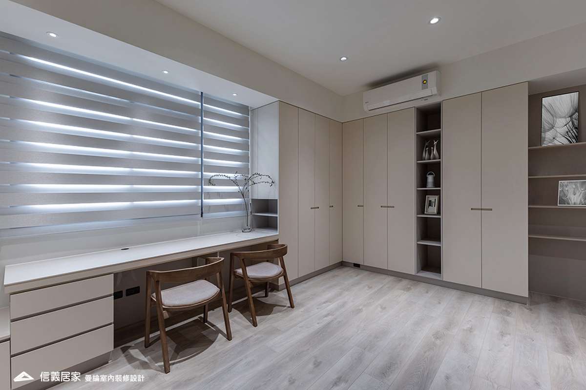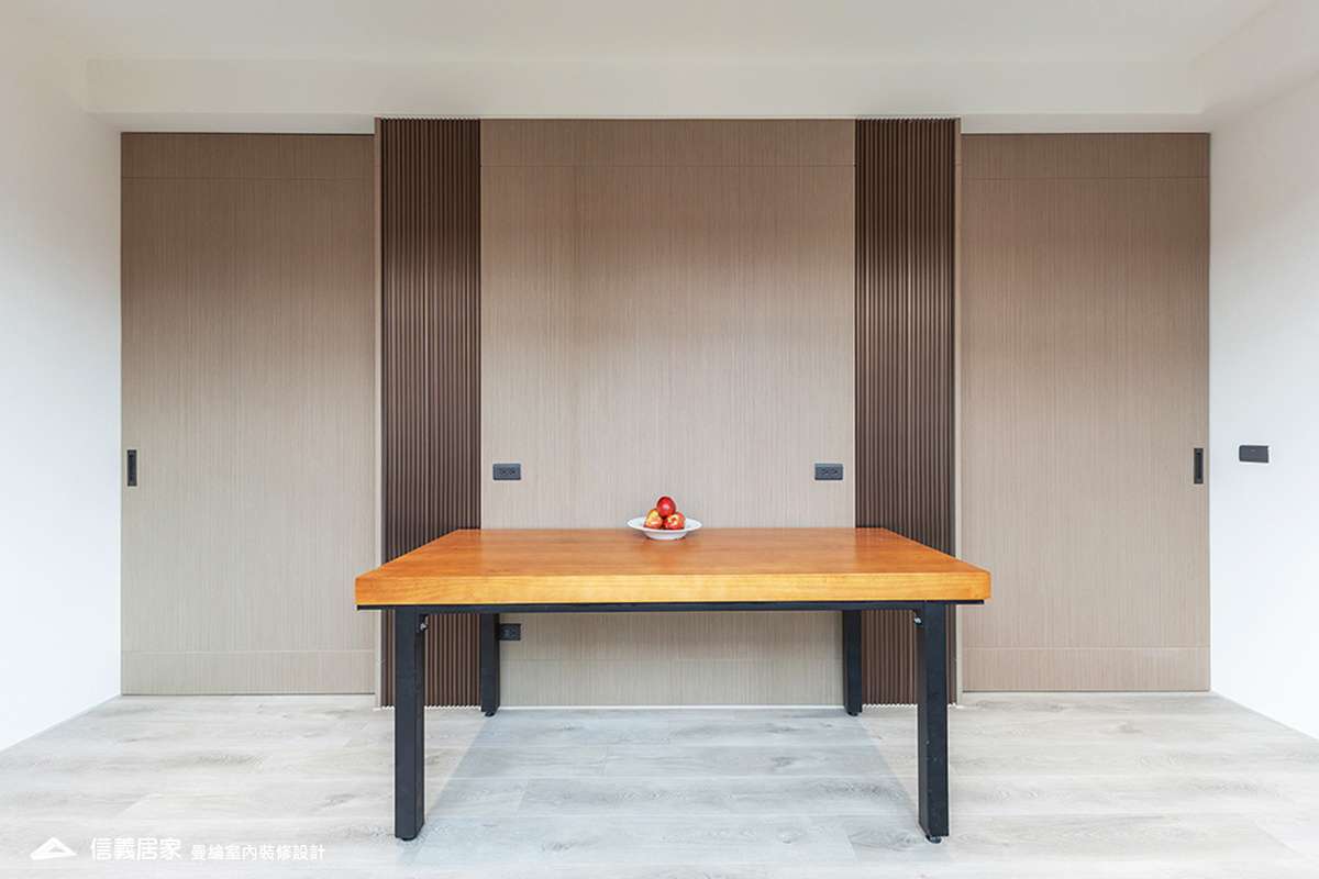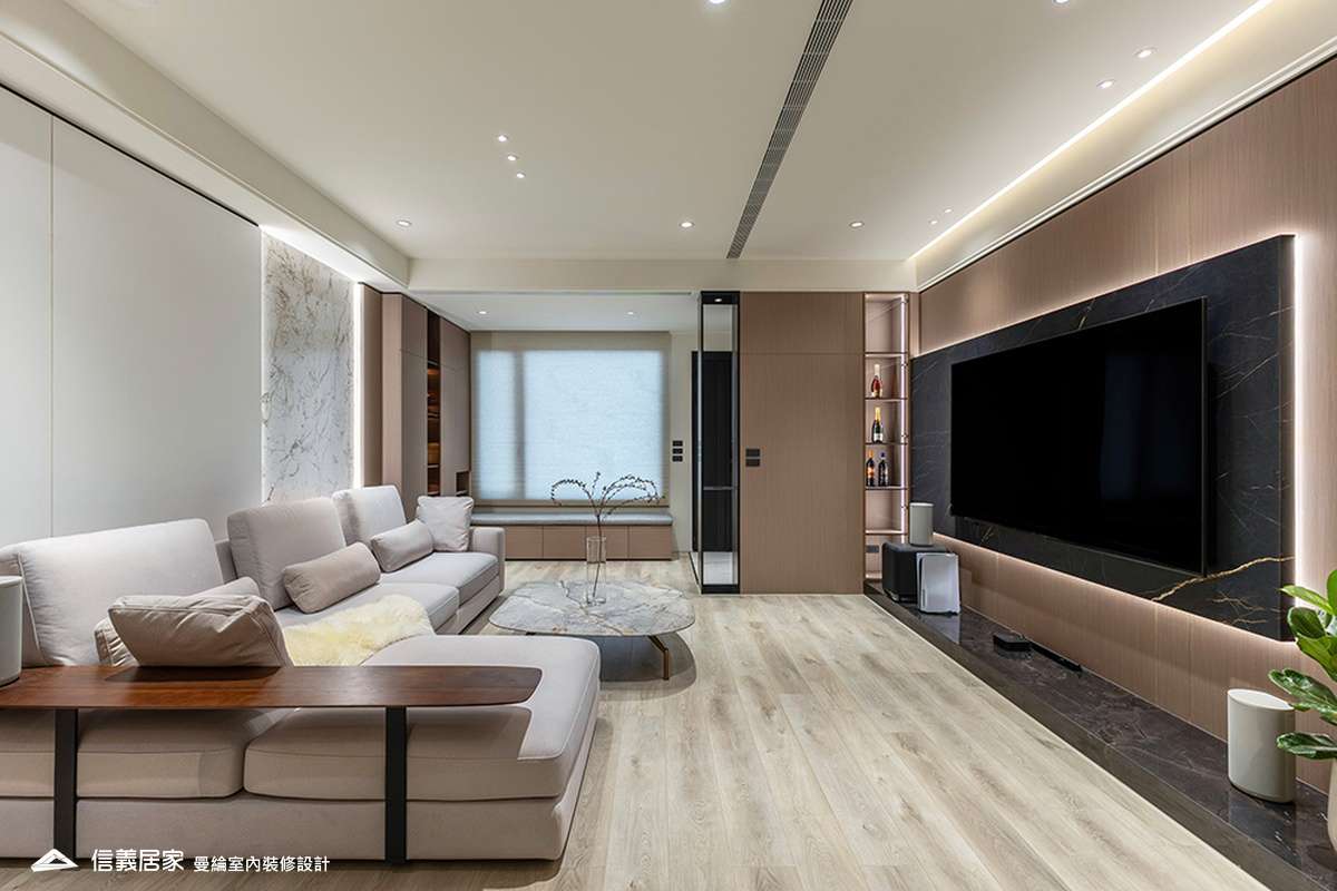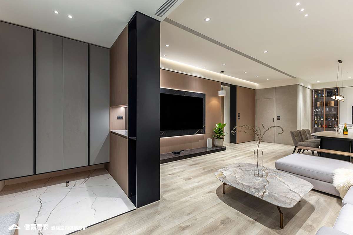 整體空間以柔和中性的色調為基底,搭配大量木質肌理與霧面材質,營造出溫潤靜謐的氛圍;客廳與餐廳採開放式配置,營造出流暢的動線,並透過隱藏收納、燈光層次與異材質拼接,精緻詮釋家的溫度與質感。