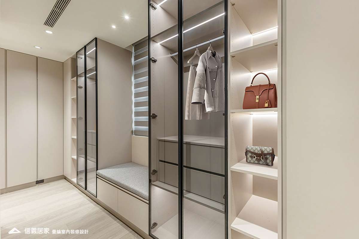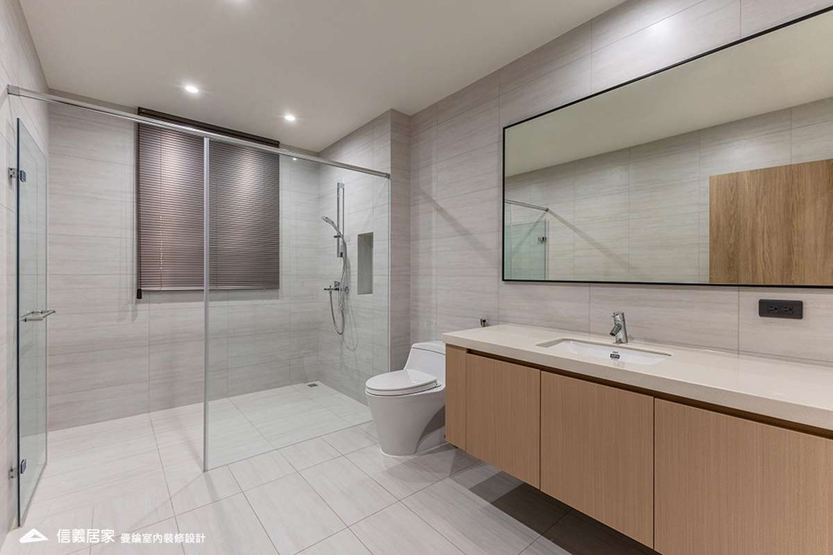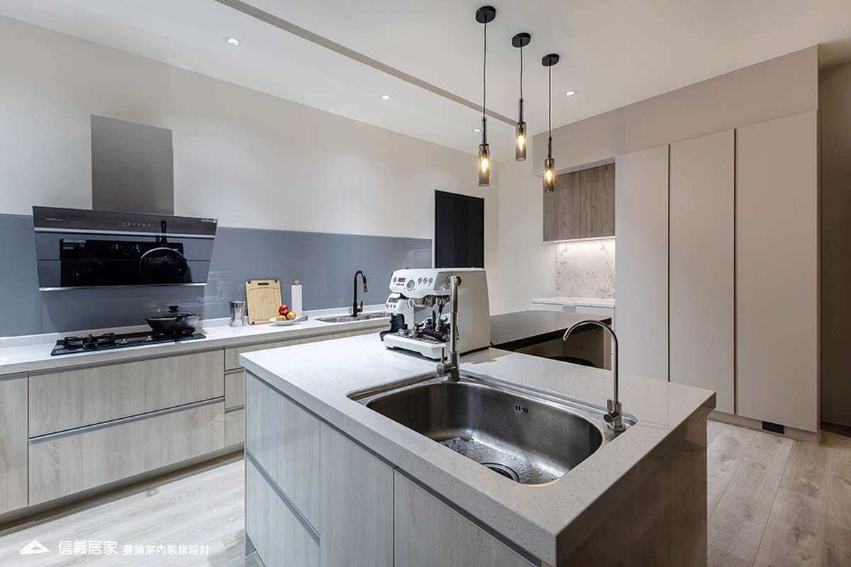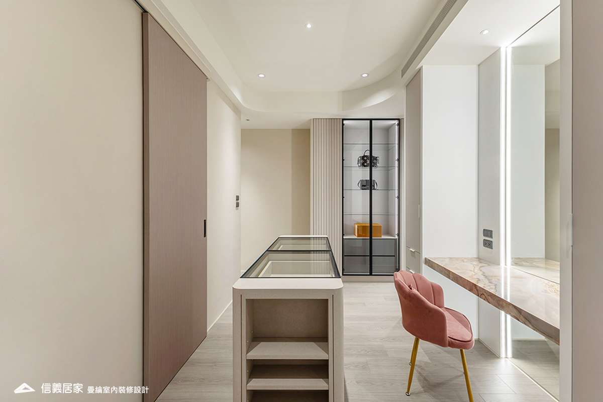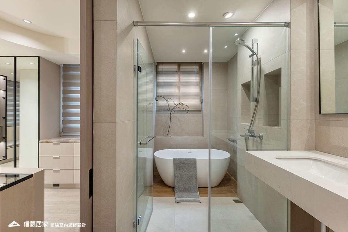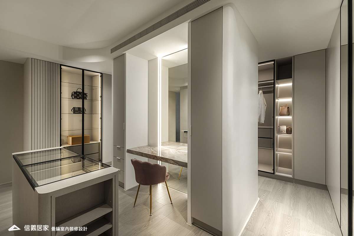 整體空間以柔和中性的色調為基底,搭配大量木質肌理與霧面材質,營造出溫潤靜謐的氛圍;客廳與餐廳採開放式配置,營造出流暢的動線,並透過隱藏收納、燈光層次與異材質拼接,精緻詮釋家的溫度與質感。