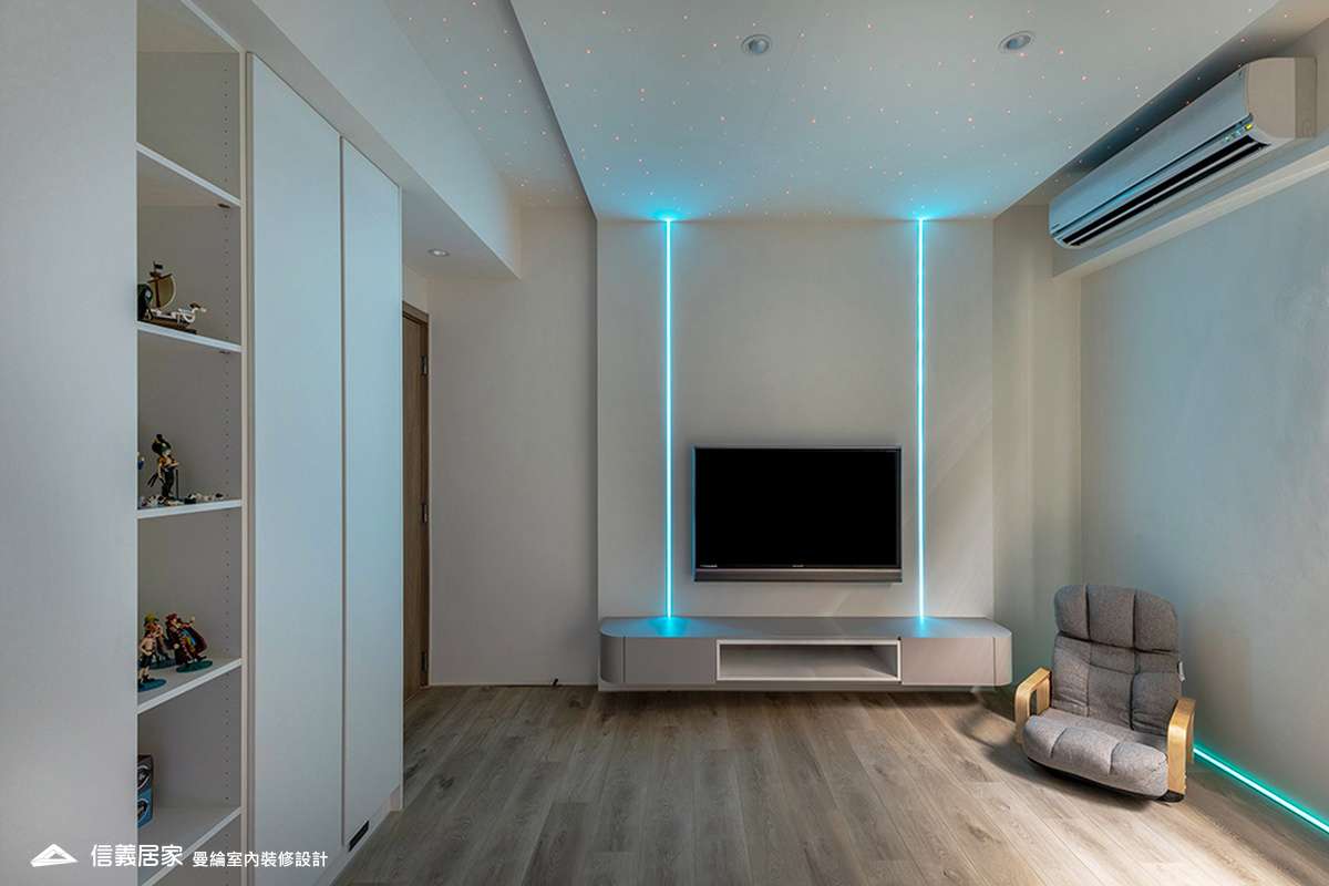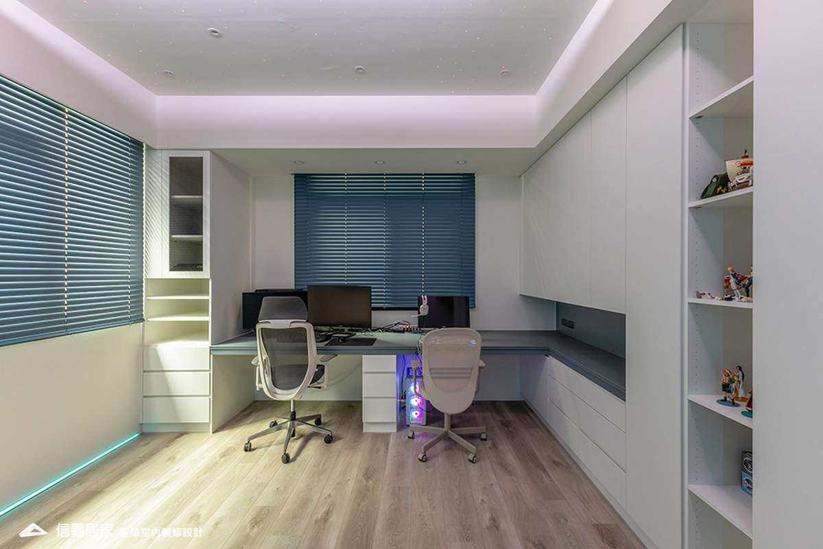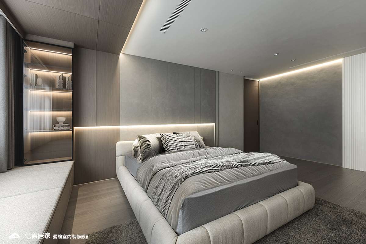 主臥空間延續同樣語彙,利用大面窗景與簡潔立面,引光入室,配合間接照明與低彩度軟裝,營造出放鬆寧靜的休憩環境;設計巧思延伸至電競房,以星空頂作為視覺亮點,在冷靜的低彩度色系中注入趣味與個性,展現屋主對生活品味的堅持,整體設計在極簡之中蘊藏層次細節,實現美感與機能兼容的當代居家想像。