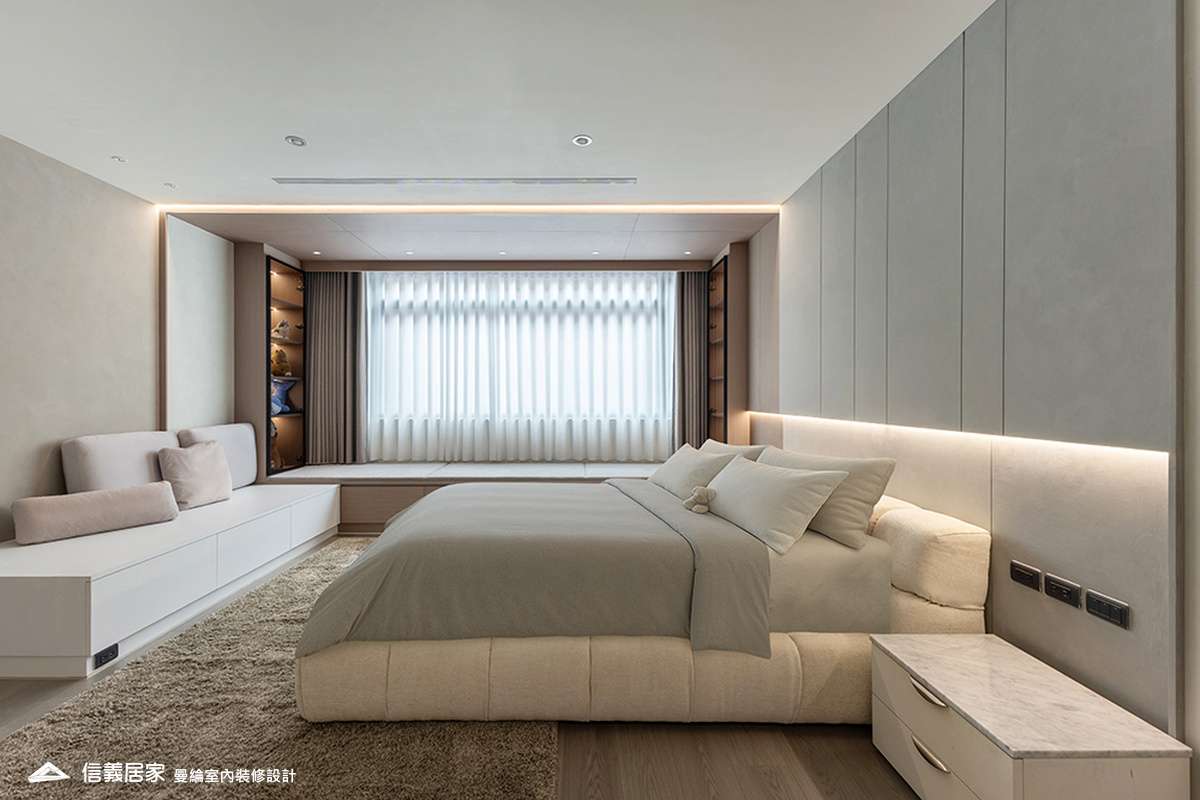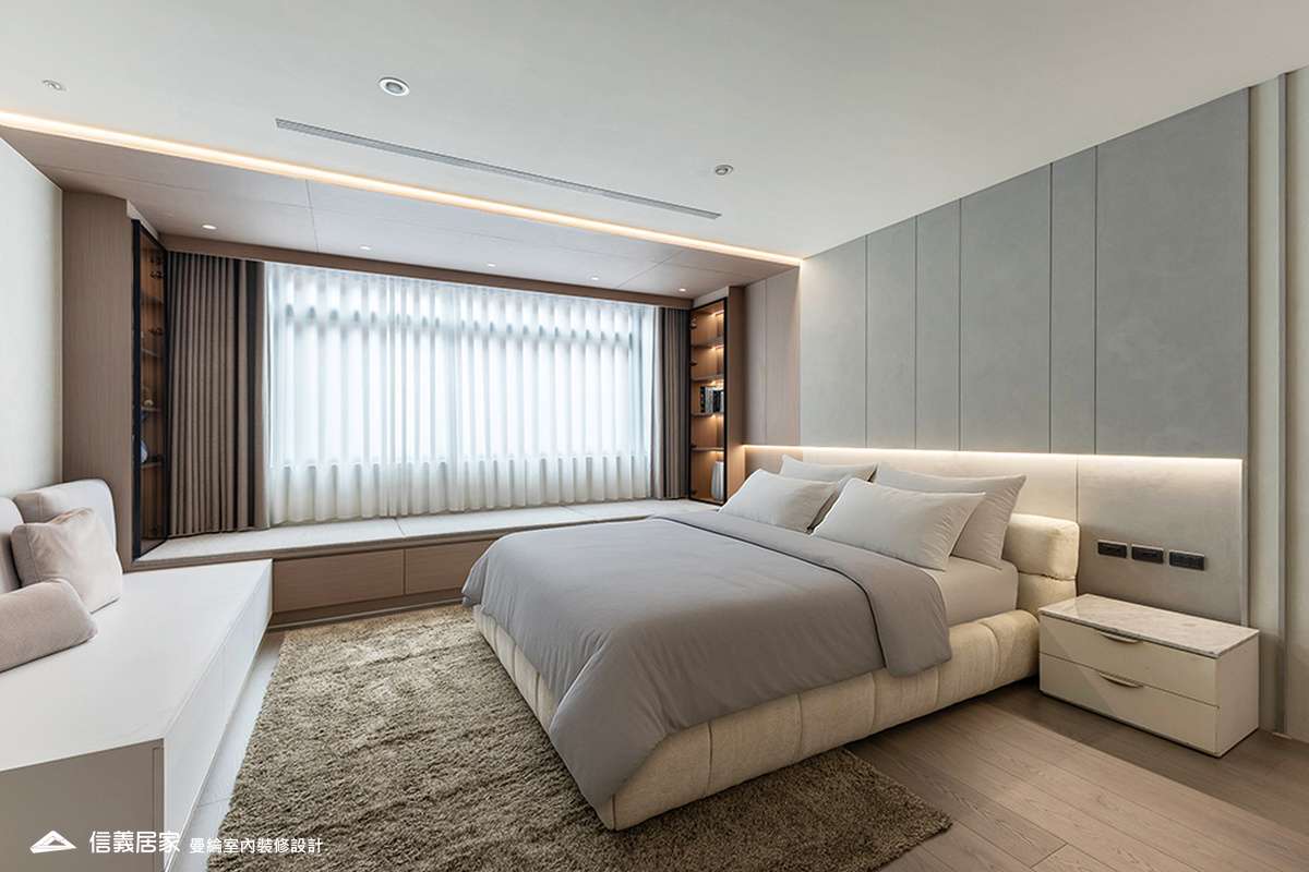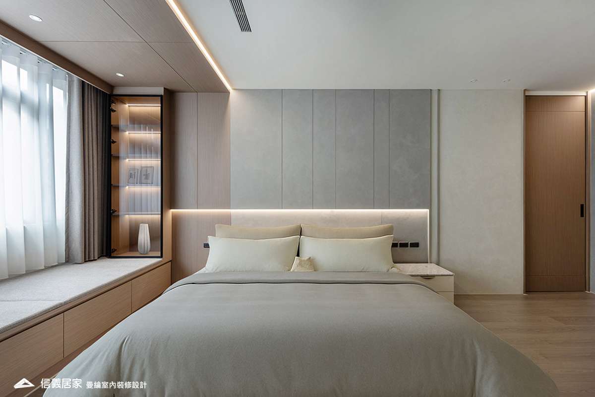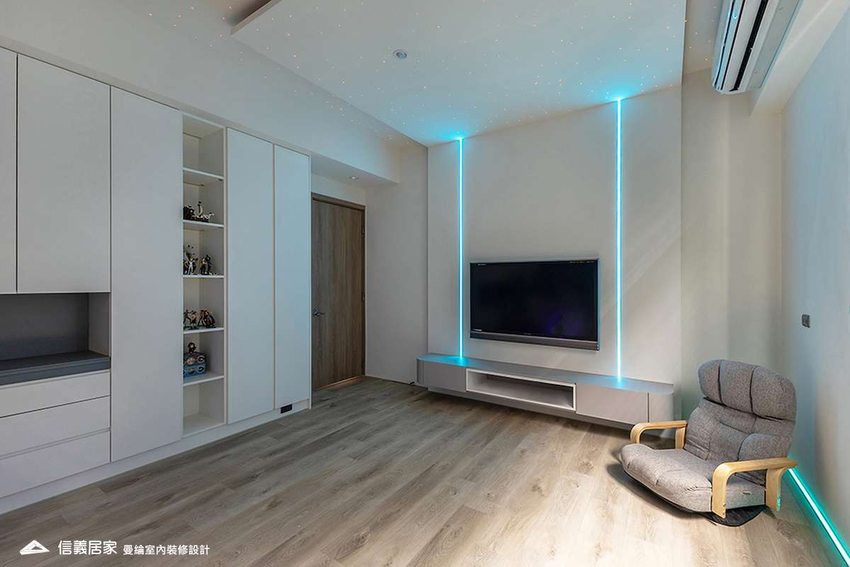 主臥空間延續同樣語彙,利用大面窗景與簡潔立面,引光入室,配合間接照明與低彩度軟裝,營造出放鬆寧靜的休憩環境;設計巧思延伸至電競房,以星空頂作為視覺亮點,在冷靜的低彩度色系中注入趣味與個性,展現屋主對生活品味的堅持,整體設計在極簡之中蘊藏層次細節,實現美感與機能兼容的當代居家想像。