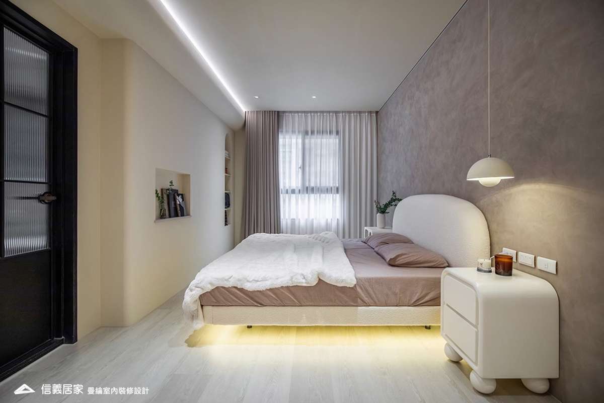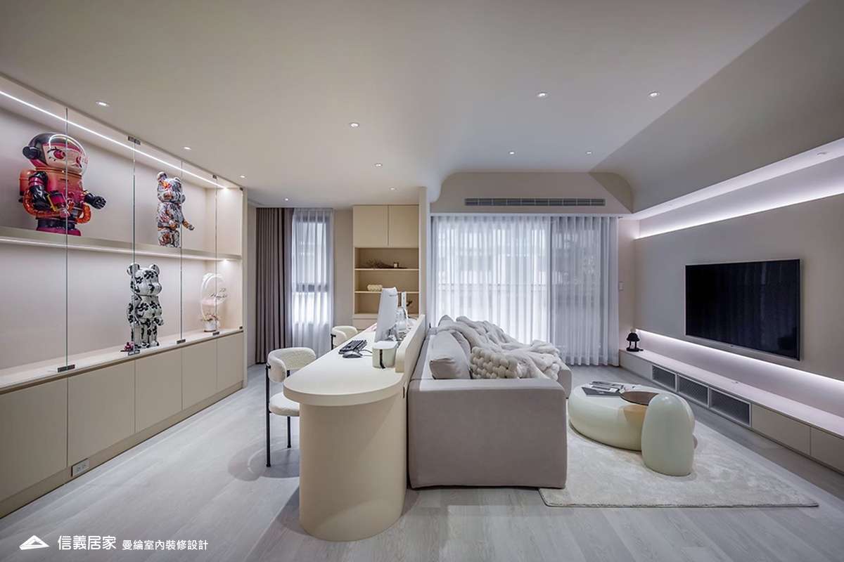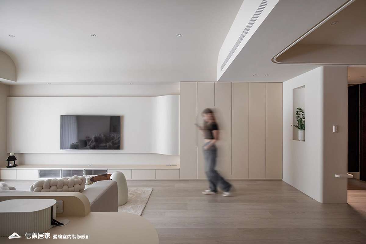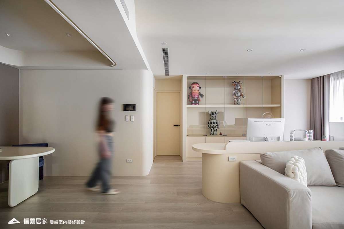 藉由基地結構的原始樑柱安排圓弧元素,彎曲的弧面錯落在天地壁之間,形塑出被包覆的安心環境,挑以質樸選材與鋪陳淺色調色系,達到引進豐沛日光的效果,化解樑位過低所帶來的壓迫感,消弭空間中的稜稜角角,也意味著生活減少紛爭,溫潤的色系增添視覺層次,讓人感到陣陣舒心和緩的溫度。