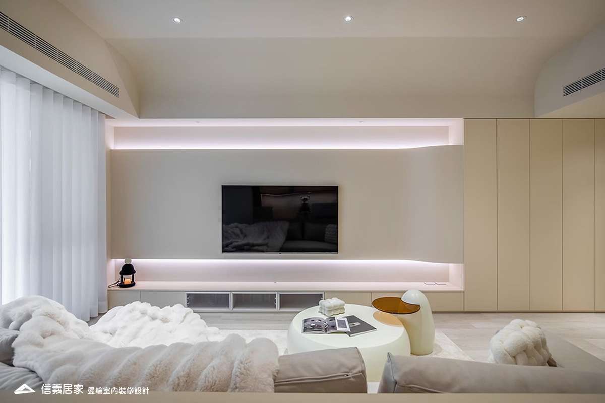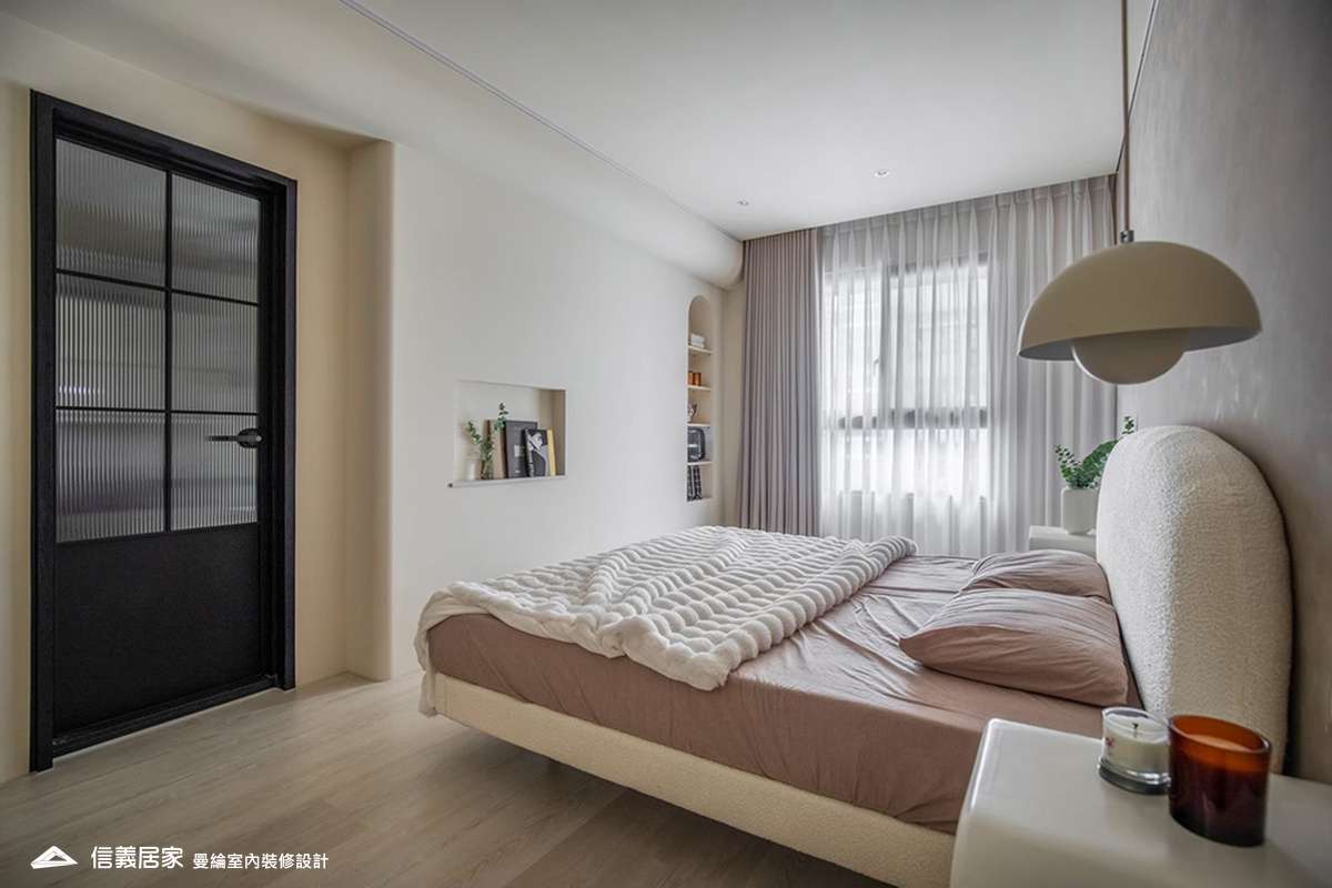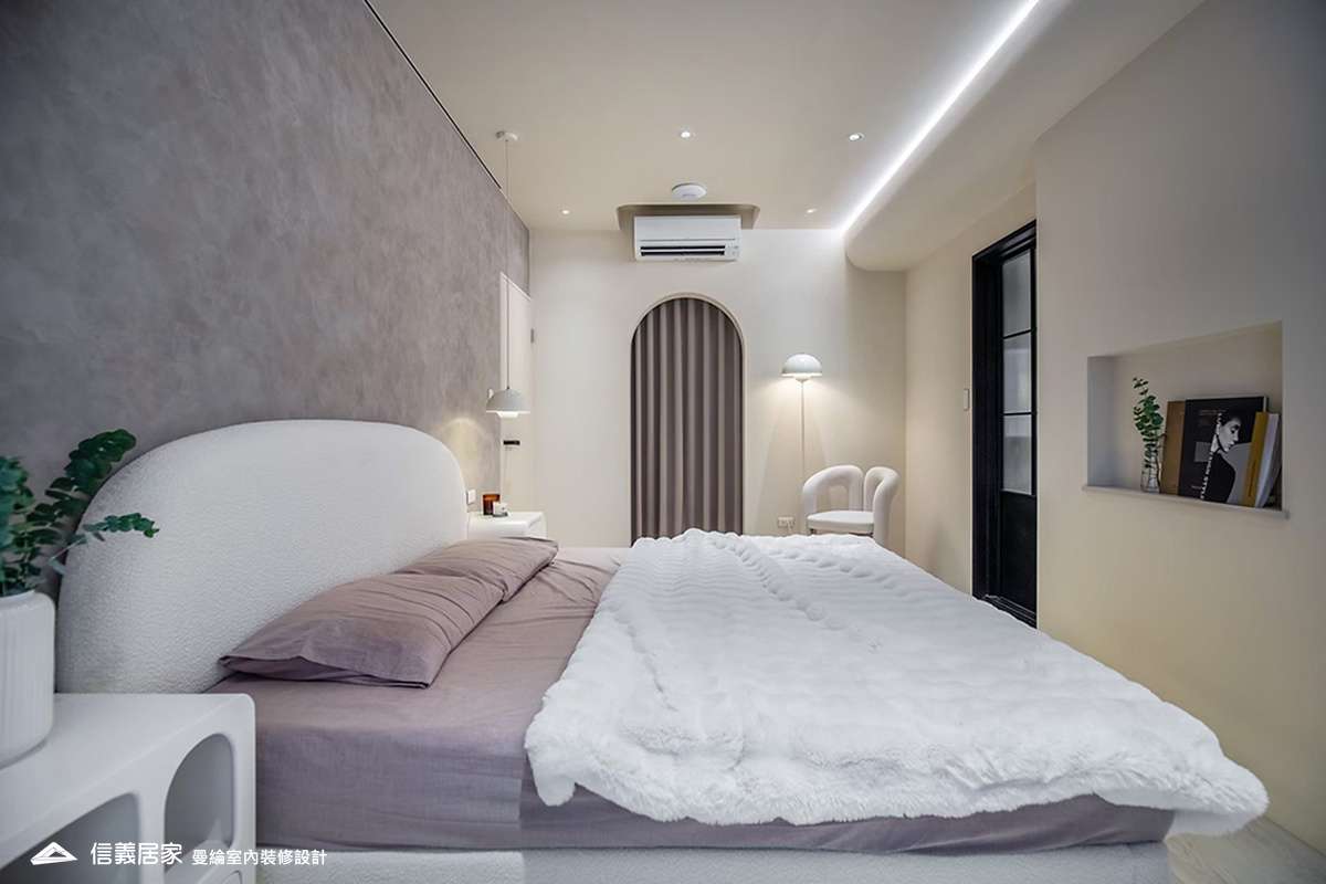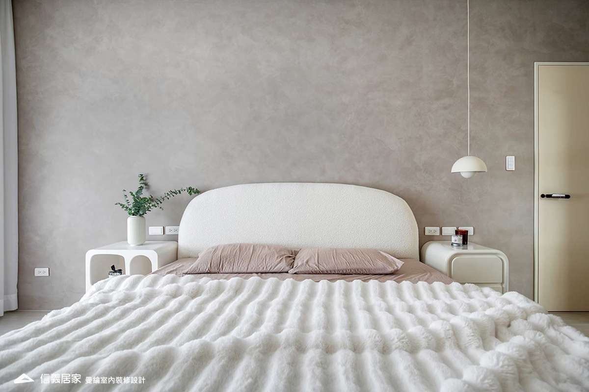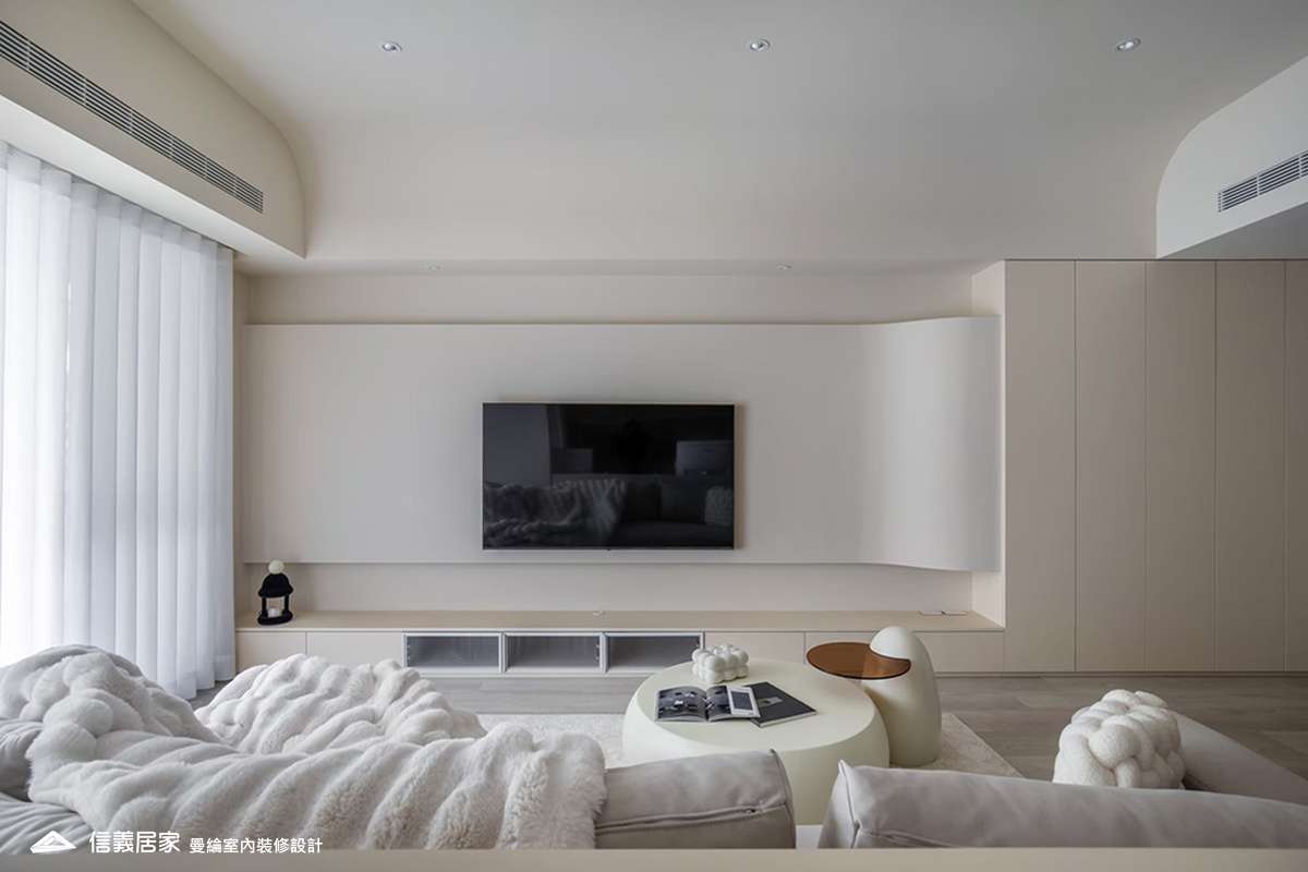 藉由基地結構的原始樑柱安排圓弧元素,彎曲的弧面錯落在天地壁之間,形塑出被包覆的安心環境,挑以質樸選材與鋪陳淺色調色系,達到引進豐沛日光的效果,化解樑位過低所帶來的壓迫感,消弭空間中的稜稜角角,也意味著生活減少紛爭,溫潤的色系增添視覺層次,讓人感到陣陣舒心和緩的溫度。