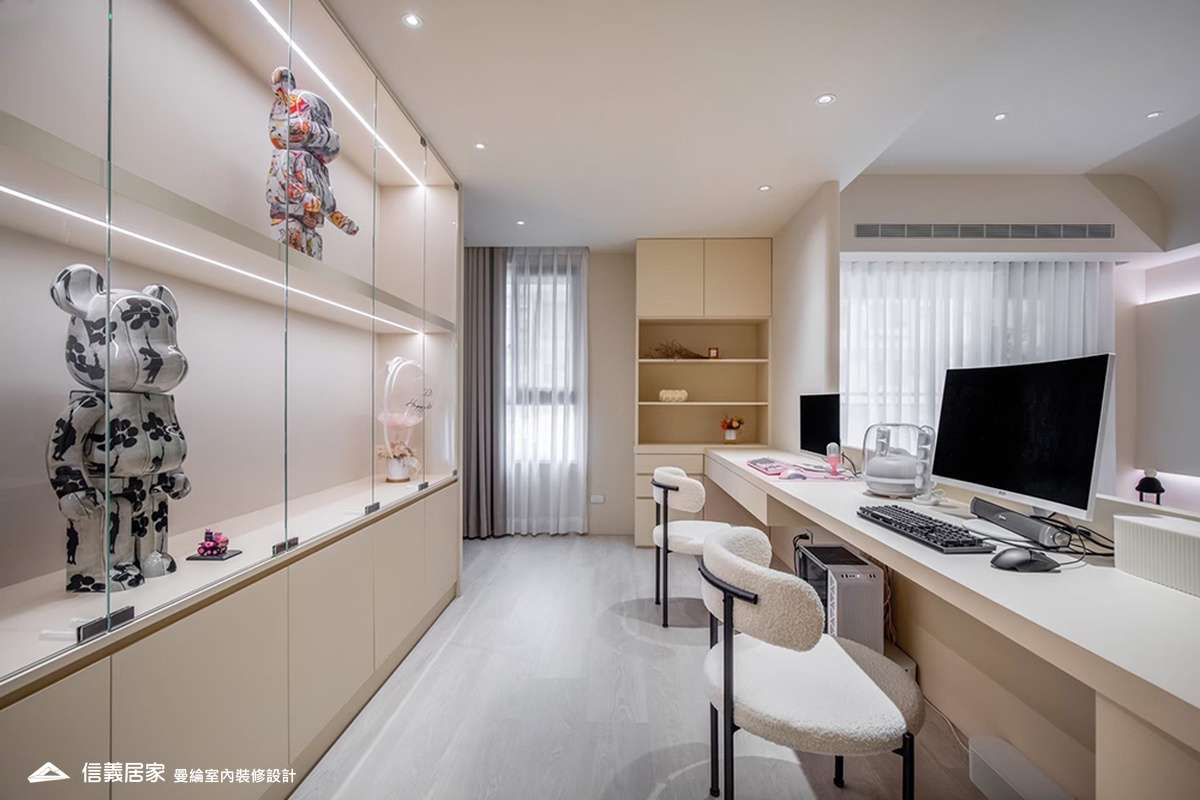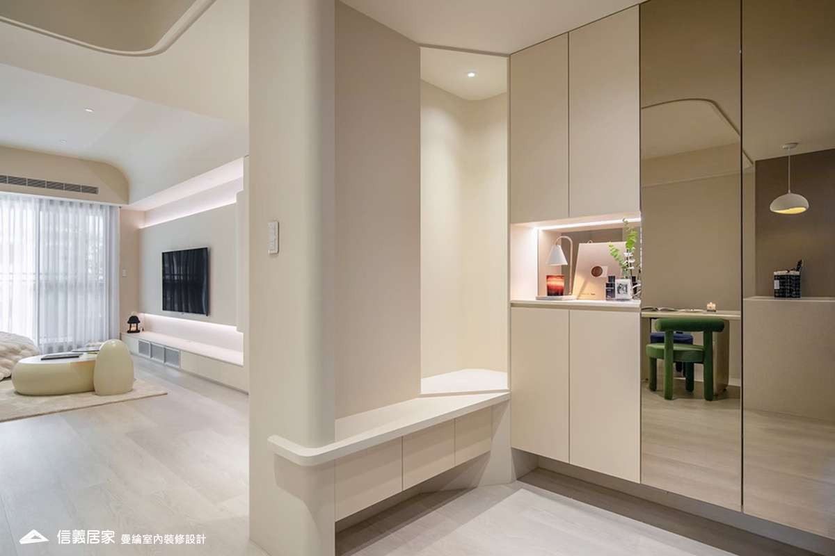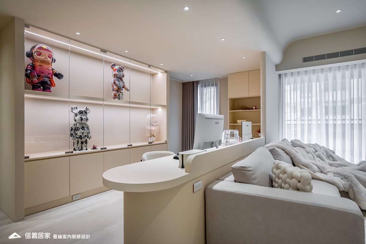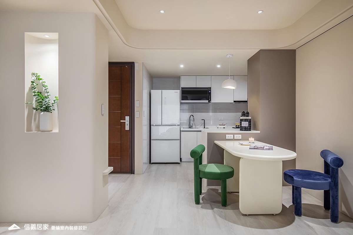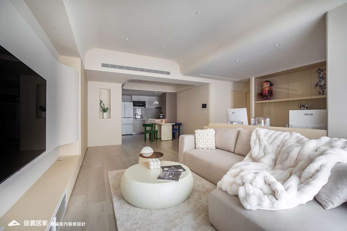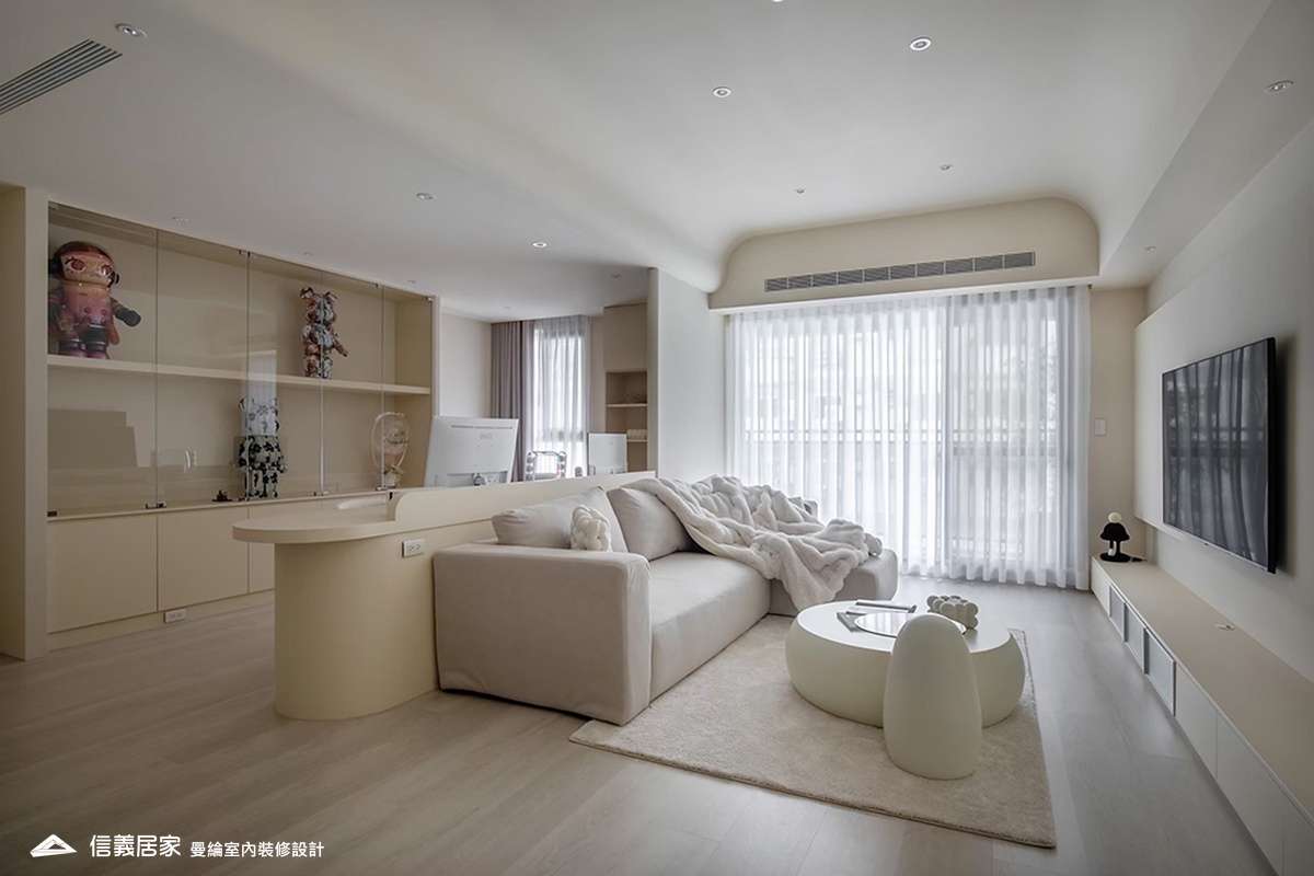 基地為新成屋,本作品取名為「暖暖」,源自於空間的色調呈現以及圓潤視覺所帶來的感受,在奶茶色系的環境中,設計端挹注暖亮木紋、圓弧語彙、並更改格局,重新定義視野新的界線,讓日光與家人們的身影可以在環境中自在穿梭,充滿溫馨暖意之情不只表露於視覺效果,更是充盈於心。業主作品給予極為正面的回饋,表示在預算內取得滿意的成果,特別對於開放式廚房和書房的設計印象深刻,同時強調房子的放大感和空間的舒適度,