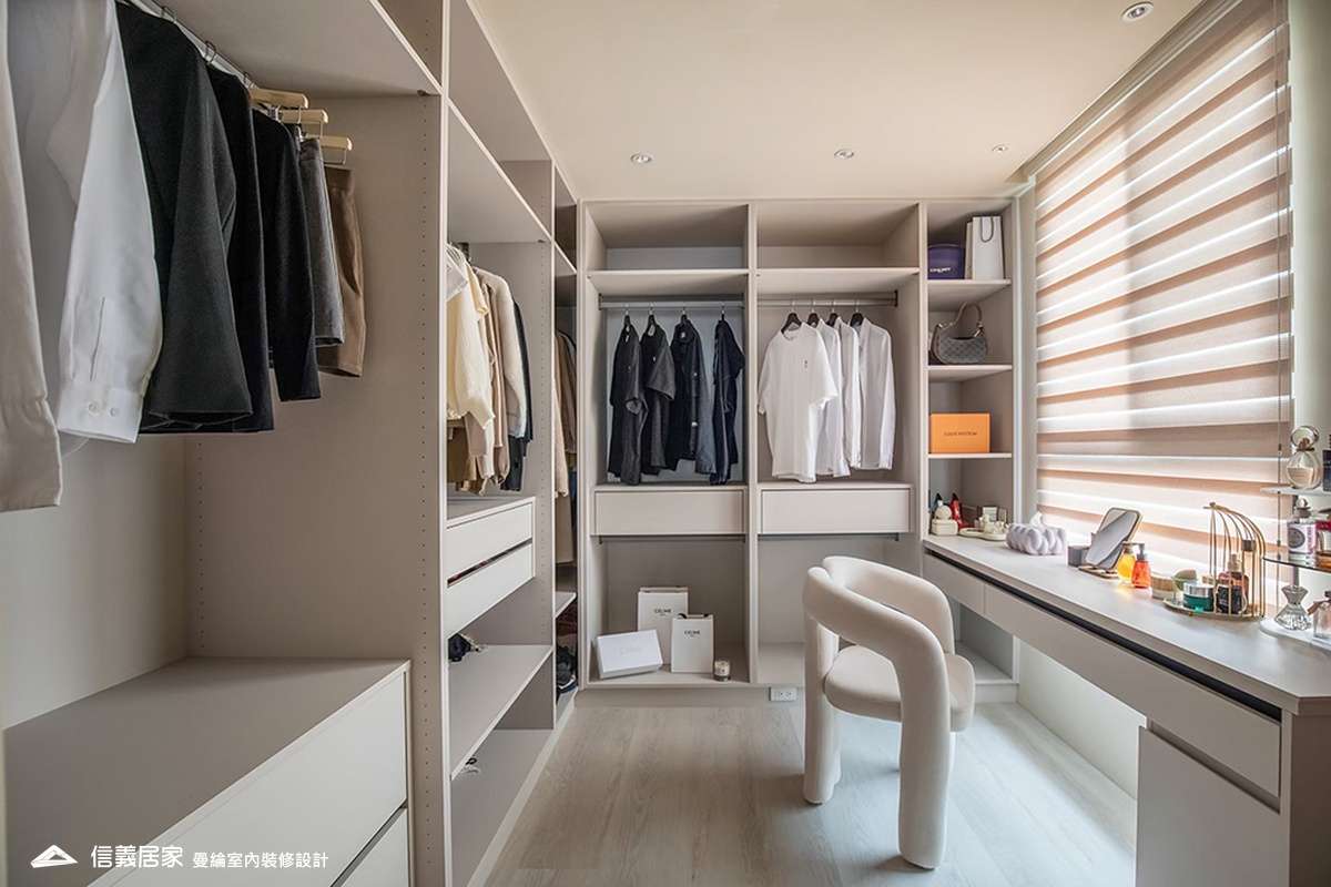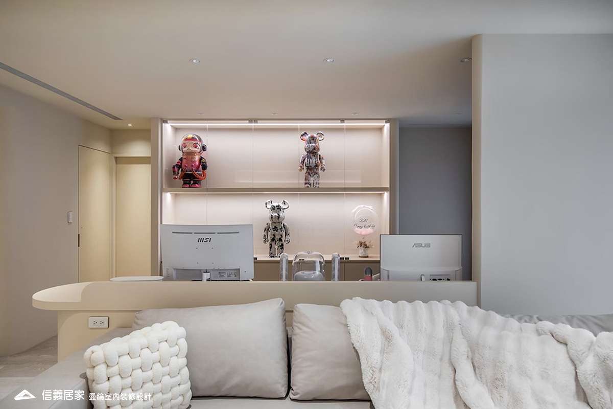 原始格局為三房二廳,為了更符合使用者人數的需求,經過重新設計改為兩房,主要變動包括將書房改為開放式設計,並在此處做串聯的佈局,為了營造更好的入門氛圍,特地打造一個玄關端景,同時兼具穿鞋椅的功能,轉折處的空間亦可以擺放庫柏力克熊;另外,業主的更衣室以拉簾的方式作為設計,讓使用者可以根據不同的心境使用空間,為整體空間增添了趣味性。