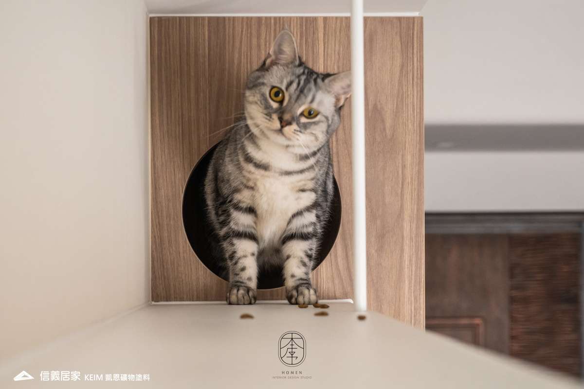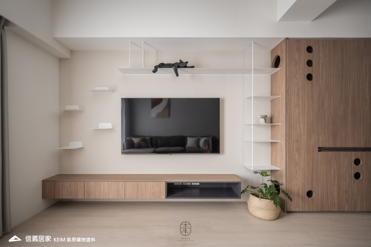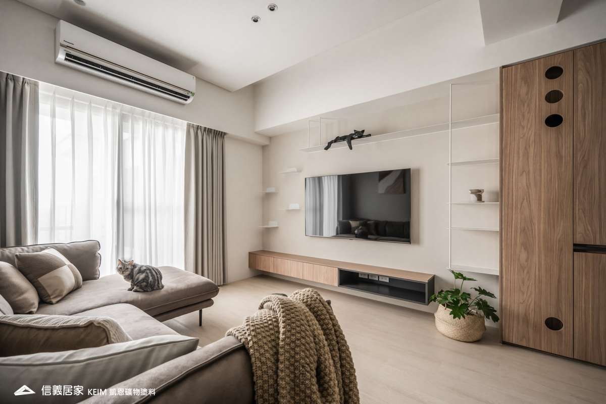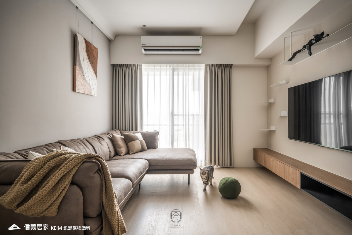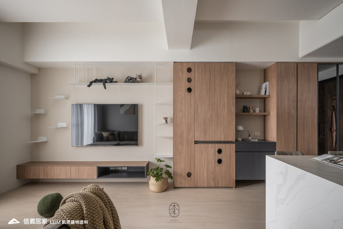 【顏色:9294】【地點:新竹】【設計師/建築師:本序空間製作所】【軟裝:MOOYU 睦寓傢飾】原本封閉的廚房經由隔間的拆除,讓光線及視線更為穿透,並透過弧形的天花板設計柔化原始的結構樑,進而創造更寬敞、柔和的公領域空間。電視牆以白色造型鐵件,搭配一旁造型開孔的櫃體作為貓咪與屋主互動的空間。整體風格上以溫柔奶茶色及溫潤木質交織,營造溫暖放鬆的生活情境。特別注意:色號施作區域僅電視牆 9294一色