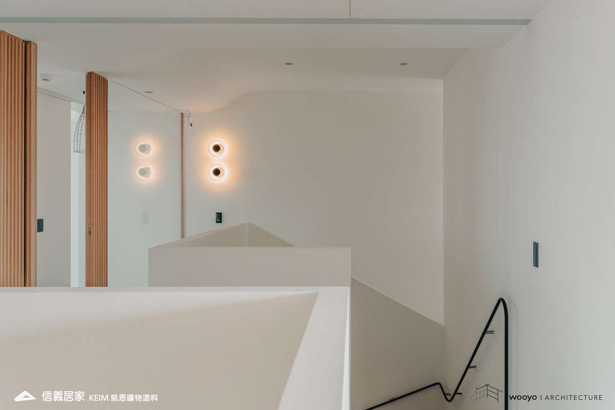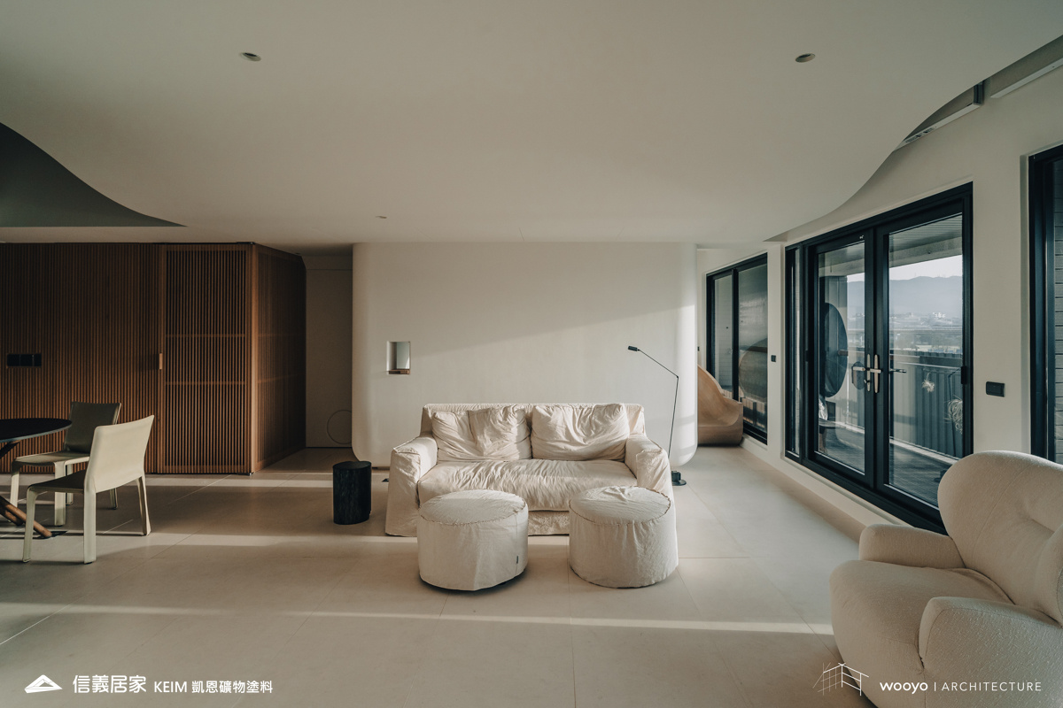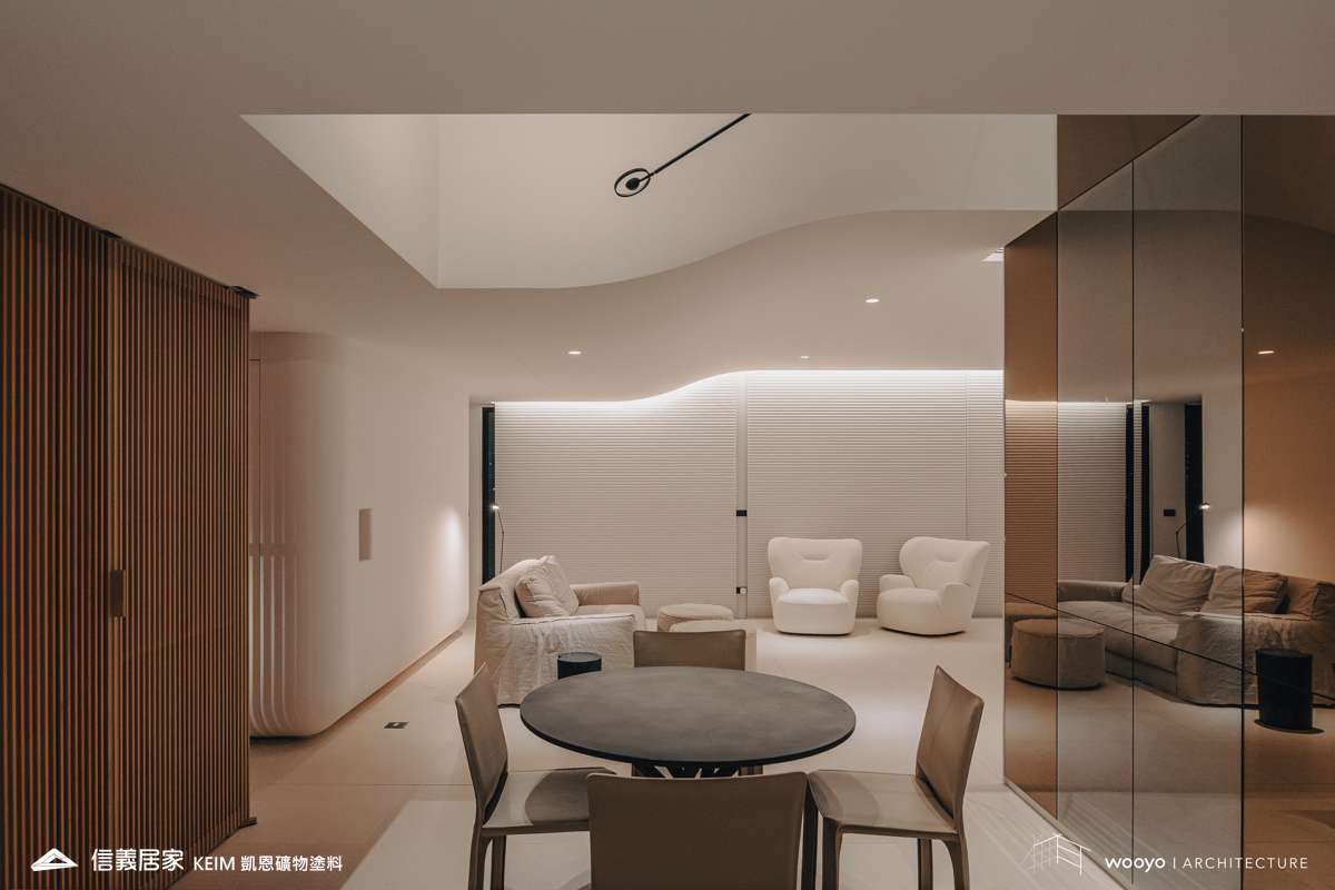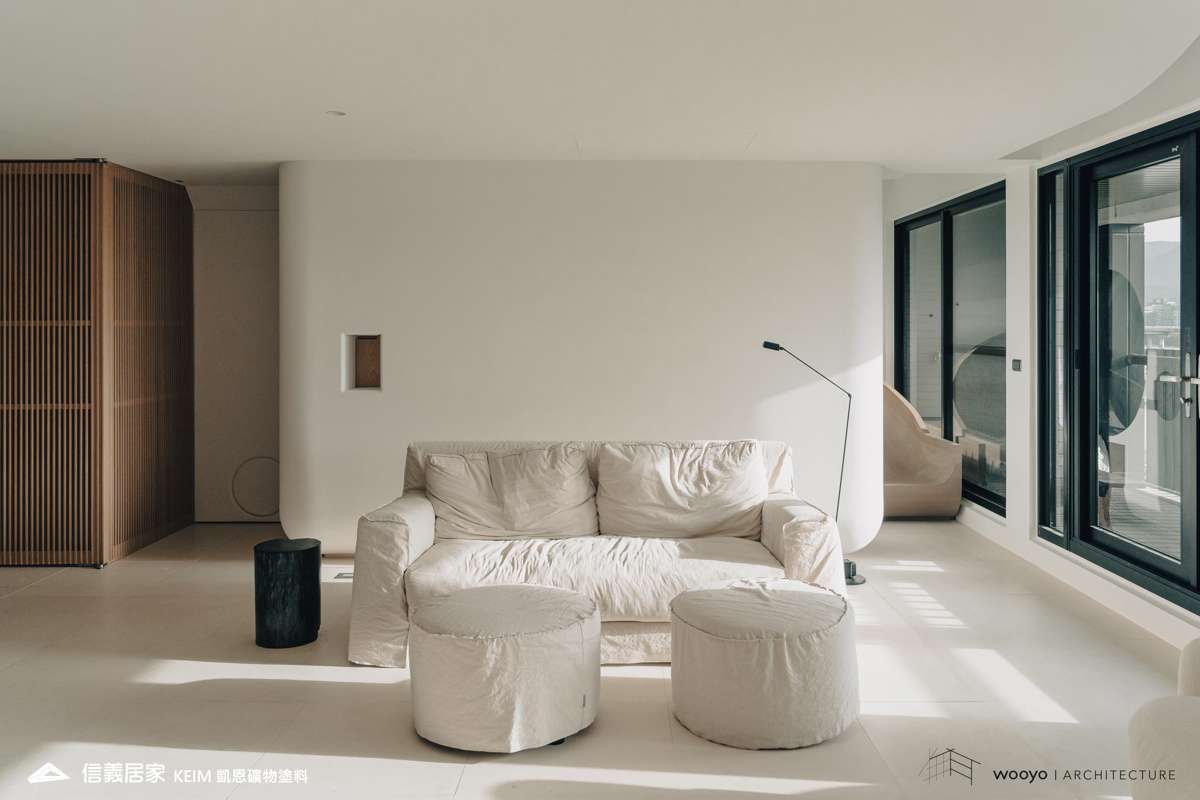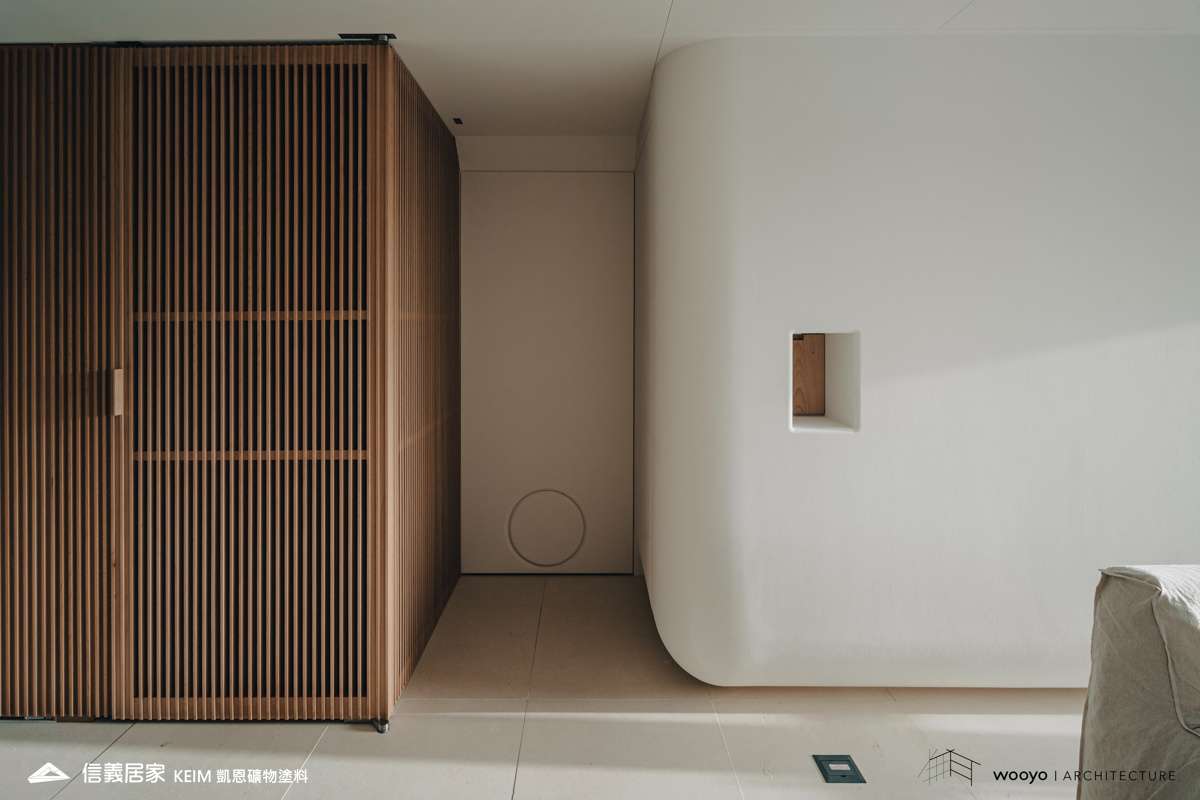 【顏色:white】【地點:台北】【設計師/建築師: 無有建築】【攝影:高靖捷】此案位於台北,設計公司無有建築在山水之間巧妙的運用了弧形設計,以及精心選用全榫接、全實木格柵,地板則採用溫潤、柔軟的石材,為空間注入了溫暖而有品味的生活感,同時也擴大了整體空間感。在陽光溫暖的映照下,光影在現代簡潔的空間中流動,提供了一個讓繁雜心靈獲得安定和休憩的場域。健康的生活環境是人們對於居住空間的追求之一。凱恩礦物塗料為天然礦物萃取,零甲醛、零塑化劑、零VOC,完全超越世界各國綠建材規範要求,施工完當天即可入住,非常適合注重生活品質的屋主。此外,牆面上獨特的蛋殼紋質感,展現的柔光色彩和溫潤的立體感,配合光線的照射,可以產生不同的層次感,為整體空間調和出有品味、有溫度的家。