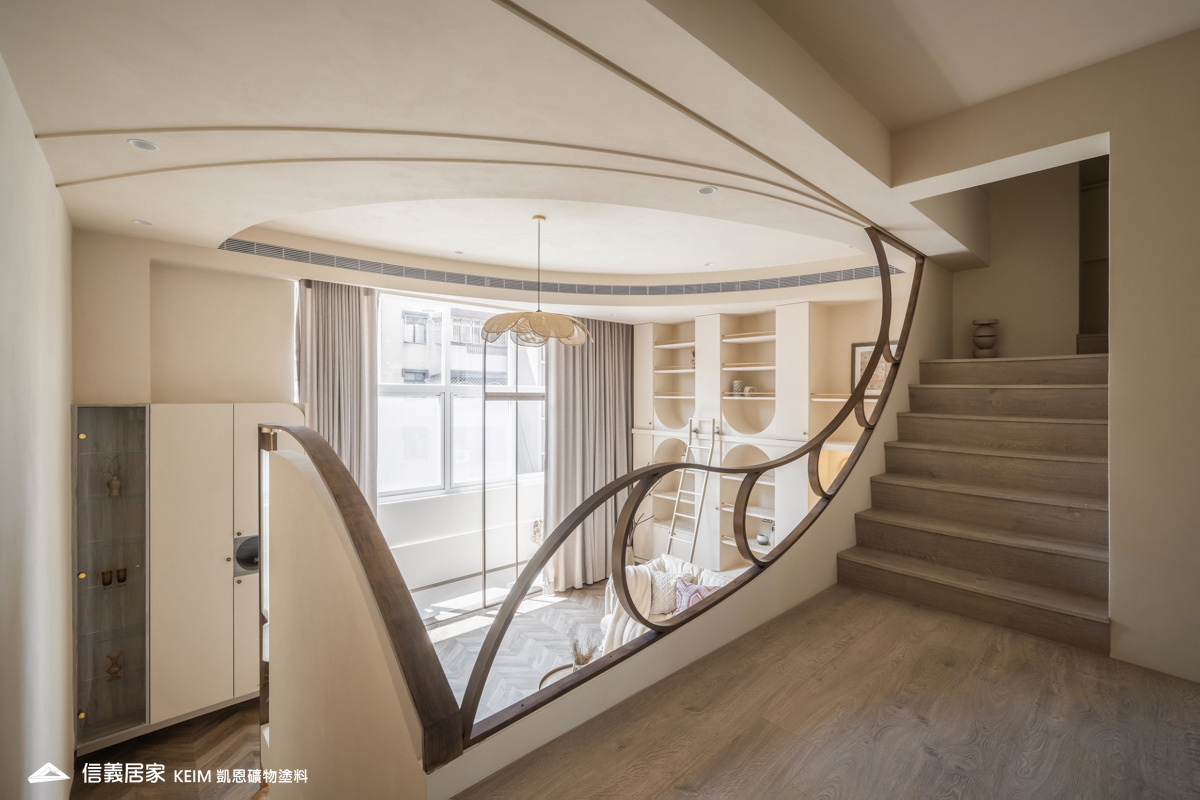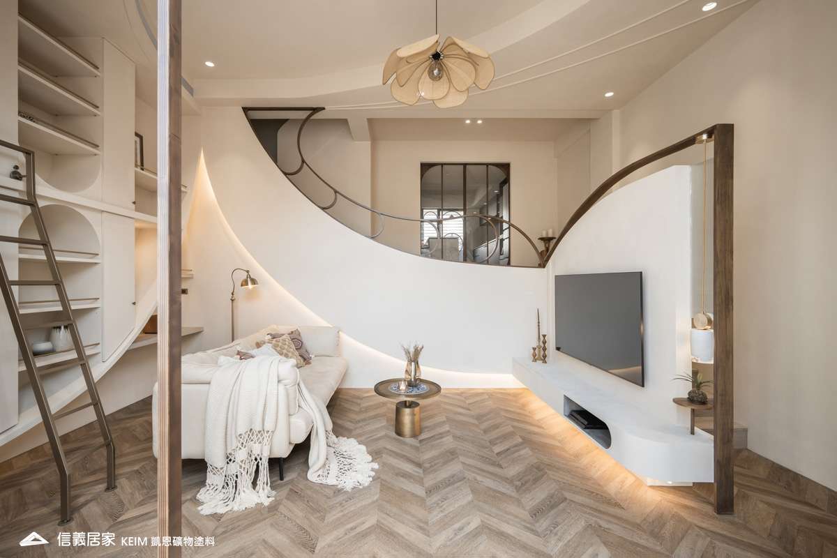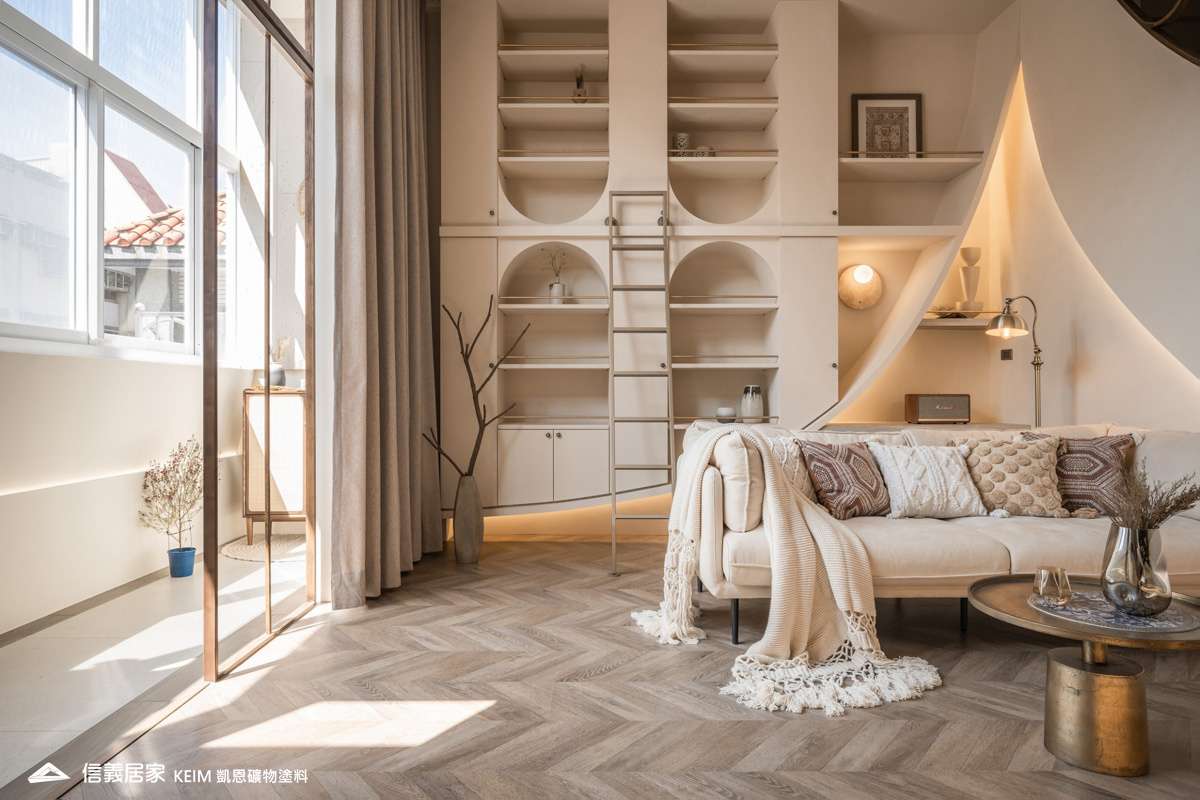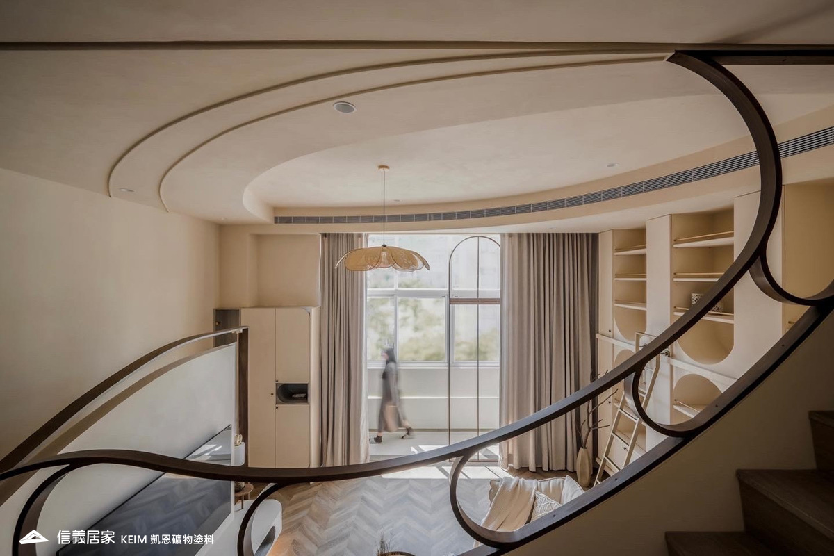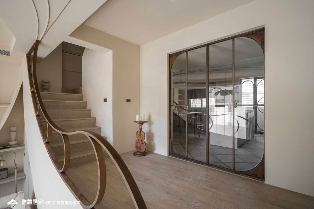 【顏色:9274】【地點:台北】【設計師/建築師:實宅設計 Real House Design】此案為30年屋,36坪3房2廳。設計公司 實宅設計 Real House Design 表示,很高興可以將老的空間回憶;轉換成新的空間記憶。一樓;4米2挑高的樓中樓為現在少有的空間格局,此案從客廳的Z軸線上出發、乂型的語彙分布在空間中,延伸至天花板、樓梯扶手、電視牆,及沙發背牆的物件,讓整體視覺感受無限延伸至畫面中。 整體主色選用凱恩礦物塗料米色,透過光線,會呈現不同的生命感受。 玄關訂製350公分高、一體成形的屏風鐵件,界定玄關和客廳的空間,廚房使用16種不同花紋的法國復古磁磚,在地面及牆面上做出X型拼貼處理,讓空間獨樹一格,展現獨特性。凱恩塗料色系特殊的調性與質感,不僅穩定心情、沈澱內在,更能增添許多生活中有趣的元素。隨著一天日照的改變,牆面上的光影流動亦獨有一番純粹風味。二樓;我們將兩間廁所打通,置入浴缸,讓屋主能沉浸在自我的療癒時光,主臥室加大,讓空間更貼近陽光,希望業主未來的生活能像春天花開一樣美好。