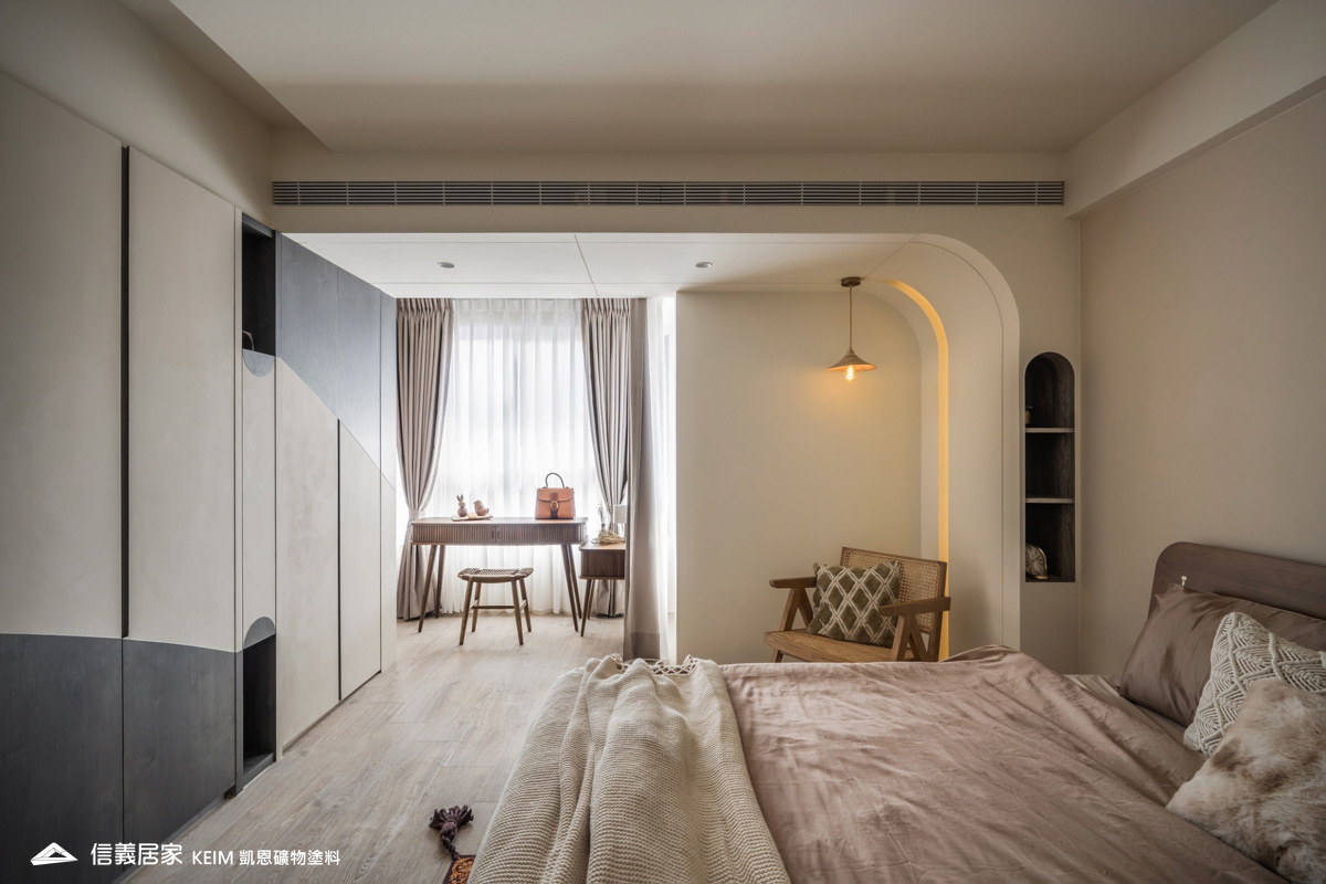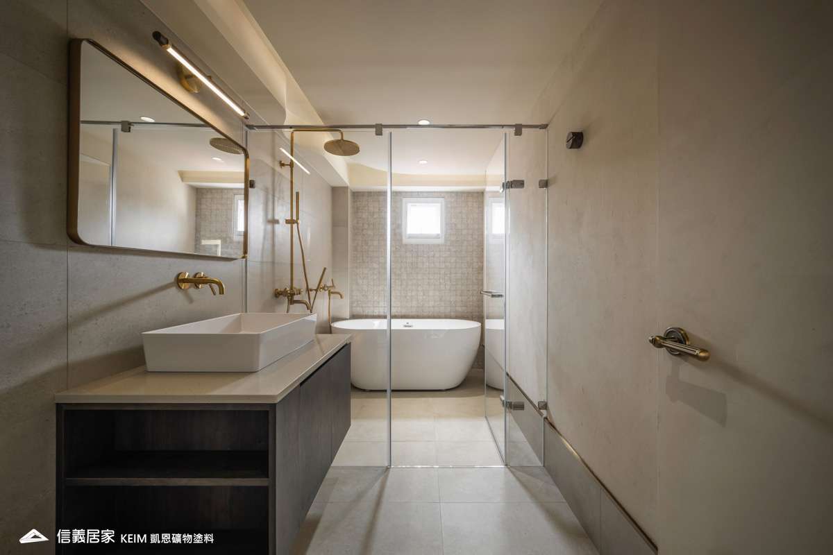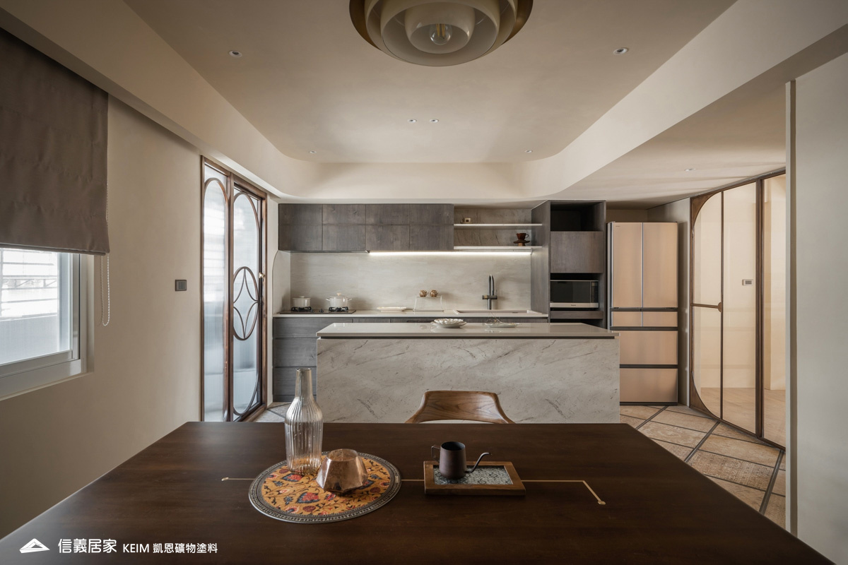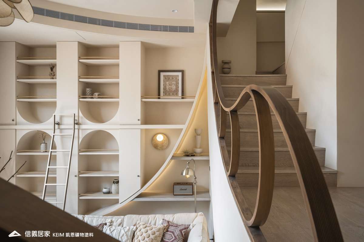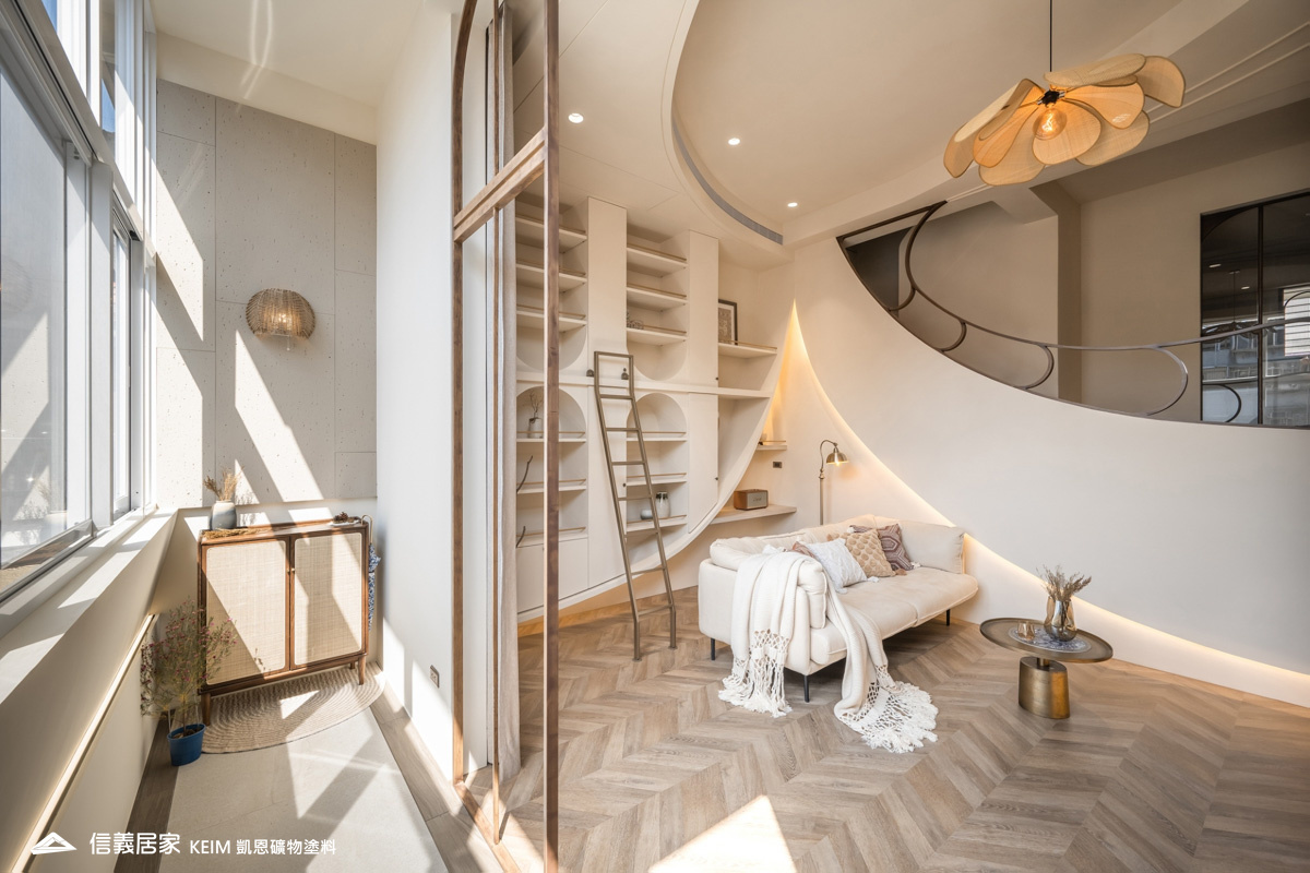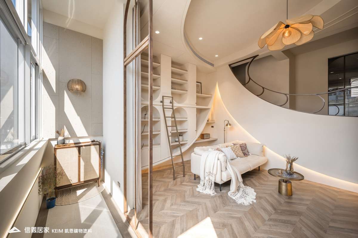 【顏色:9274】【地點:台北】【設計師/建築師:實宅設計 Real House Design】此案為30年屋,36坪3房2廳。設計公司 實宅設計 Real House Design 表示,很高興可以將老的空間回憶;轉換成新的空間記憶。一樓;4米2挑高的樓中樓為現在少有的空間格局,此案從客廳的Z軸線上出發、乂型的語彙分布在空間中,延伸至天花板、樓梯扶手、電視牆,及沙發背牆的物件,讓整體視覺感受無限延伸至畫面中。 整體主色選用凱恩礦物塗料米色,透過光線,會呈現不同的生命感受。 玄關訂製350公分高、一體成形的屏風鐵件,界定玄關和客廳的空間,廚房使用16種不同花紋的法國復古磁磚,在地面及牆面上做出X型拼貼處理,讓空間獨樹一格,展現獨特性。凱恩塗料色系特殊的調性與質感,不僅穩定心情、沈澱內在,更能增添許多生活中有趣的元素。隨著一天日照的改變,牆面上的光影流動亦獨有一番純粹風味。二樓;我們將兩間廁所打通,置入浴缸,讓屋主能沉浸在自我的療癒時光,主臥室加大,讓空間更貼近陽光,希望業主未來的生活能像春天花開一樣美好。