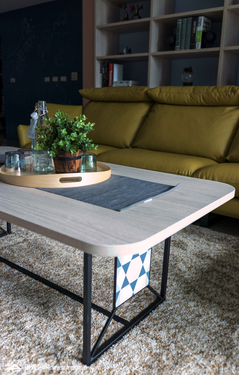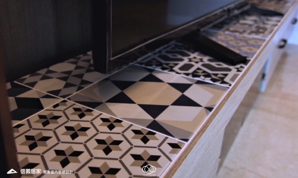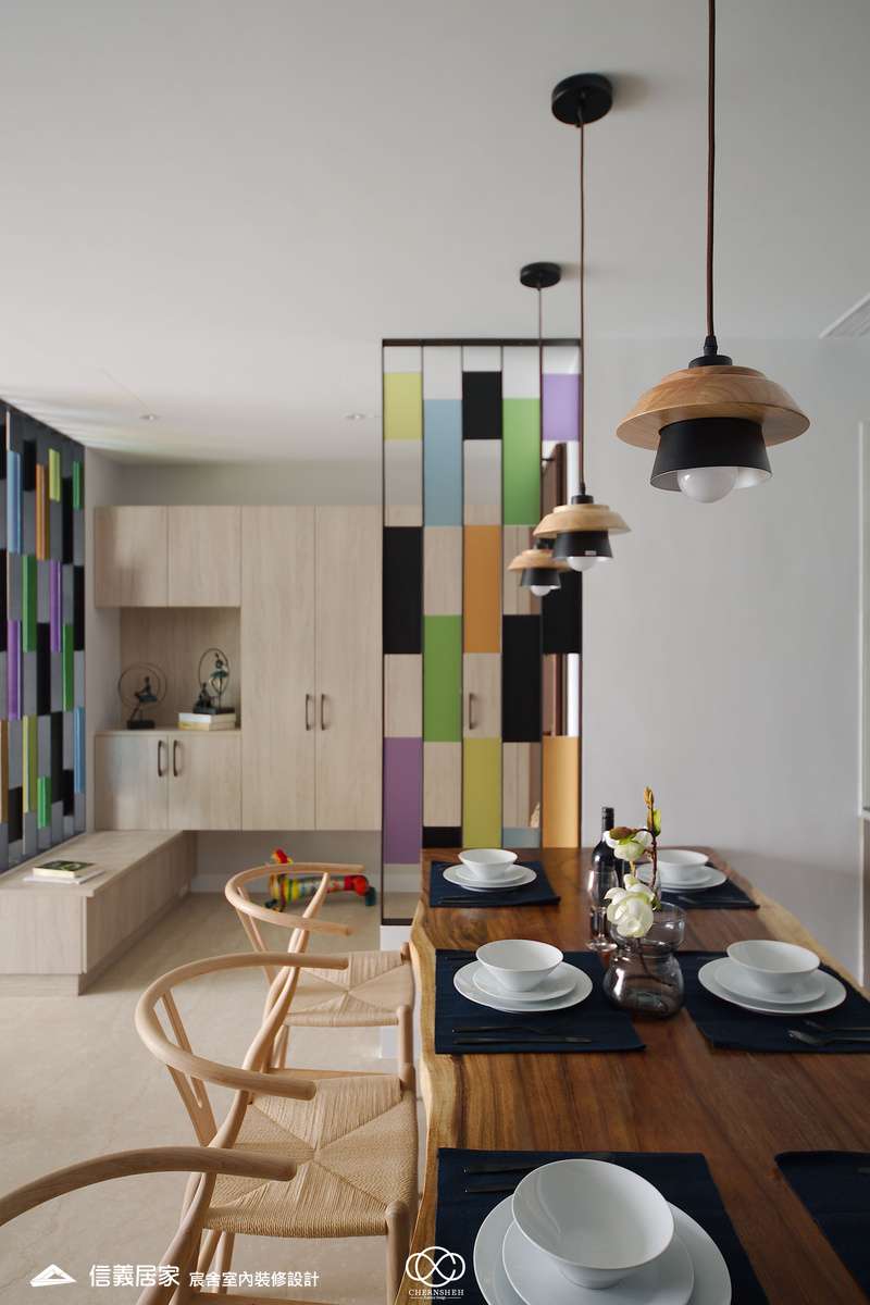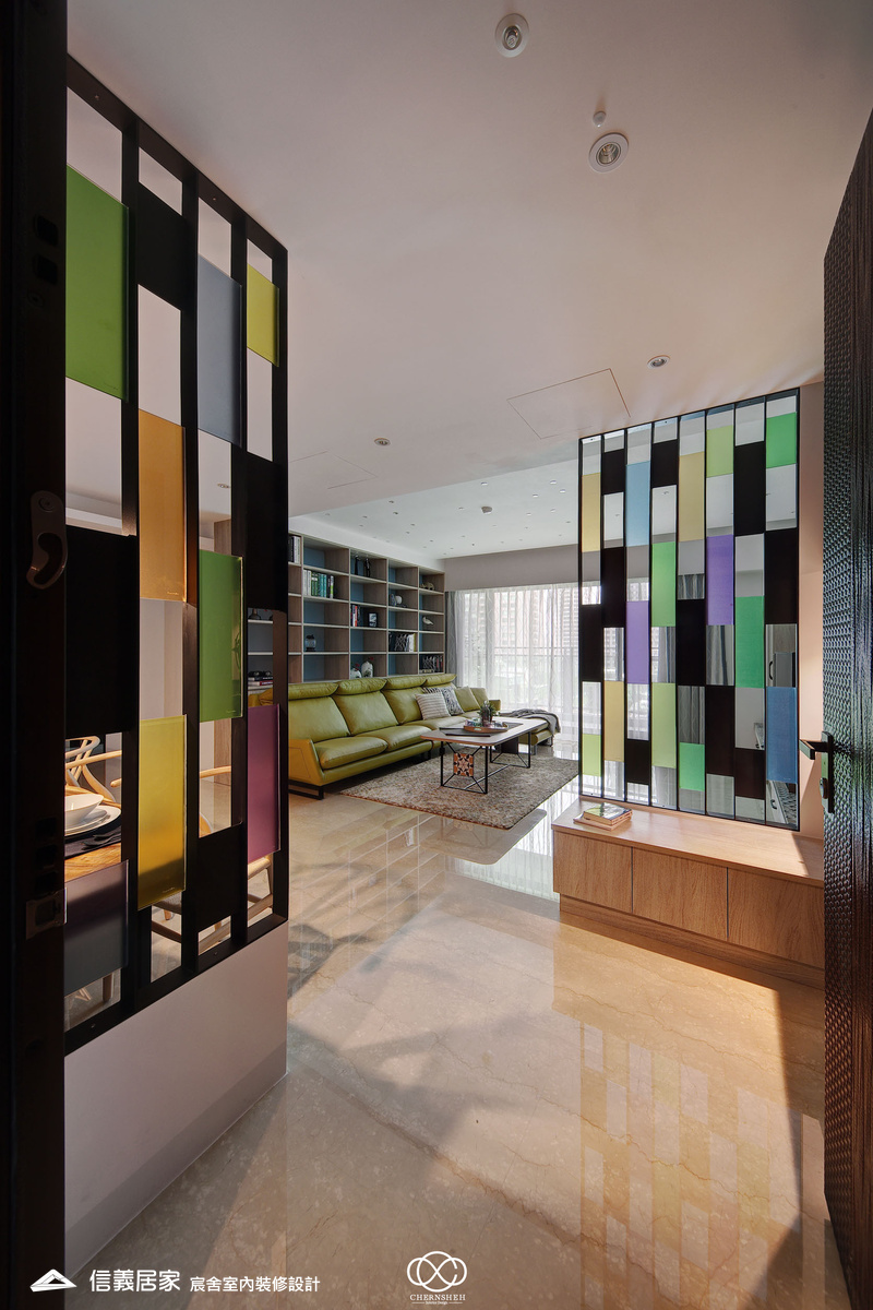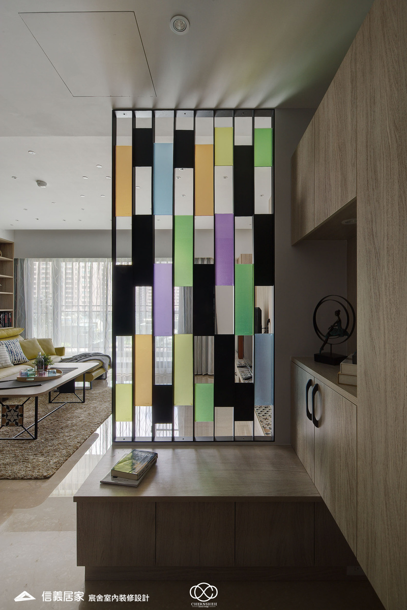 從玄關處繽紛的彩色格狀屏風開始,透過大膽的撞色與精確的比例,將生活空間轉化為一場豐富的感官饗宴,為現代都會住宅注入滿滿的生命力。電視櫃不同於傳統單一色調的櫃體,檯面嵌入多款幾何圖騰花磚,與屏風瘩幾何色塊設計相呼應。