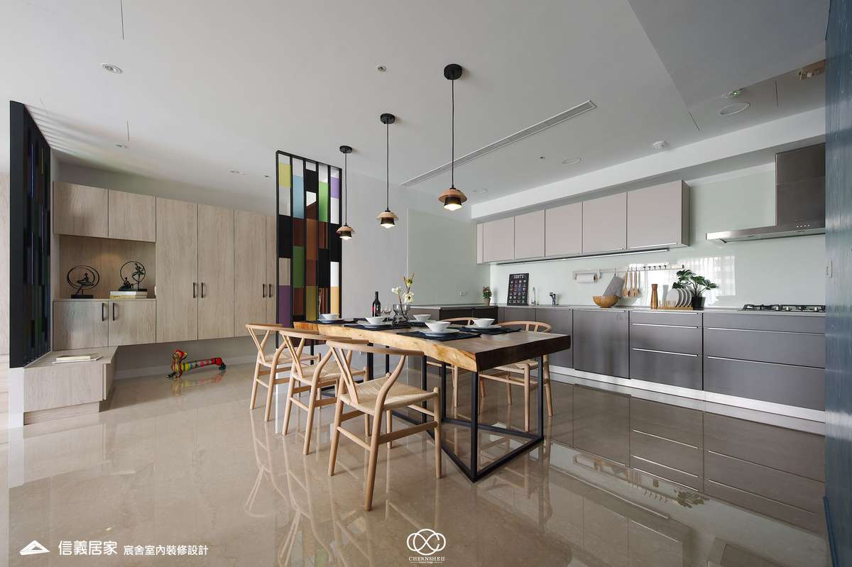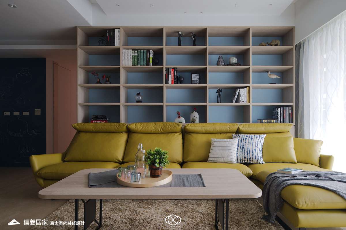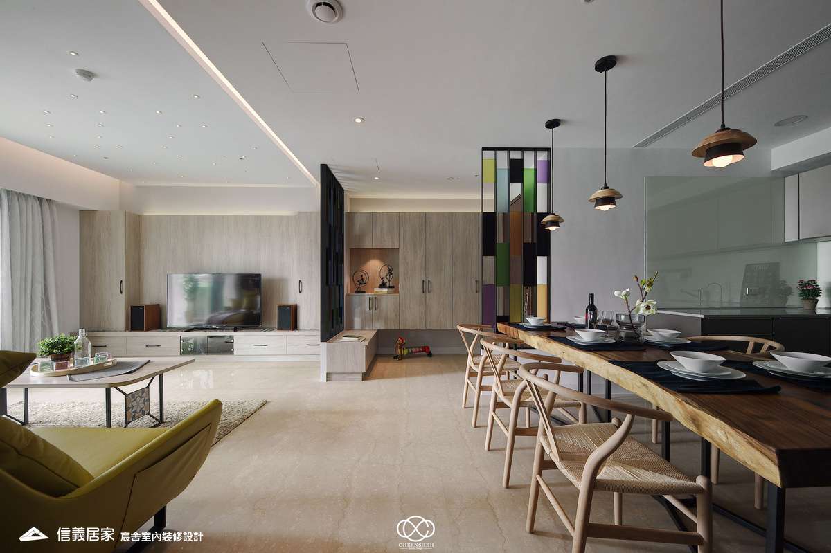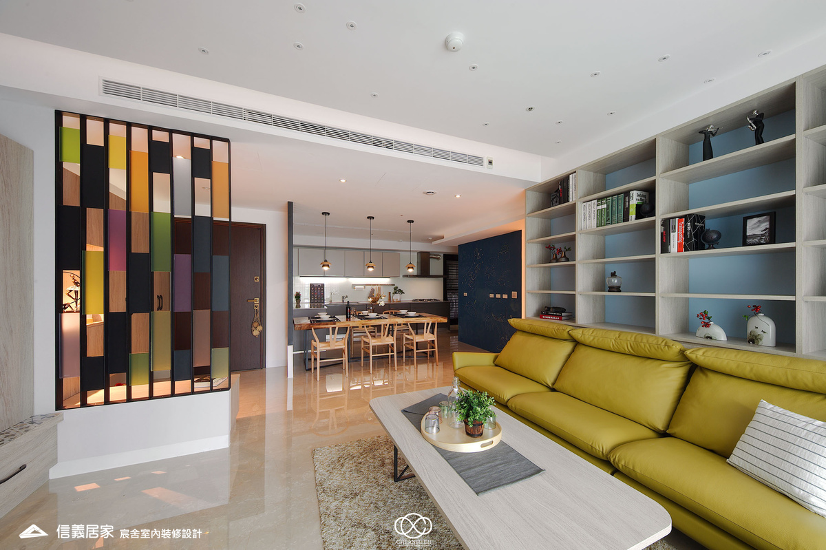 從玄關處繽紛的彩色格狀屏風開始,透過大膽的撞色與精確的比例,將生活空間轉化為一場豐富的感官饗宴,為現代都會住宅注入滿滿的生命力。電視櫃不同於傳統單一色調的櫃體,檯面嵌入多款幾何圖騰花磚,與屏風瘩幾何色塊設計相呼應。