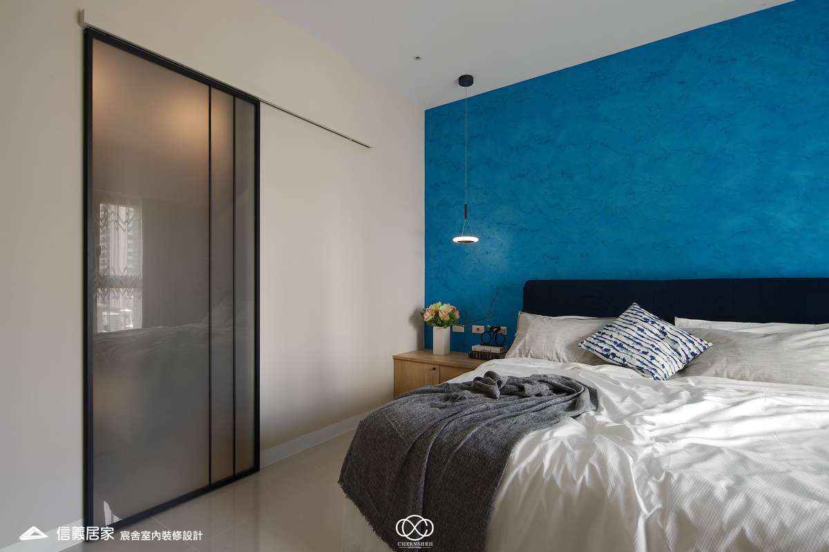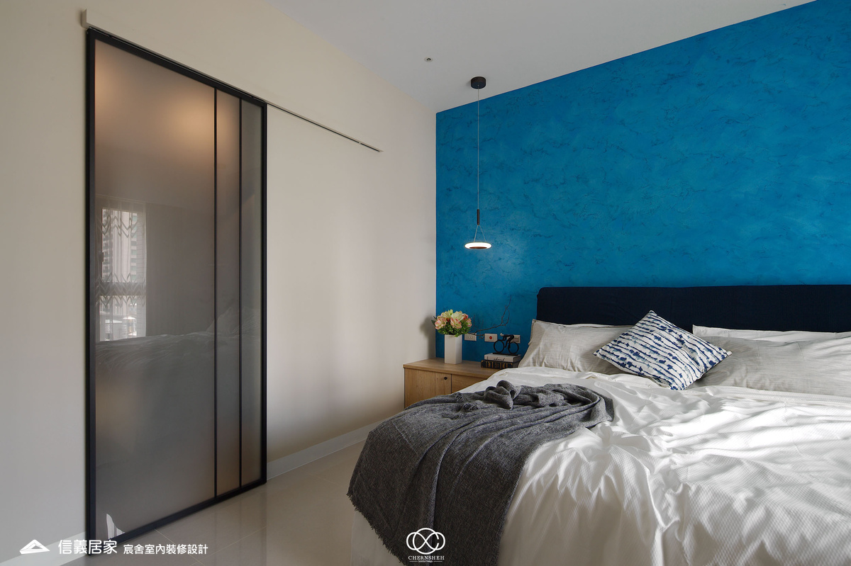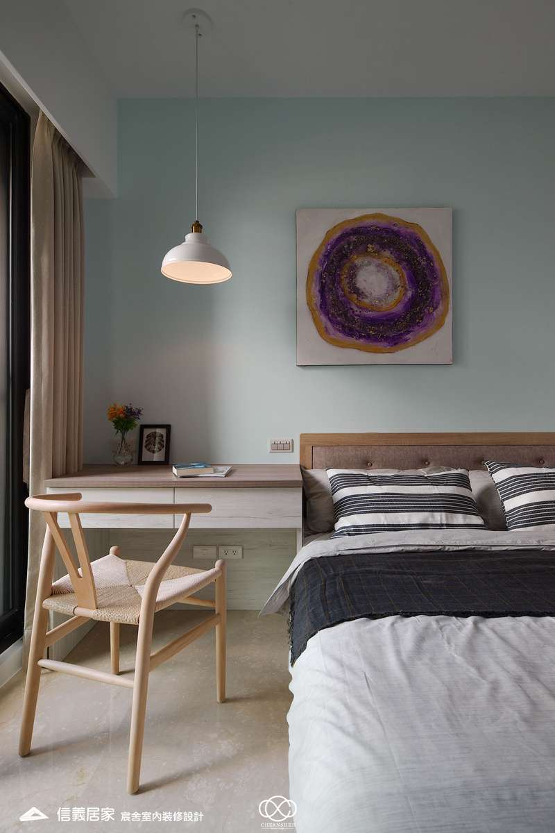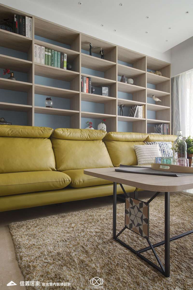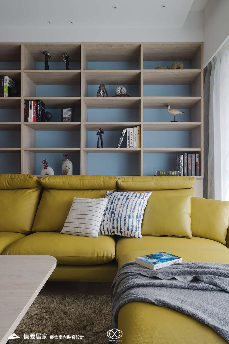 從玄關處繽紛的彩色格狀屏風開始,透過大膽的撞色與精確的比例,將生活空間轉化為一場豐富的感官饗宴,為現代都會住宅注入滿滿的生命力。電視櫃不同於傳統單一色調的櫃體,檯面嵌入多款幾何圖騰花磚,與屏風瘩幾何色塊設計相呼應。