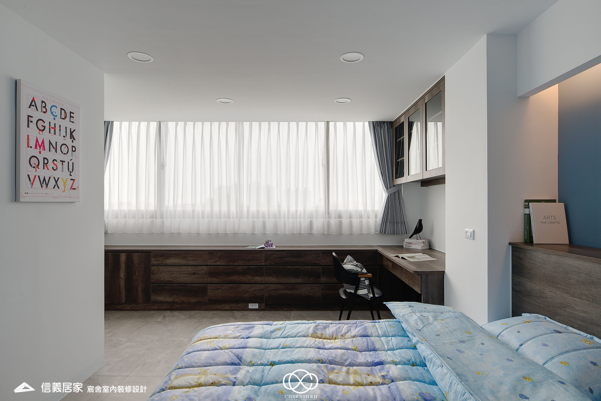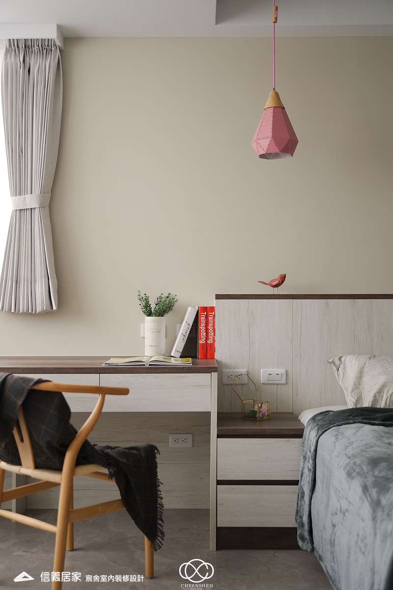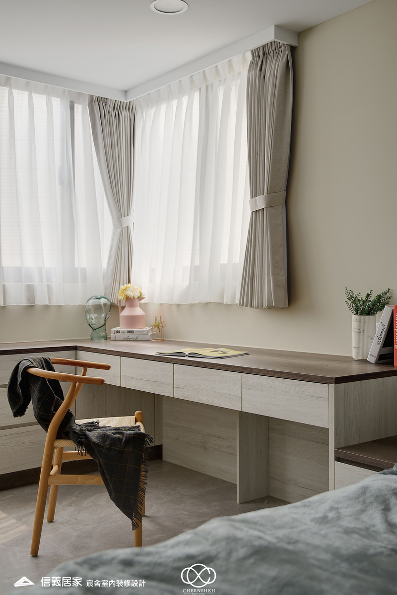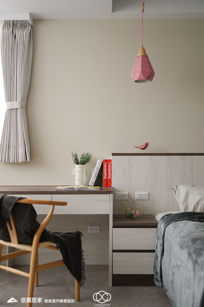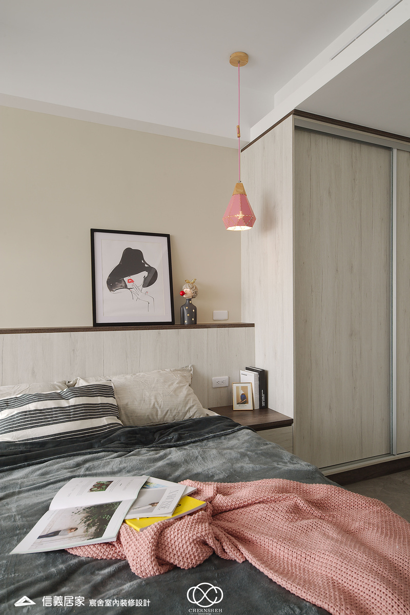 整體設計以暖白及木紋搭配,透過適當的比例配置及陰影變化讓白不只有一種味道。為了善用頂樓樓層採光足的優點,出入口處使用玻璃落地窗引入光線,在引光入室的同時,創造出層次豐富且具備通透視野。