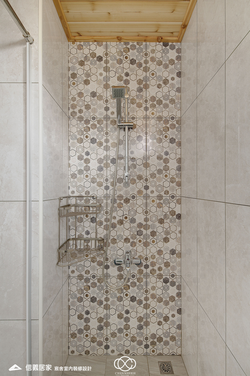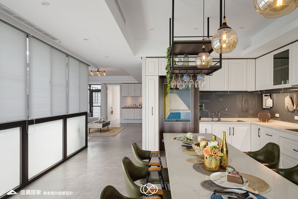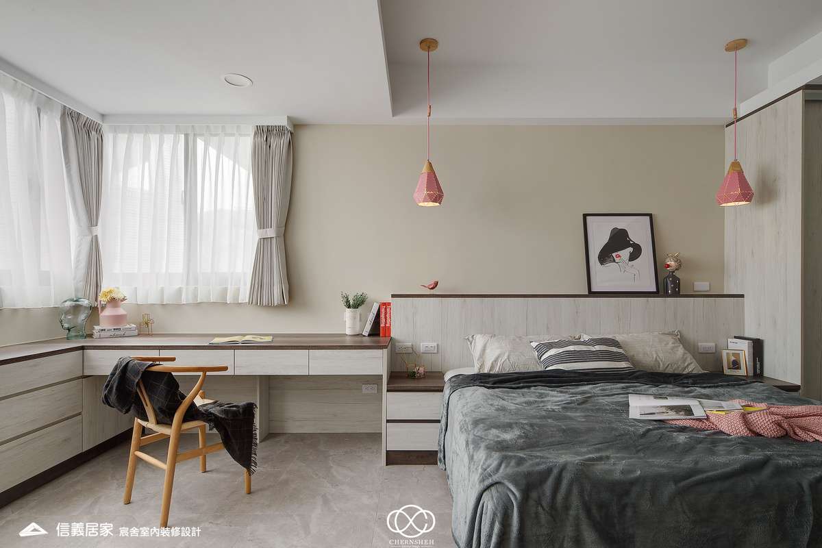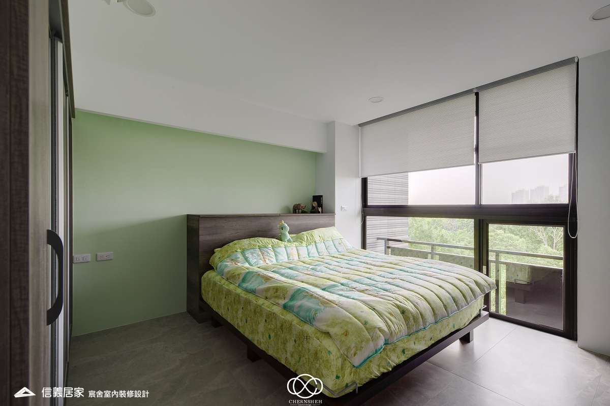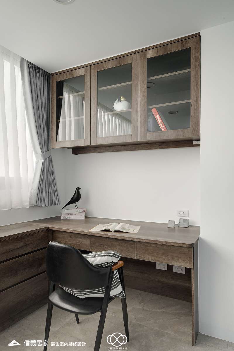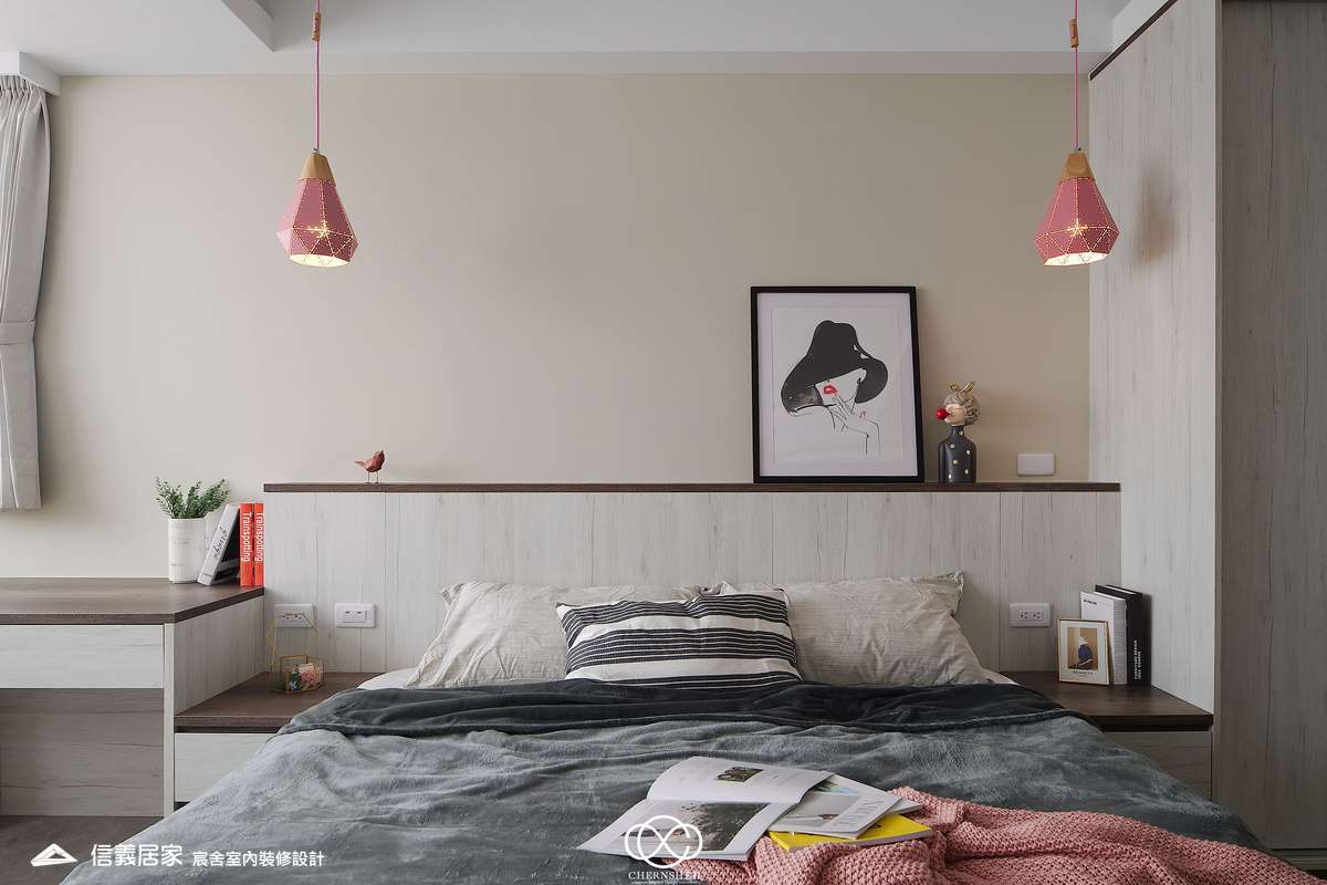 整體設計以暖白及木紋搭配,透過適當的比例配置及陰影變化讓白不只有一種味道。為了善用頂樓樓層採光足的優點,出入口處使用玻璃落地窗引入光線,在引光入室的同時,創造出層次豐富且具備通透視野。