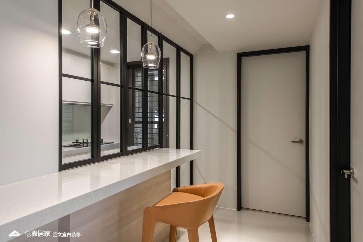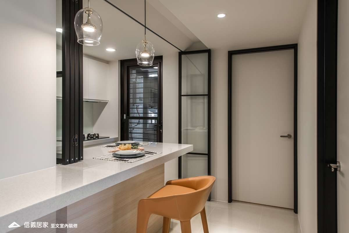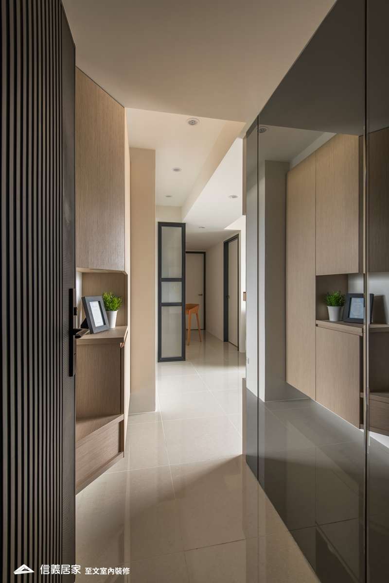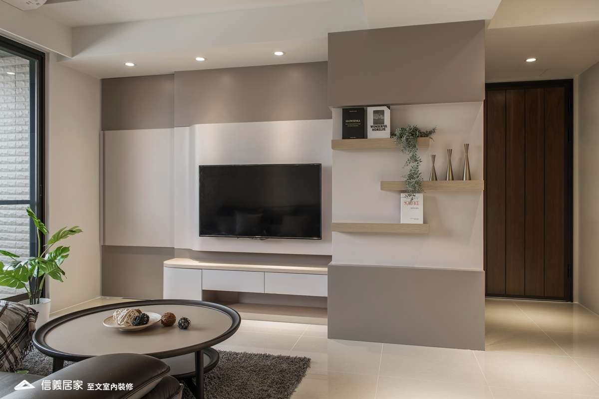喜愛現代風格的雙薪年輕夫妻,因增加家庭成員,希望換屋後空間更寬闊。至文設計以不動格局為前提,將玄關動線、電視主牆及主臥房門片做了視覺延伸,將電視主牆設計得更有層次。