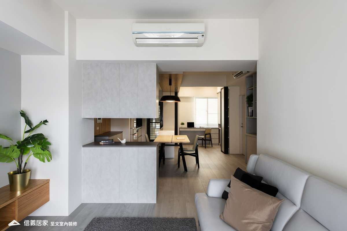 屋主是喜歡現代簡約風的年輕夫妻,希望回到家時能夠享受舒適大空間。至文設計將書房及廚房都規劃成開放式空間,並巧妙保留書房的機能性,將來有較多客人來家裡過夜時,也能滿足客房的需求。