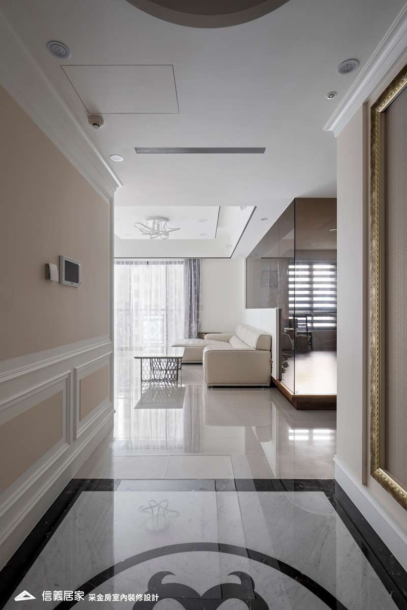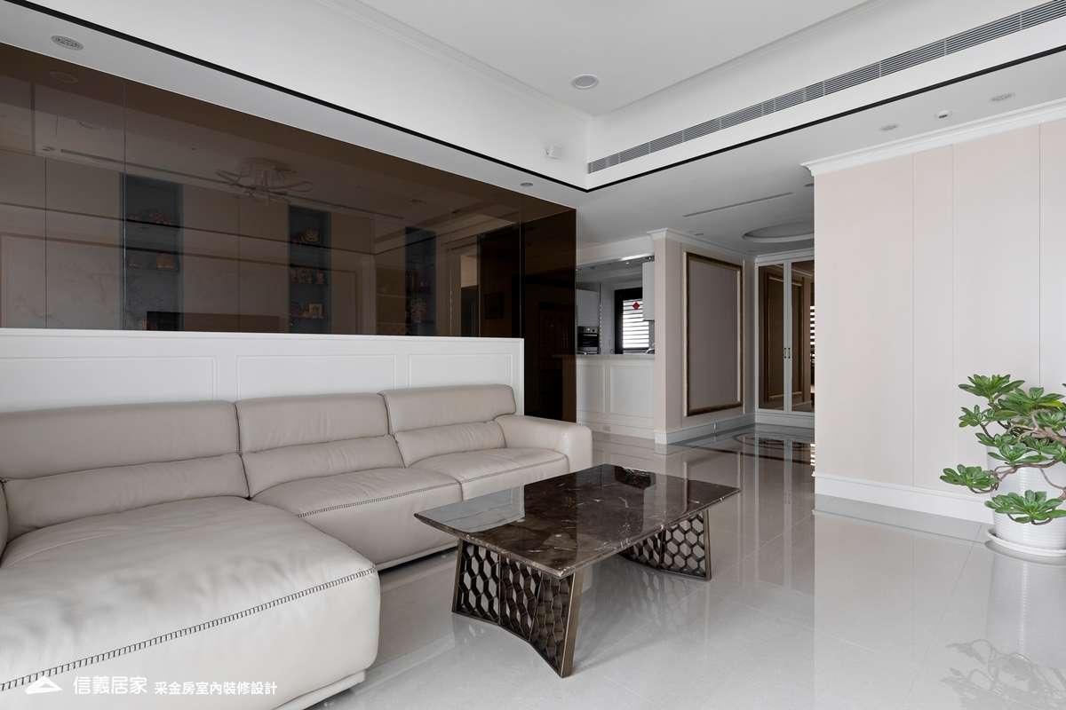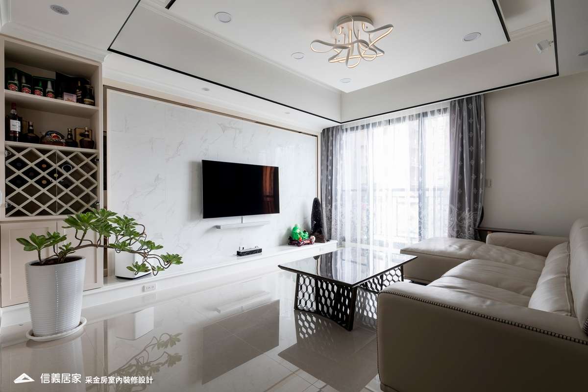 白色客廳室內裝潢設計,包括茶几、電視牆、L型沙發裝潢圖片