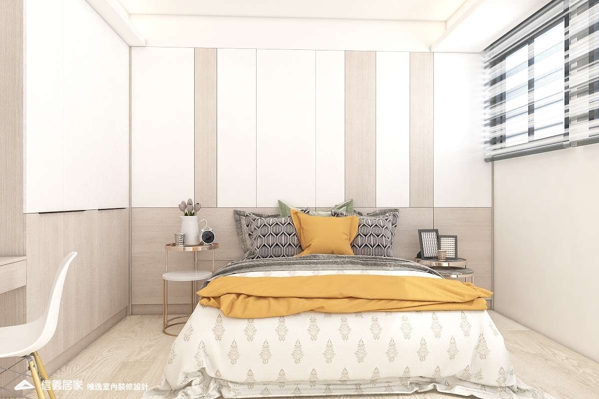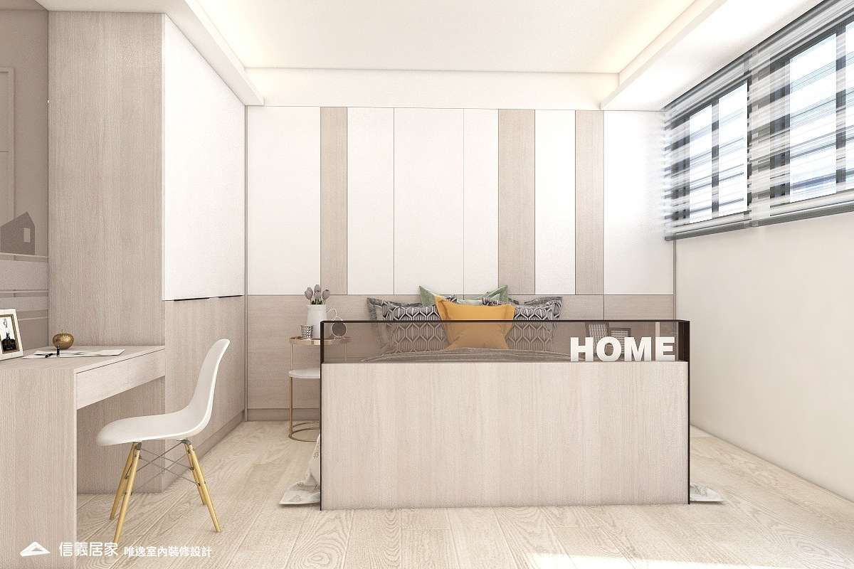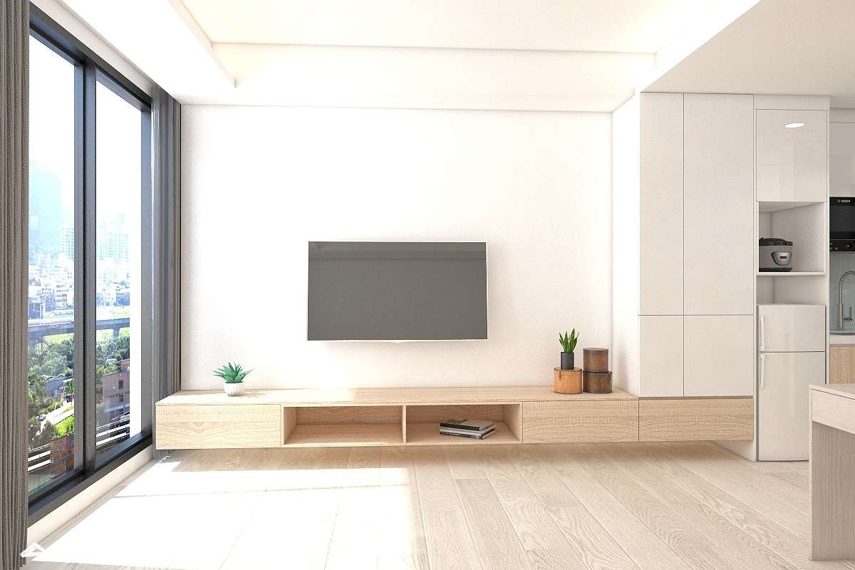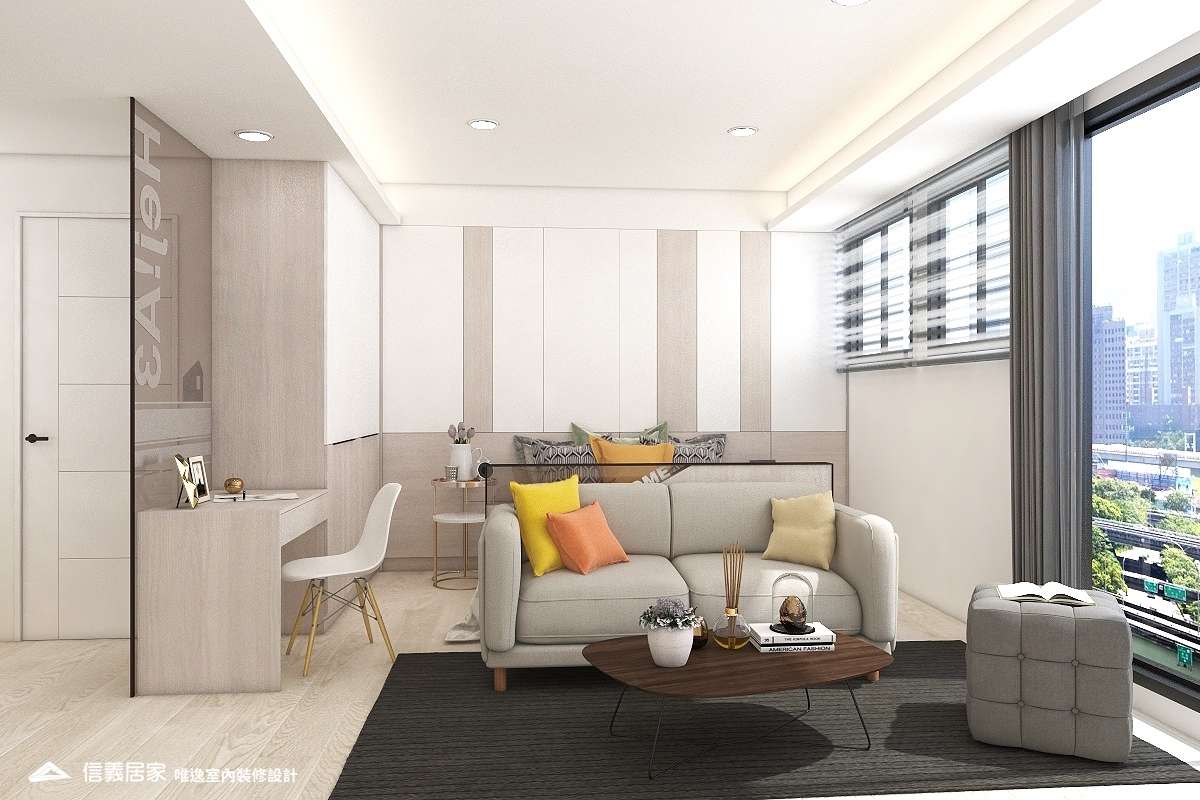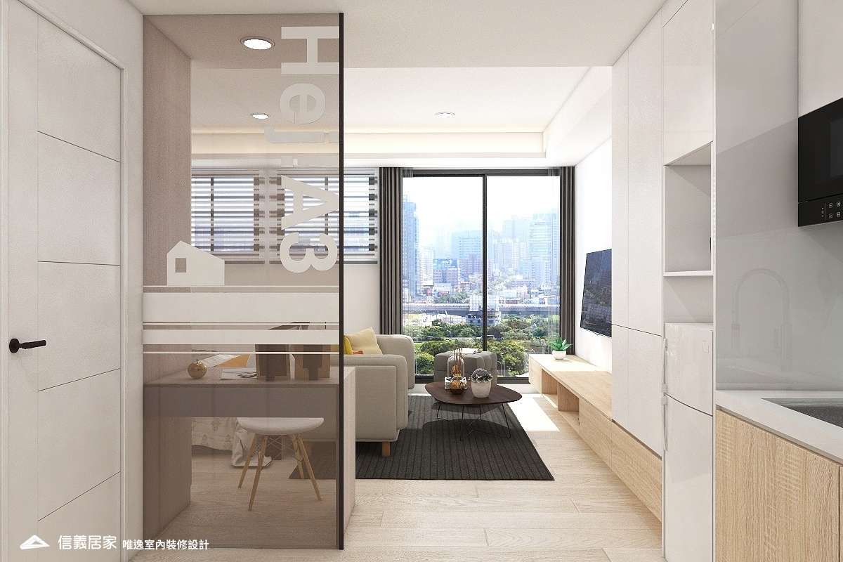 全室以無印白為底佐淺色木地板,還原無垢系居家氛圍。「家」不再是生活想像,是我們一起過的每一個日子。 大面積落地窗映出放鬆紓壓的高樓層景緻,日光穿透擘劃公私領域的茶色玻璃,照耀著平淡卻深刻的幸福時刻。一體成形的櫃體為小坪數增添不少收納空間,沙發及地毯軟件烘托了舒心維度,綴上些許綠意,鋪陳滿滿好感敞朗。