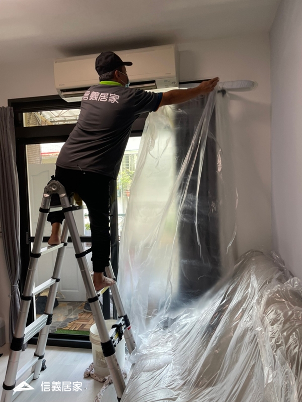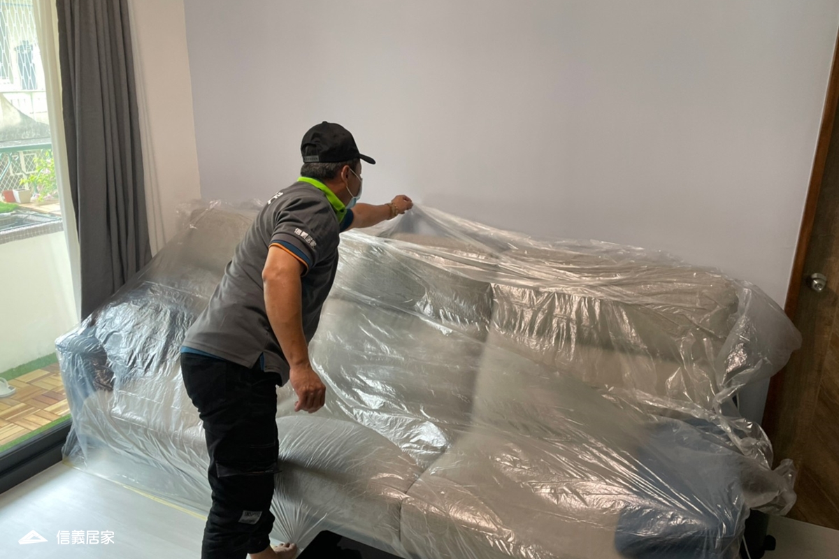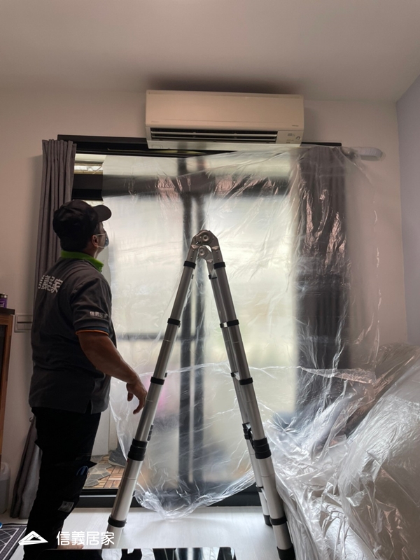 首先移動桌椅,細心地用塑膠保護套包覆沙發跟窗簾,在冷氣的下方舖上舊衣吸水,一方面不會弄髒地板,一方面避免地面濕滑發生意外。