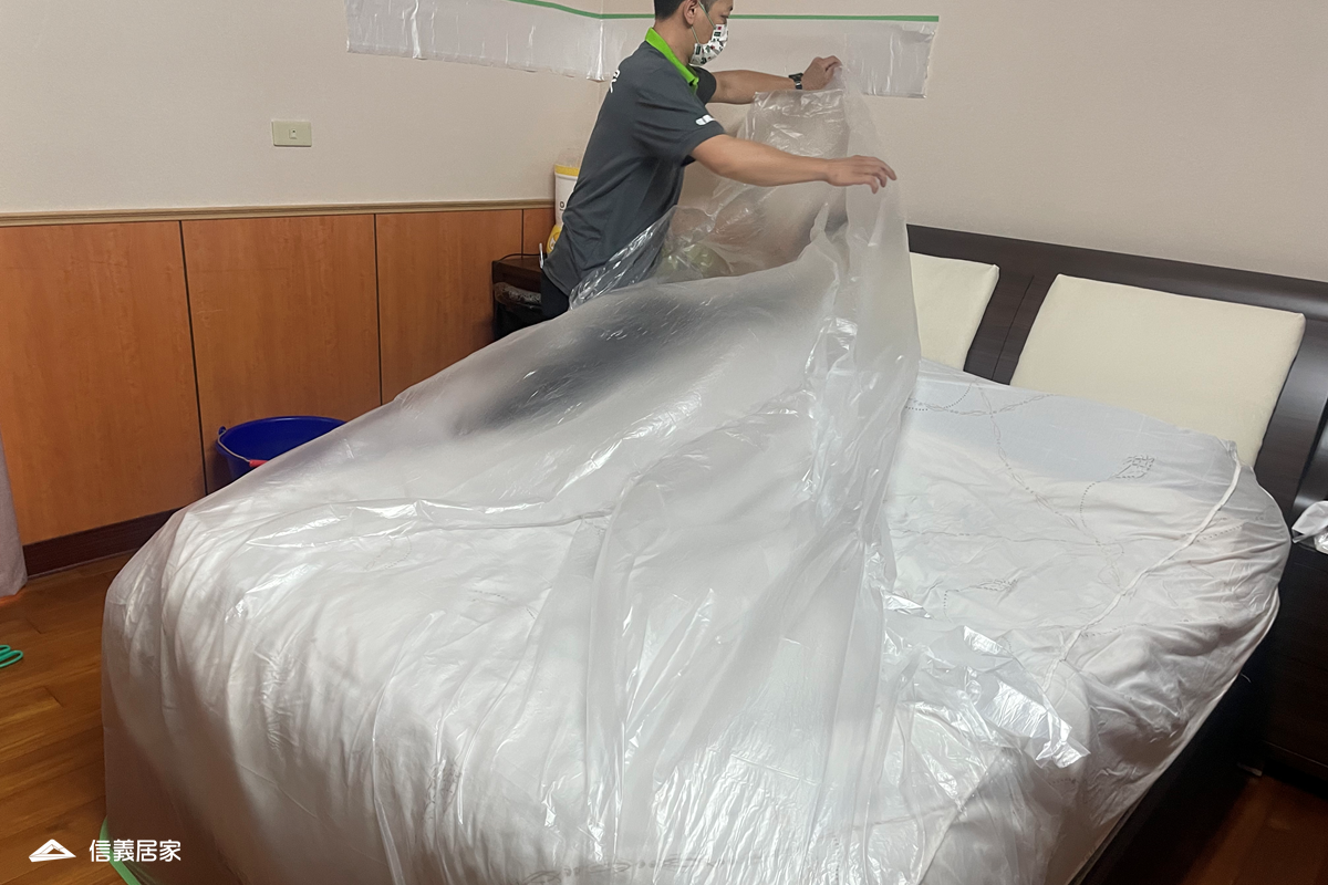 把師傅帶到須清洗冷氣的房間後,只見師傅仔細觀察現場環境,拿出剪刀及透明塑膠布,仔細地將房間內部的家具及床墊都蓋得密不透風,深怕洗冷氣的汙水會噴灑汙染到家具,小心翼翼地保護我家的家具,真的要給師傅拍拍手!