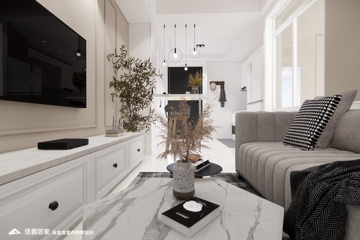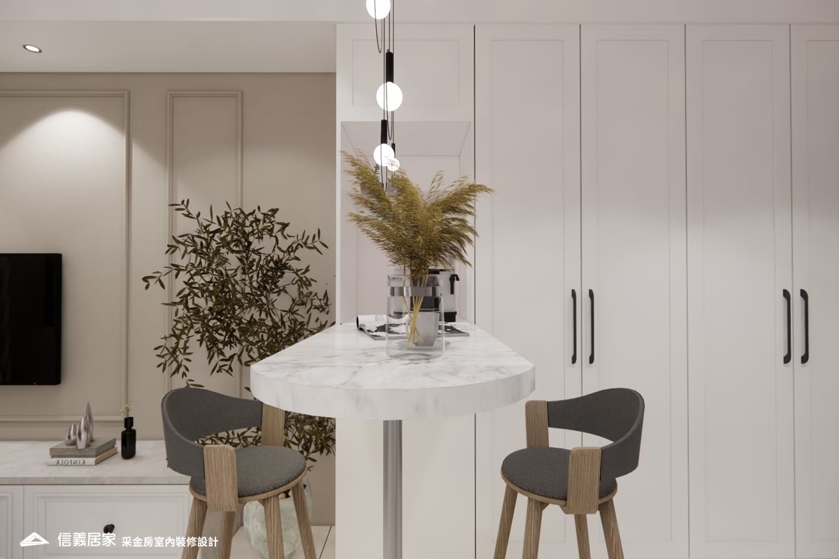 雙開式玻璃門,在必要時開闔,創造彈性且靈活的場域使用,也保留視野的通透性。在公領域規劃了開放式的客廳、餐廳、廚房。私領域則規劃了主臥及更衣間,以化妝台兼書桌做區隔。大量的收納機能則隱藏在牆櫃之中,幻化成無形,然後選擇女屋主喜愛的奶茶大地色系及白色線板,搭配局部大理石檯面,以及餐廳吧台及床頭櫃上的垂吊式造型燈具,營造有質感的輕美式風格。