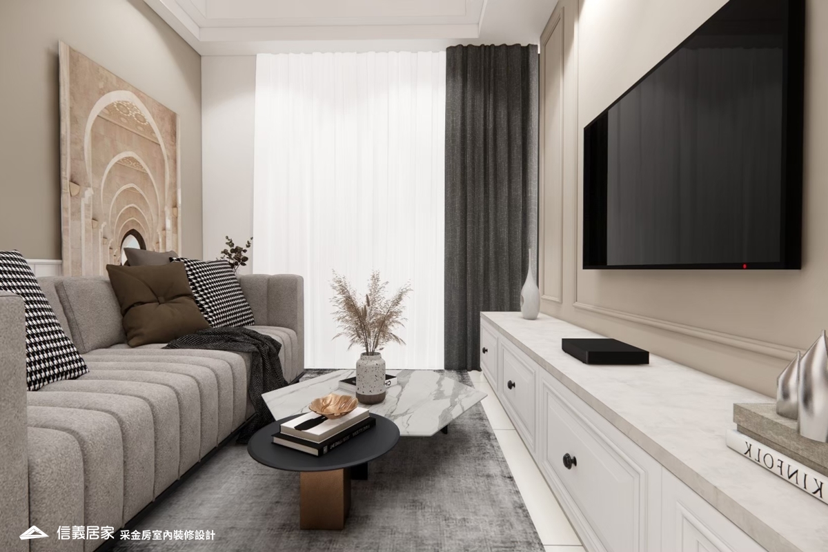 雖全室以白色為基調,但在重要視覺牆上,選擇女主人喜歡的奶茶色聚焦,為原本冷調空間帶來溫暖感,搭配軟件,如布沙發及地毯更顯二人世界的溫馨感。