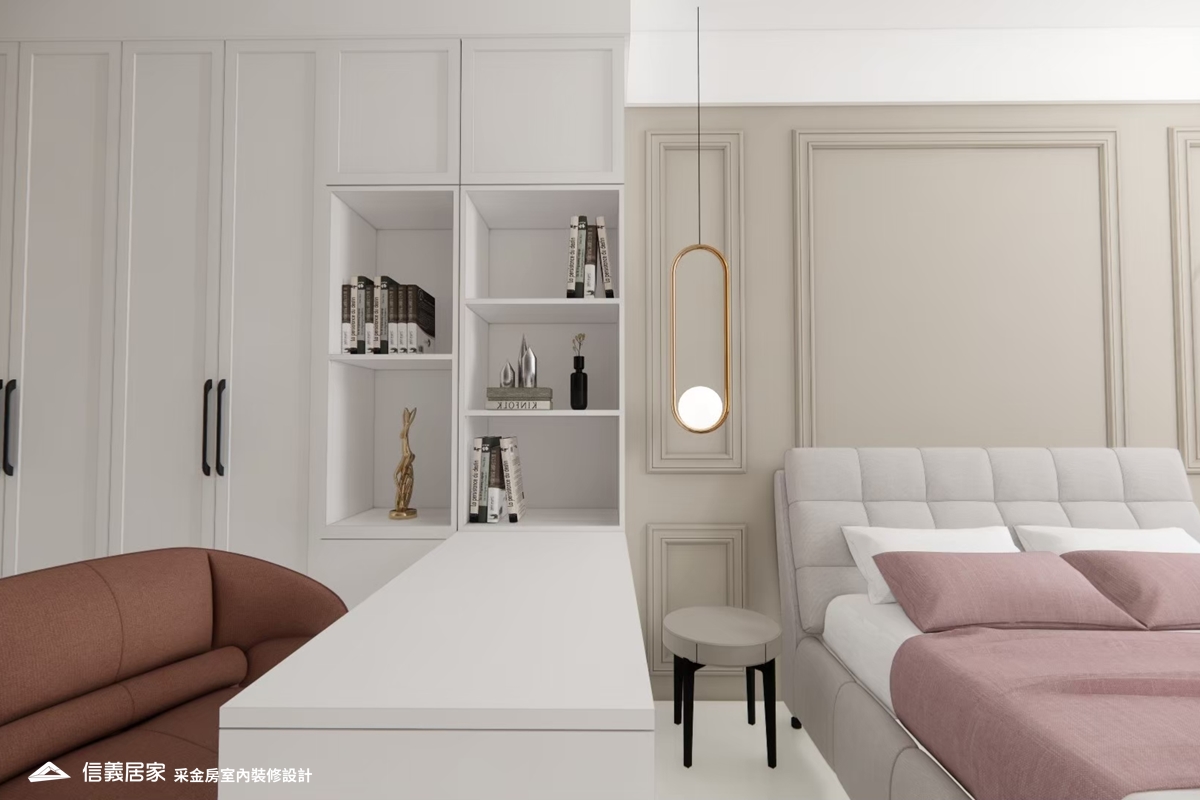 運用色調為空間界定,如奶茶色線板床頭為睡寢區,白色櫃體區域為更衣場域,並運用化妝台兼書桌做為界線,讓視野穿透,使用機能更靈活。
