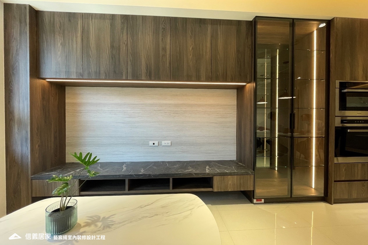 屋主回到家後,會有行李箱、外套等物品擺放需求,設計師用系統櫃的設計,可完美收納屋主旅行回家的相關物品。在鞋櫃上方配置奈米水離子發生器,可殺菌除臭,並搭配好收納的國際牌旋轉鞋架與方便穿脫鞋穿鞋櫃椅。整面牆的頂天系統櫃連結玄關的收納櫃與餐廳的電器櫃、收納櫃,並接續客廳的展示櫃、電視櫃,將大量的收納需求統整在同一個平面,從玄關進入,一路到餐廳、客廳,將收納藏於無形,並有效優化動線,塑造出如同飯店一樣的優雅俐落感。