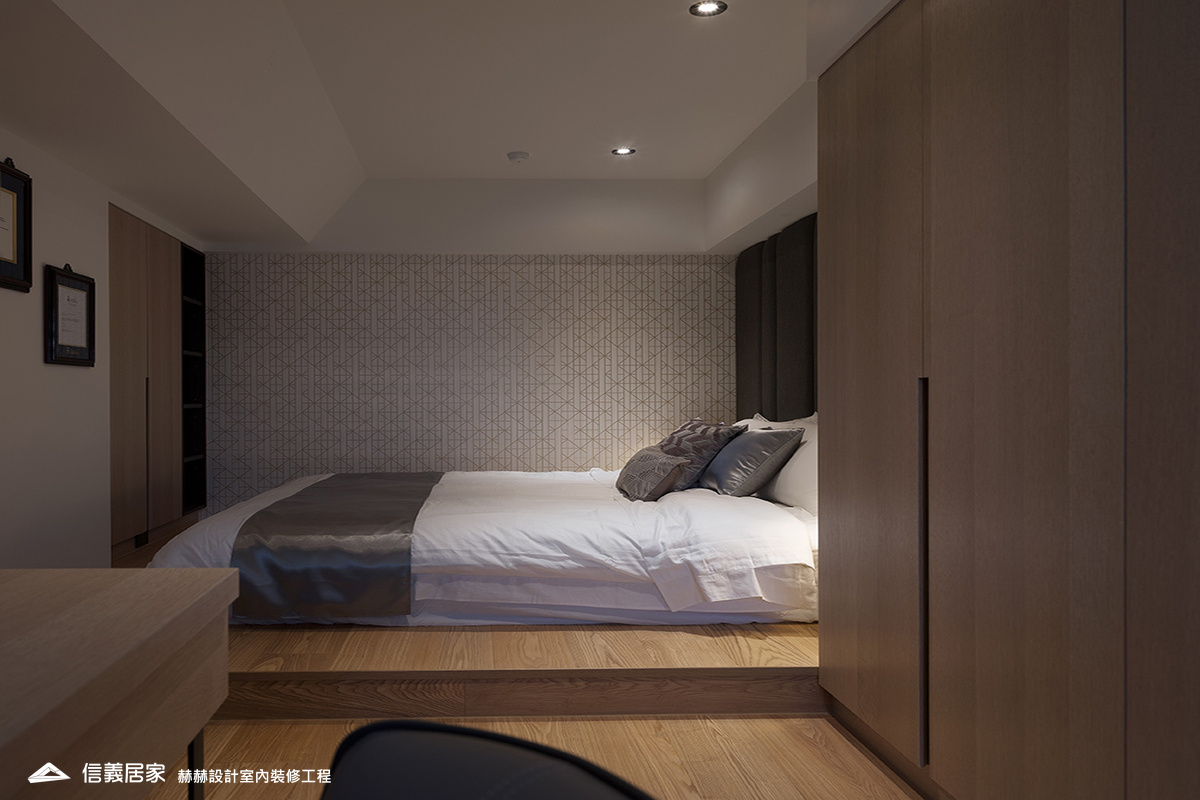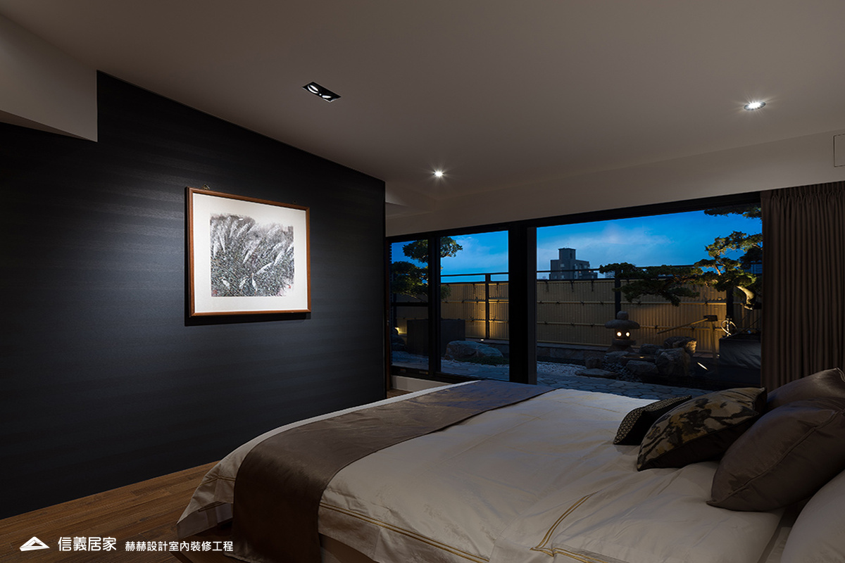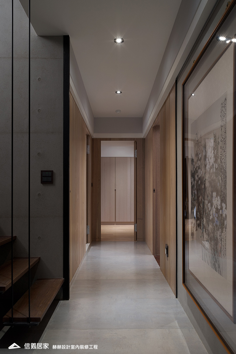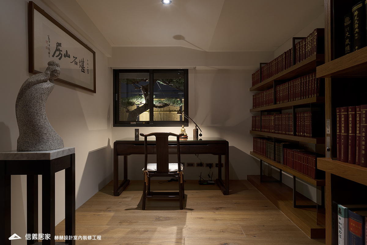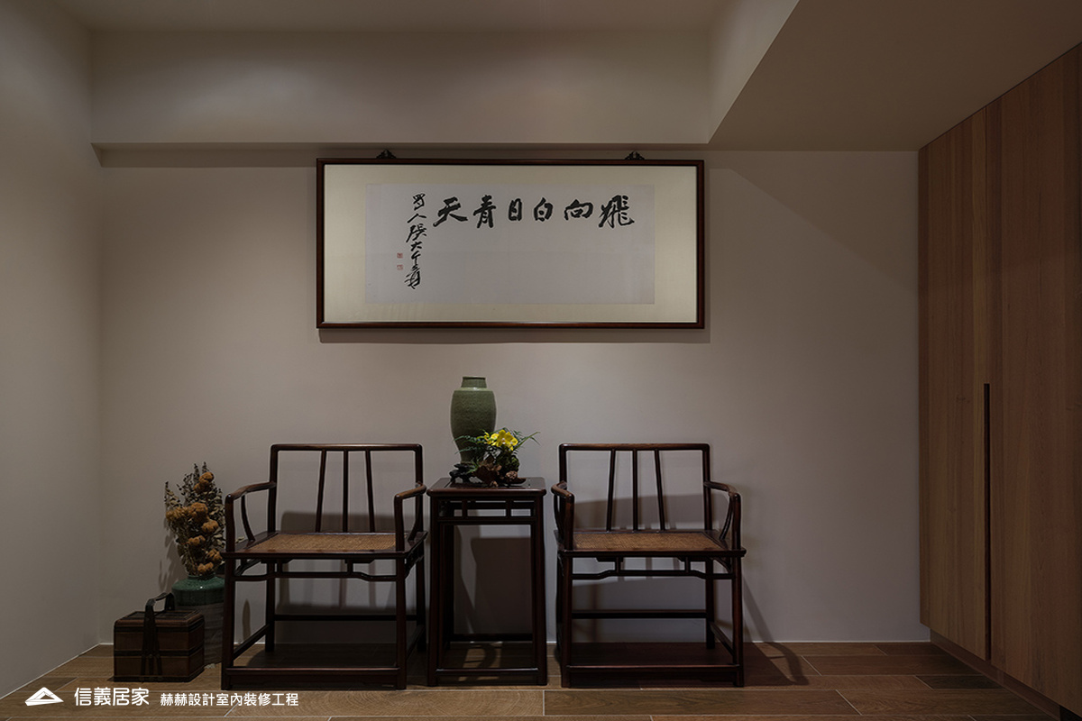 選用屋主喜好的中式元素,包括燈光、家具與建材的搭配。增加展示古董與字畫的收納空間,設置隱藏式與展示型收納櫃。