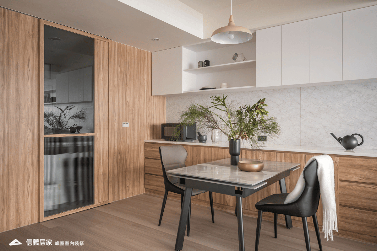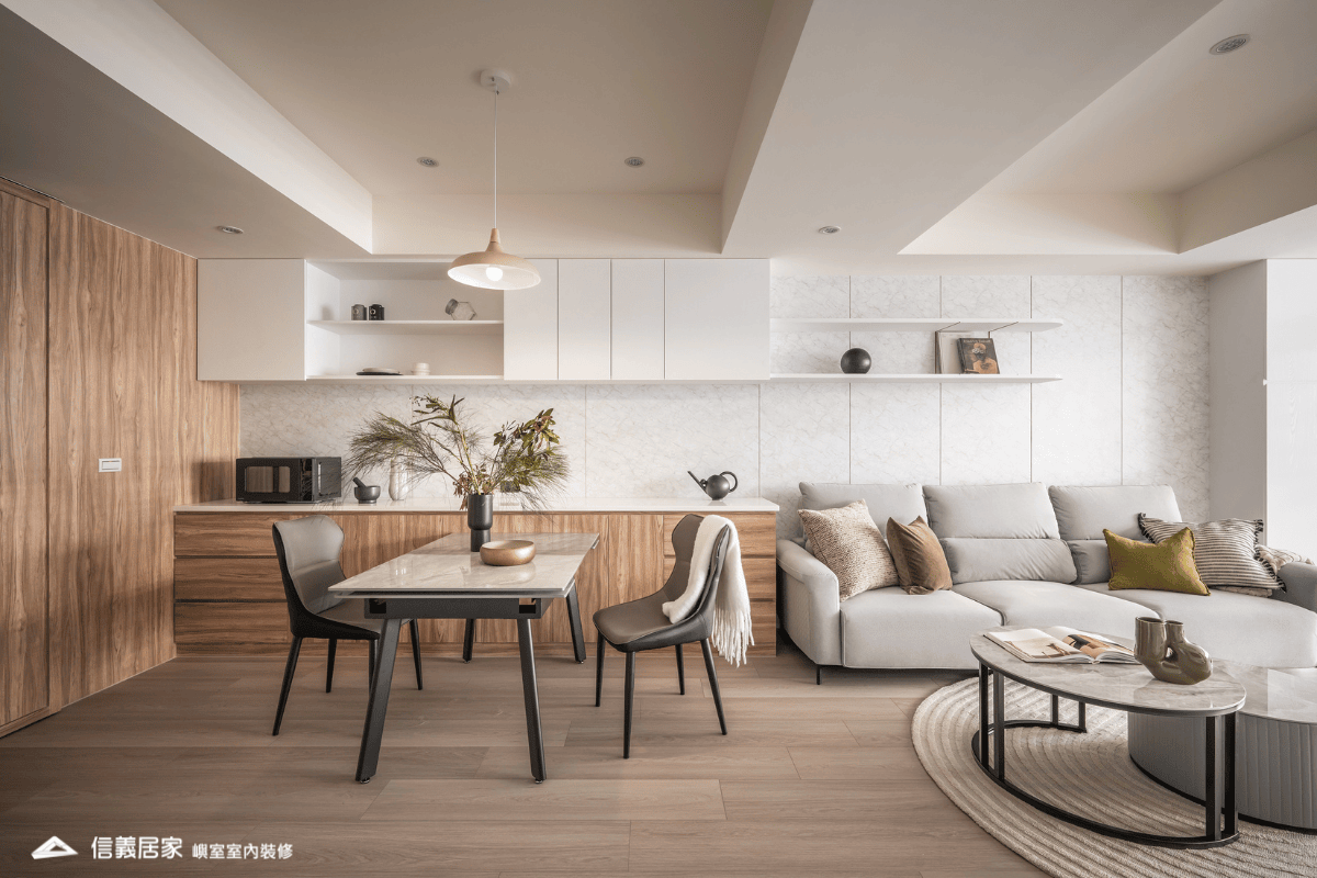 廚房與客餐廳重新劃分,拆除不必要的高矮吧檯與雜物櫃,讓空間更開闊。透過適當的活動家具與可變更尺寸的設計,避免大型家具影響動線與視覺效果。