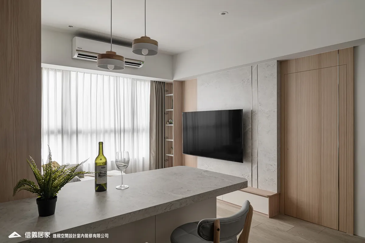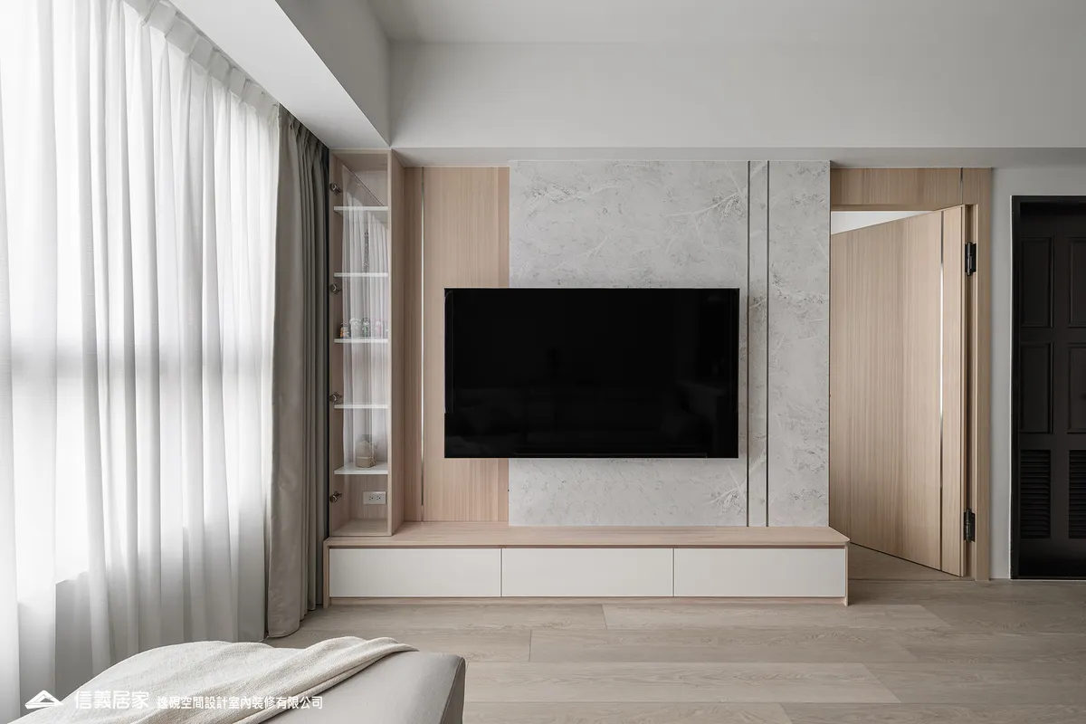 這個小而美的家融合了石紋、木質和金屬等元素,呈現出現代和溫馨感共存的設計風格。電視牆一路延伸至主臥房門,鍍鈦飾條俐落點綴其中,營造出大器且一貫的和諧氛圍;屋主挑選的牆面跳色溫潤舒心,也為空間增添了幾分活躍。