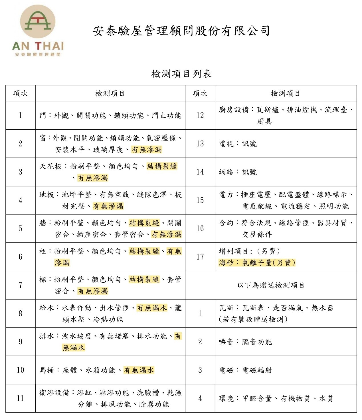 原則上新成屋與中古屋在檢驗項目來說大同小異,中古屋會更注意有關「瑕疵擔保責任」的缺失。以下圖表為安泰驗屋的檢測項目表,有用標示的為中古屋更需注意的項目。另外像是瓦斯是否漏氣、電磁輻射,以及環境檢測,也會是中古屋驗屋相對重要的項目。