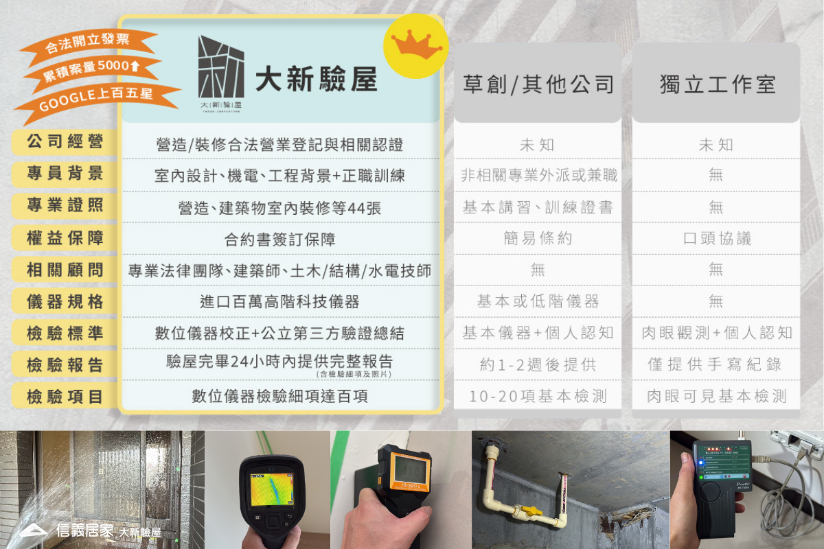 相較於自行驗屋,專業驗屋團隊可提供更全面的服務流程,包括現場檢測、紀錄彙整、缺失分析與後續追蹤協助。以大新驗屋為例,我們會依實際屋況使用包含熱影像儀、水平儀、含水率檢測器、空氣品質分析儀、電力檢測工具(如相位測試器、漏電斷路器)與輻射檢測器等設備,針對建築結構、水電配置與環境品質等項目進行數據化檢查與圖像紀錄。