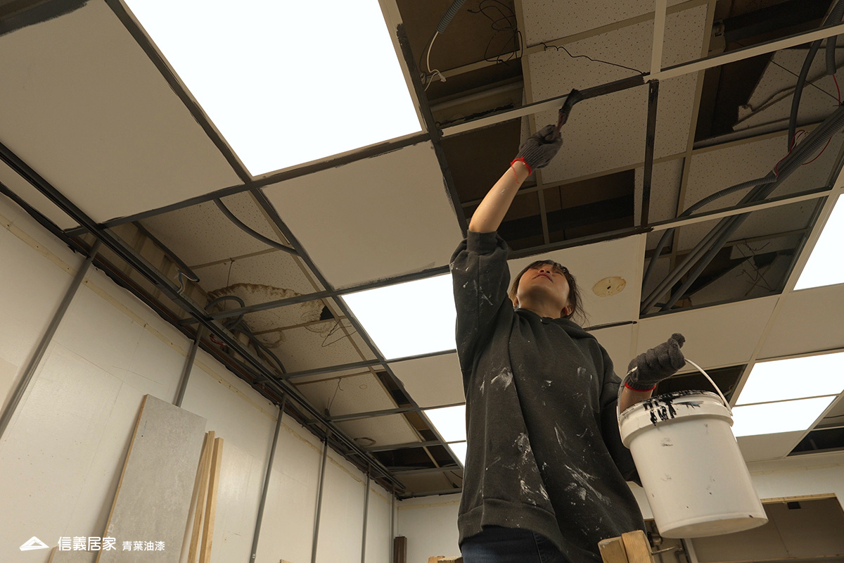 甚至連天花板的輕鋼架與主要門框都不放過,親手刷上彩鋼漆,從地面到天花板,每一處轉角都精心處理,使空間色調更加俐落一致。