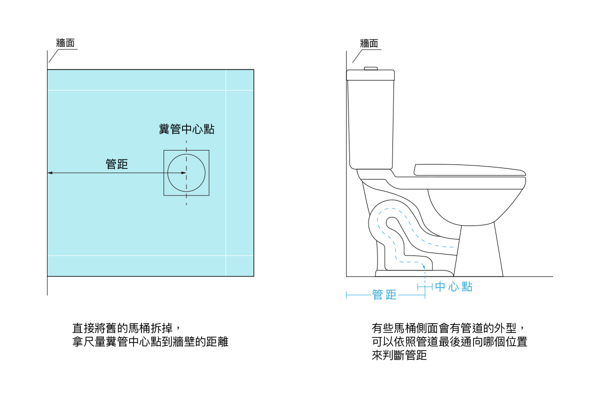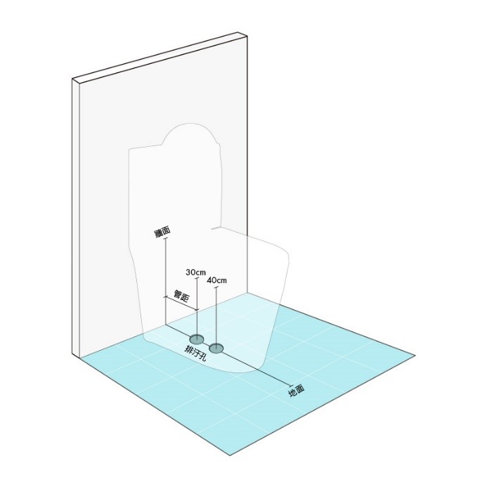 管距為排汙孔與完成牆面(含磁磚)之間的距離,臺灣浴室多採用與美國日本同規格,常用管距為30cm,傳統管距則另有40cm。其他少數採歐洲規格18-22cm或牆面排污。因此選購馬桶時,必須考量管距避免後續無法安裝。CAESAR凱撒衛浴馬桶以30/40cm管距為主,同時亦有歐規管距馬桶供選購。有換裝馬桶需求,管距測量請參考下方圖示說明: