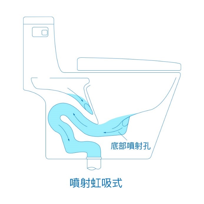 • 其他常見用詞1:噴射虹吸式,噴射漩渦式,噴射龍捲式等,其噴射二字為馬桶碗面底部增設之沖水孔,於沖水時射出水柱強化沖水排污效能(如圖)。漩渦與龍捲等用詞,為洗淨馬桶碗面水流之形式。