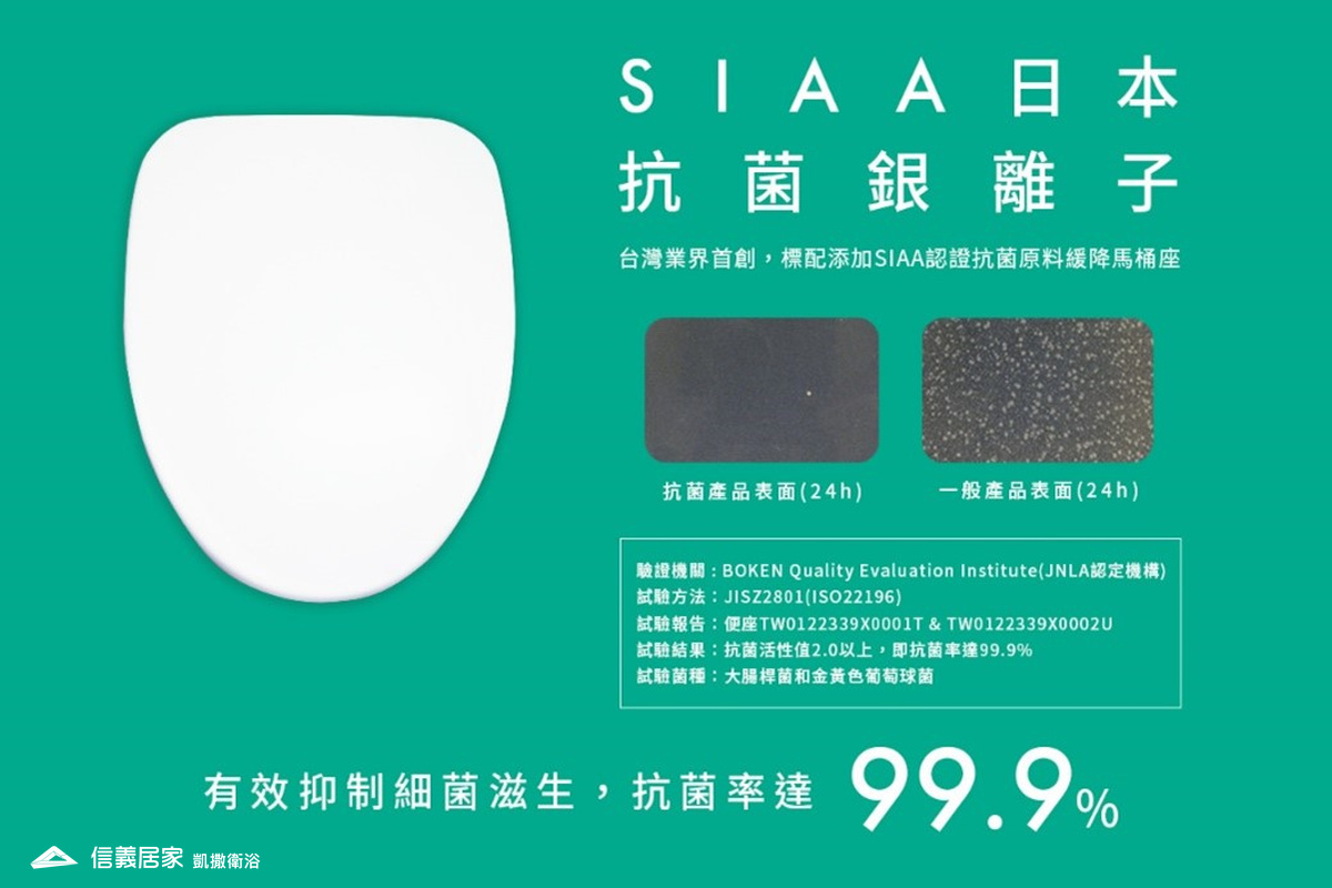 SIAA為日本抗菌製品技術協議會,由日本抗菌防霉抗病毒加工製品工廠及檢測機構組成的專業團體 (https://www.kohkin.net/),為日本品牌首選抗菌認證機構。CAESAR凱撒衛浴為台灣首間在一般馬桶坐墊上採用SIAA抗菌原料的衛浴品牌,經實驗認證,可抑制細菌滋生達99%,讓衛浴設備更乾淨。