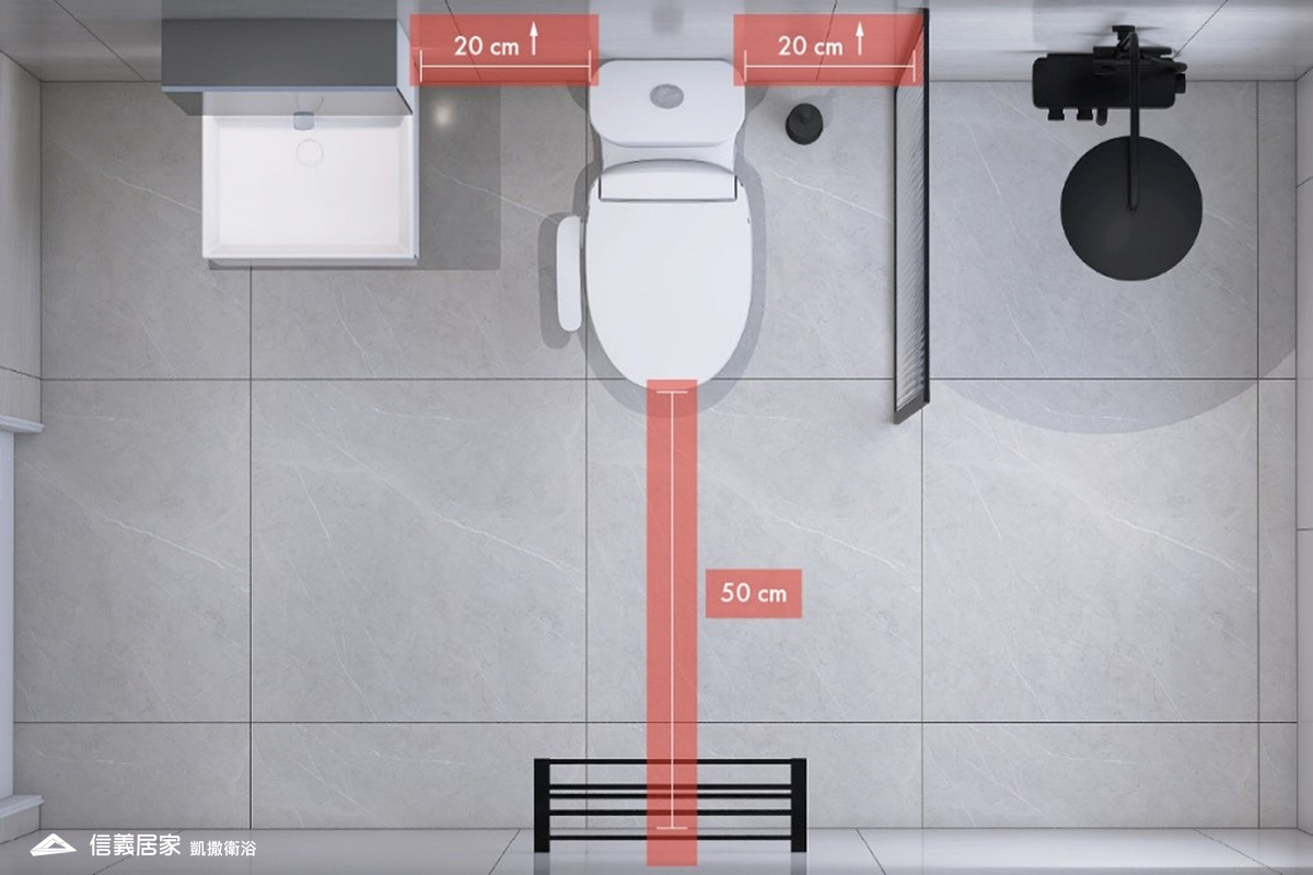 想要擁有舒適的如廁空間,馬桶尺寸也非常重要,安裝後兩側建議保留15公分以上淨空間,以方便維修,前方預留50公分方便使用者穿脫衣物,馬桶後方預留插座,供溫水洗淨便座或其他電器使用。馬桶水箱後方不緊靠牆面,預留1~2cm避免地震擠壓。