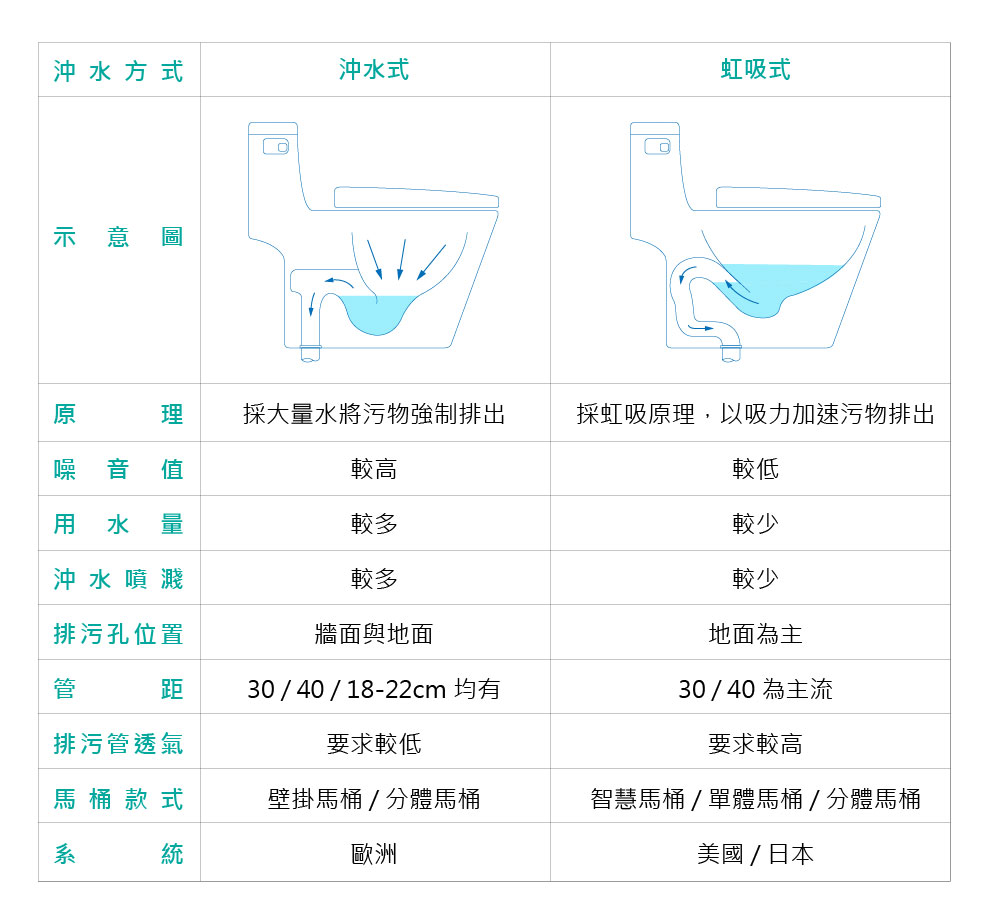 • 虹吸式 siphon:美日馬桶主流規格,為改善噴濺與噪音,同時進一步節省用水,開發之新設計。採用虹吸原理將污物吸走,大幅節省用水量,沖水較安靜,並減少沖水噴濺,為多數新型智慧馬桶與單體馬桶採用。