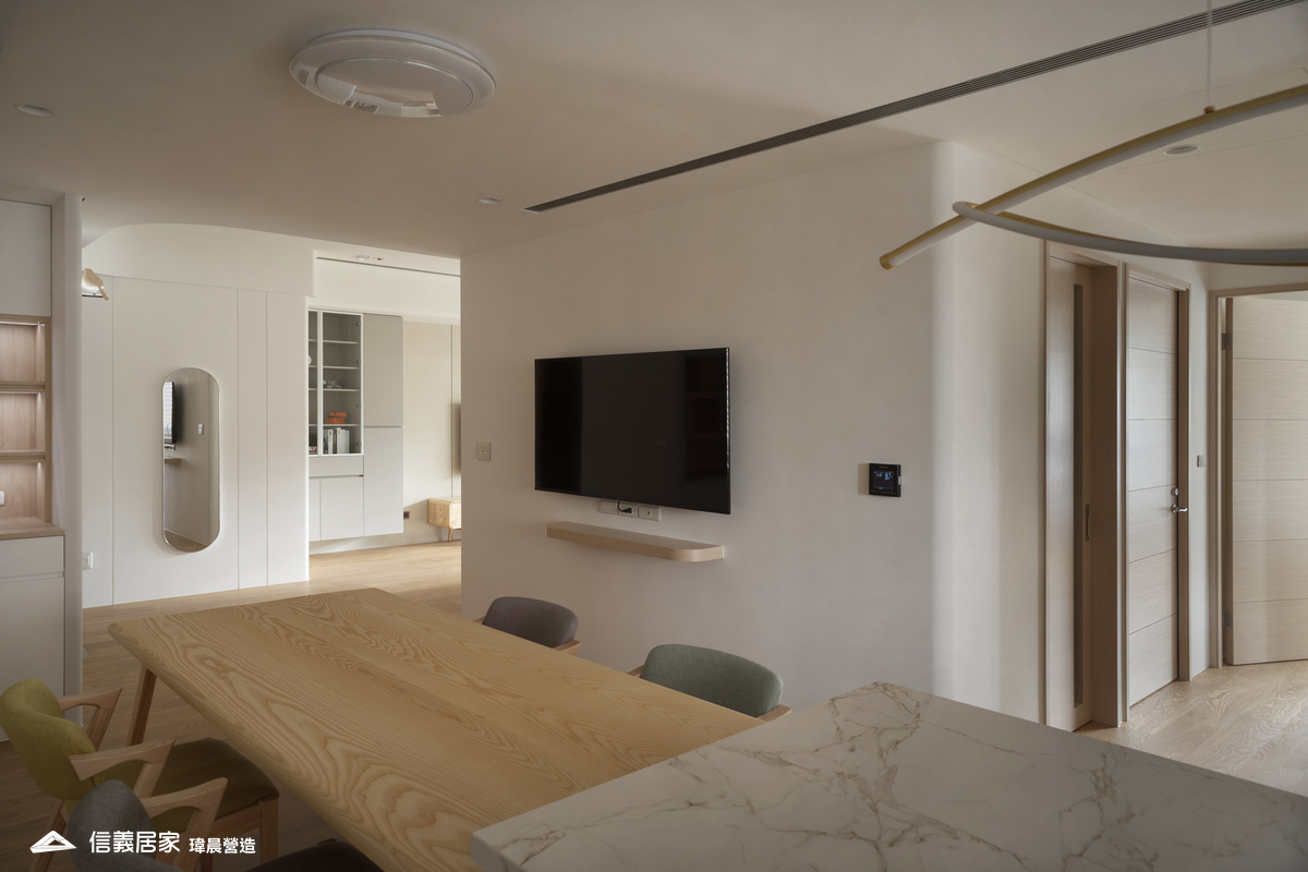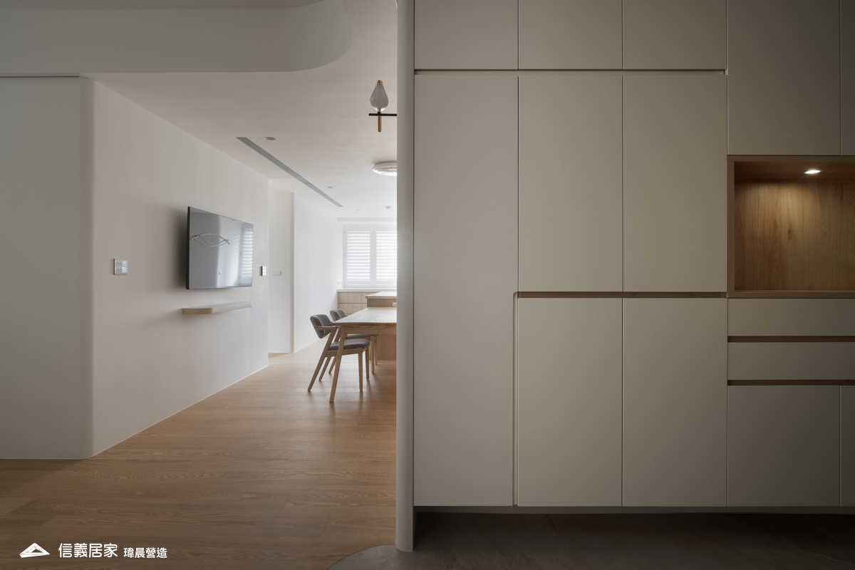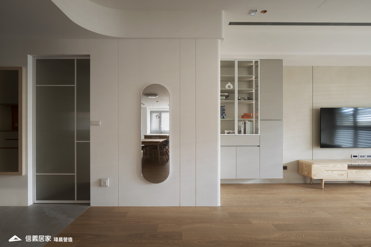 屋主夫妻對生活品味有著細膩追求,我們在空間中大量運用圓弧語彙,包括牆面轉角、櫃體轉角皆以柔順曲線呈現,避免直角帶來的壓迫感,使空間視覺更為流暢柔和。照片中可見展示櫃結合電視牆設計,結構簡潔俐落,同時擔任機能與美感的雙重角色。屋主喜歡的藝術品與紀念小物,在這裡有了專屬舞台。