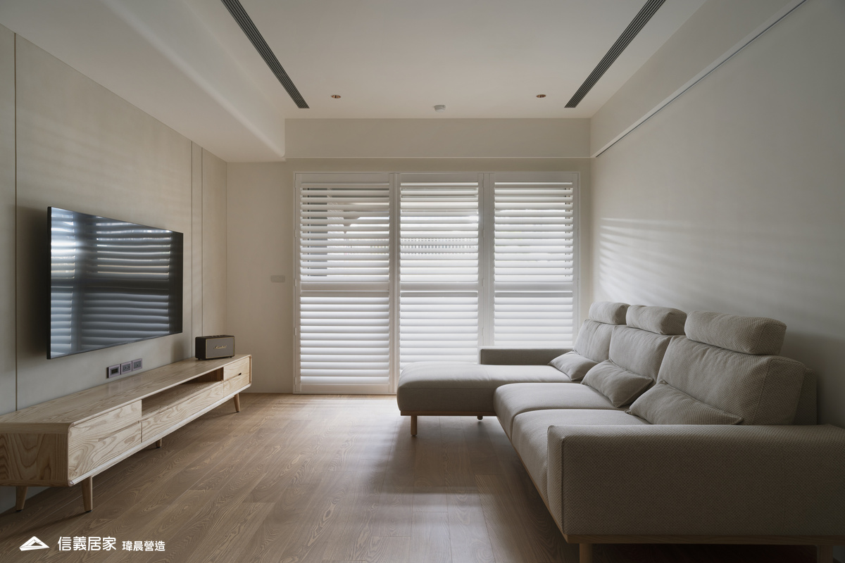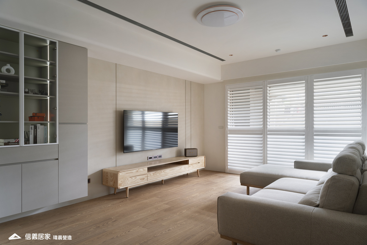 客廳的電視牆設計在規劃階段即與屋主詳細溝通,依照選定的現成電視櫃尺寸,預留插座與走線配置,使電線全數隱藏於櫃體後方,維持整體的整潔與視覺美感。高度與深度經過多次模擬,確保觀影角度舒適,也保留收納與展示的空間。這樣的設計既符合屋主日常使用需求,又保有彈性與實用性。整體空間看似簡單,卻處處藏有貼心思考與周到安排,真正落實「好看、好用、好住」的空間哲學。