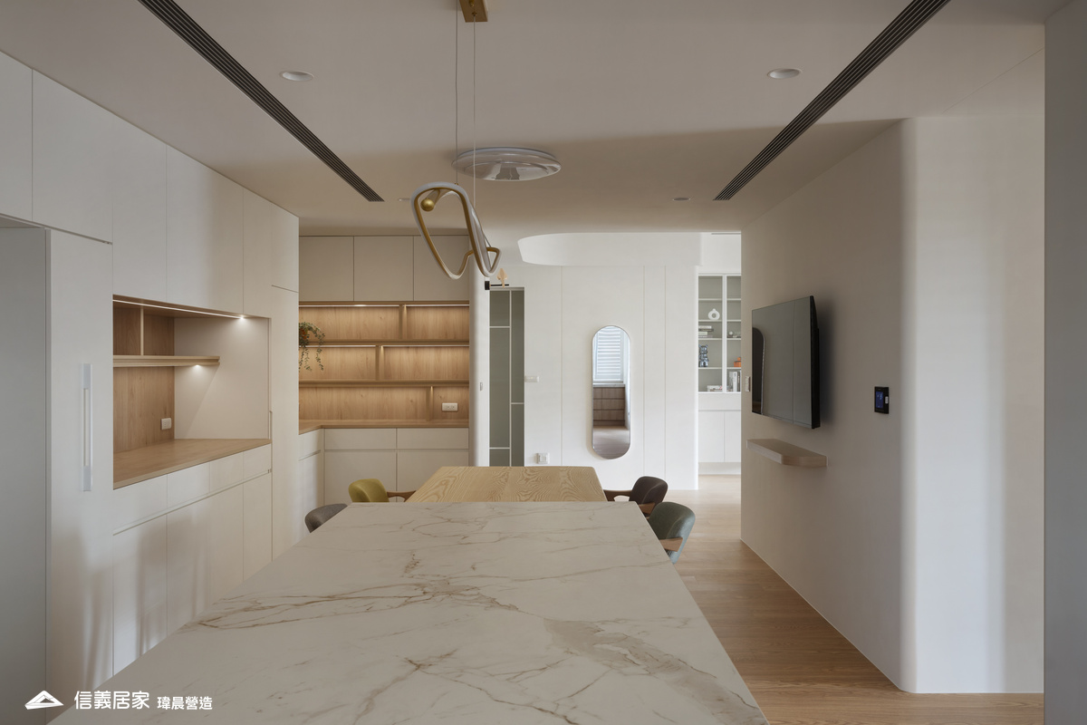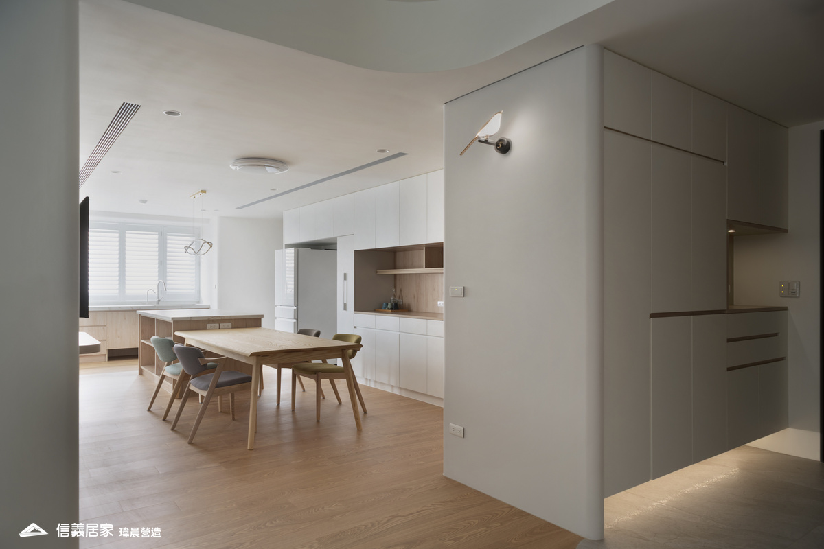 從公共空間轉入餐廳區,空間轉場自然而流暢。屋主希望餐廳不只是吃飯的地方,更是家人互動、孩子閱讀的溫馨角落。因此餐桌選用加大尺寸,搭配整體回型動線設計,圍繞著中島展開,形成一個開放、流動的核心空間。