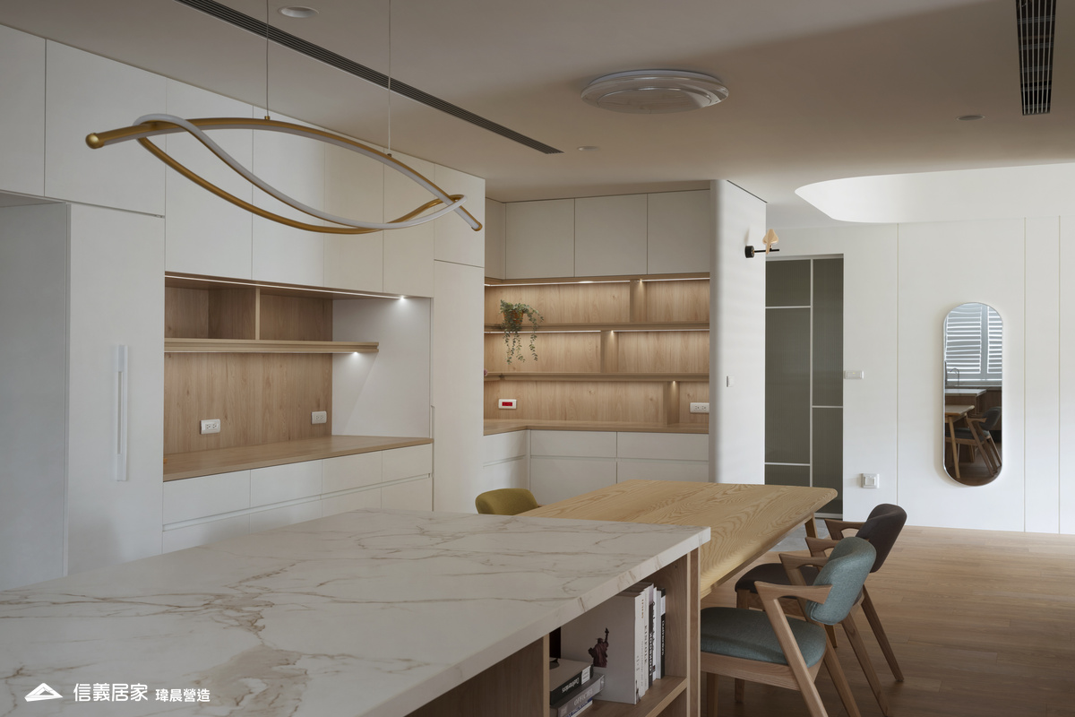 餐廳延伸區域的櫃體設計,融合閱讀、工作與備餐需求,是空間機能與美感的完美結合。整體以溫潤的木紋搭配霧白櫃體,視覺上清爽且具層次。開放層架不僅方便收納書籍、器皿與日常用品,也讓牆面不再單調,隨著屋主使用習慣可自由調整擺放內容。層架內建LED燈條,點亮每一處使用的細節。