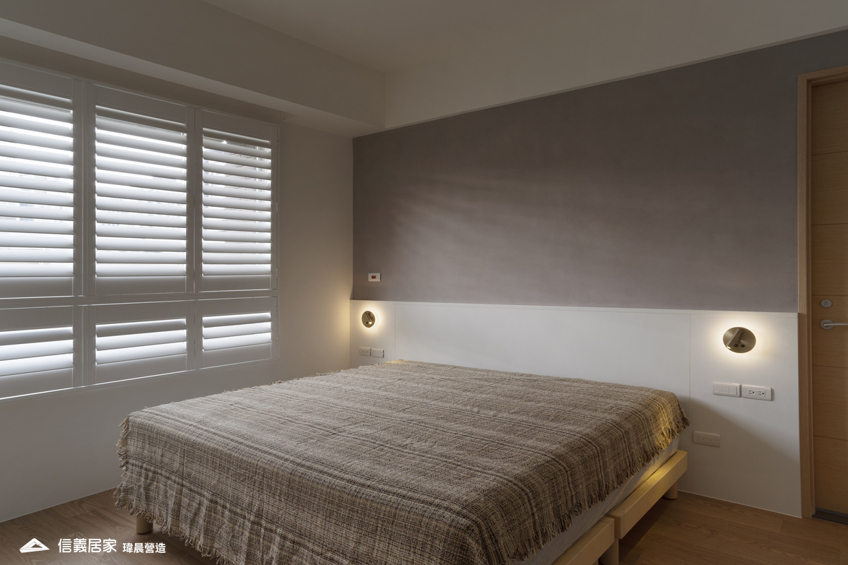 主臥空間延續整體設計,透過色彩與材質的搭配,創造出一個靜謐、沉穩的休息氛圍。床頭牆使用曜石紋理塗料,在燈光照射下散發柔和光澤。此塗料具手作觸感,視覺上兼具溫度與層次,營造飯店式的舒眠氛圍。整體色彩以低飽和的大地色為主軸,讓心情自然沉靜下來。不僅外觀細膩美觀,更有良好的耐用性與質感,是提升主臥空間格調的關鍵設計語言。