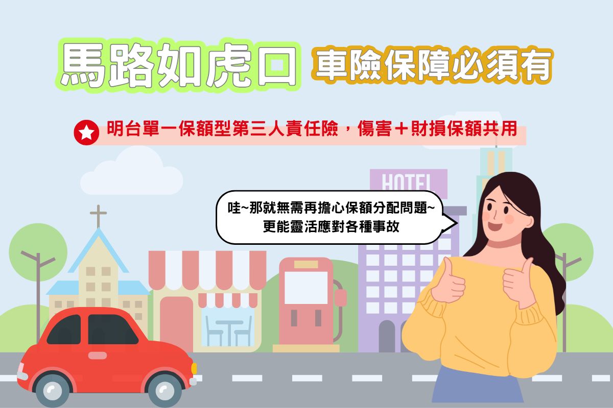 【新式共用保額汽車第三人責任險】一般的第三人責任險的體傷和財損理賠額度是分開計算的, 而第三人責任險(自用)-單一保額型,體傷、財損共用單一保額,不再擔心保不夠。