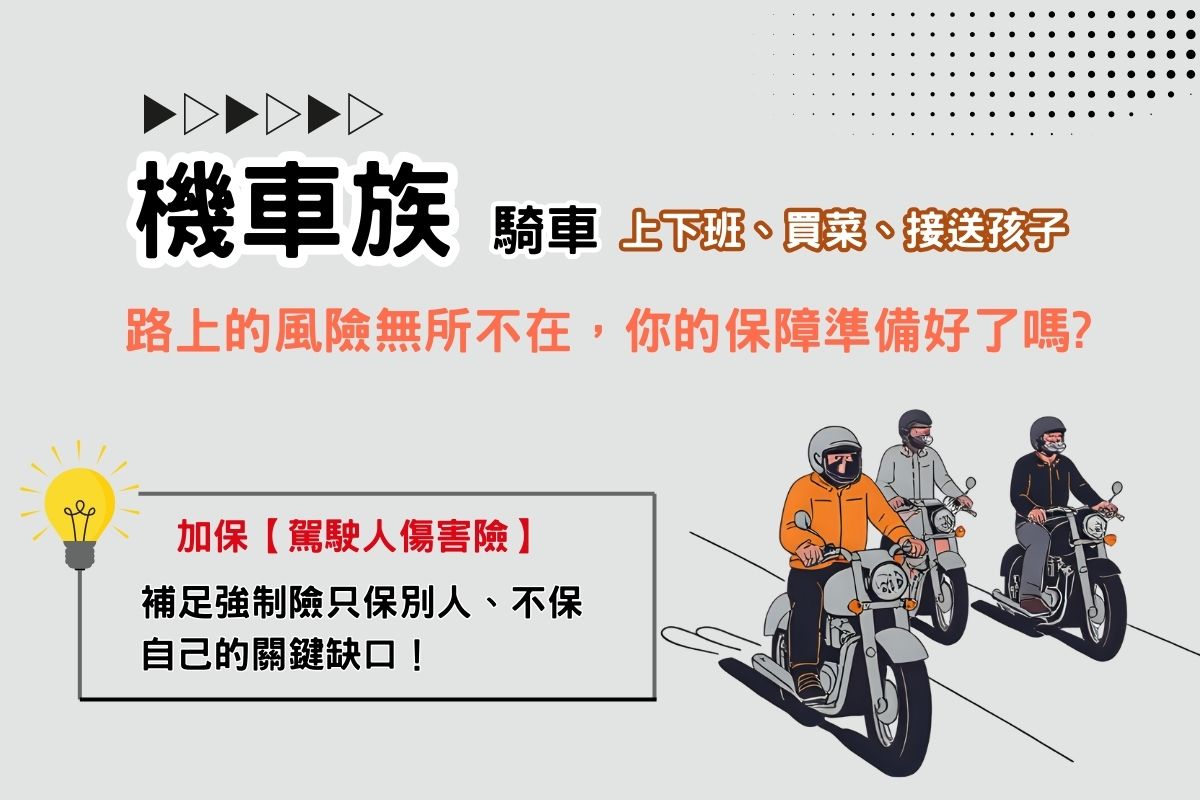 多數人以為強制險就夠了,但其實它只保障「第三人」的人身損害,對方的財損、自己的醫療費,通通不保!機車族建議加保駕駛人傷害險、第三人責任險等保障,才能全面守護上路安全!